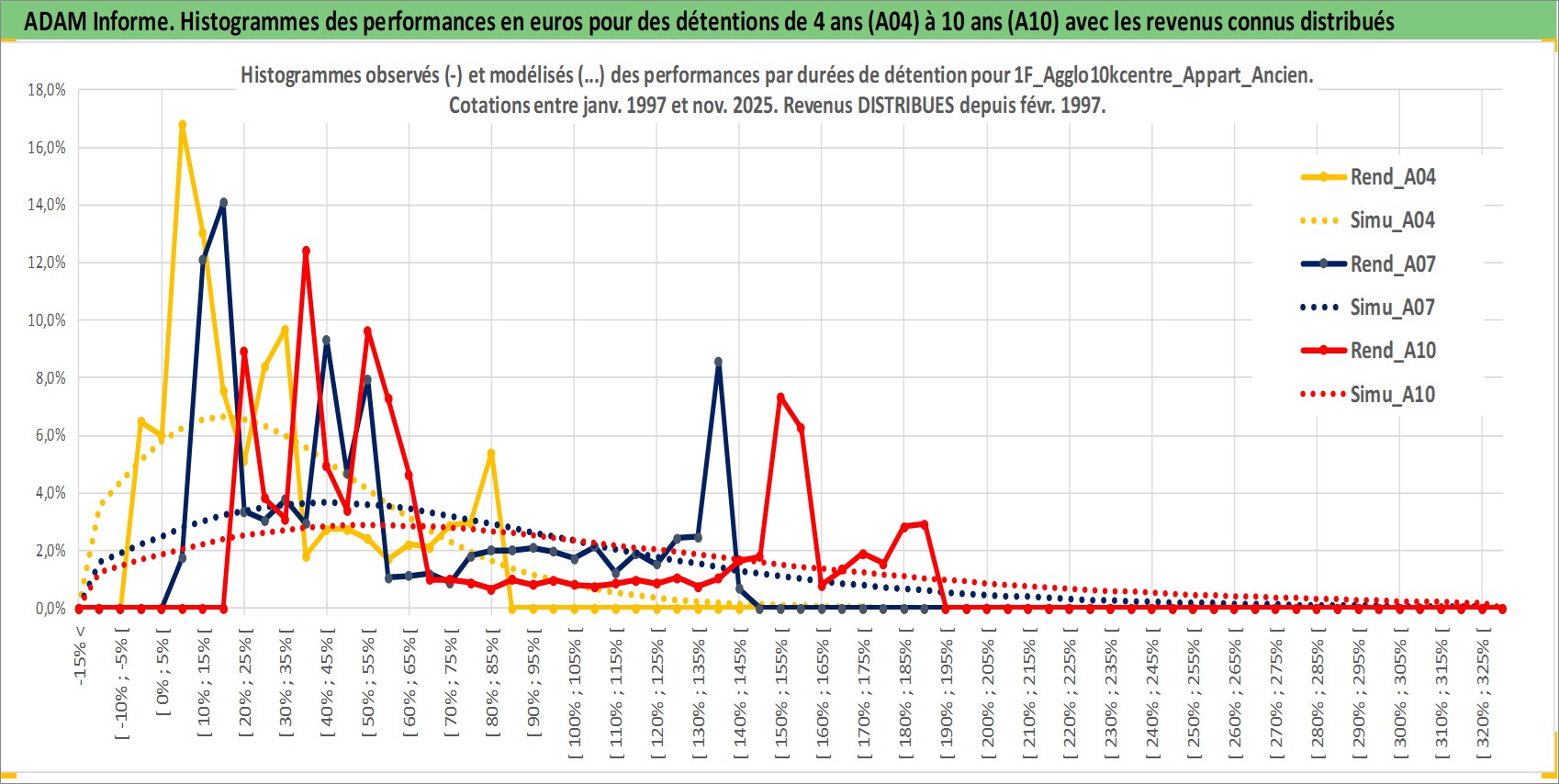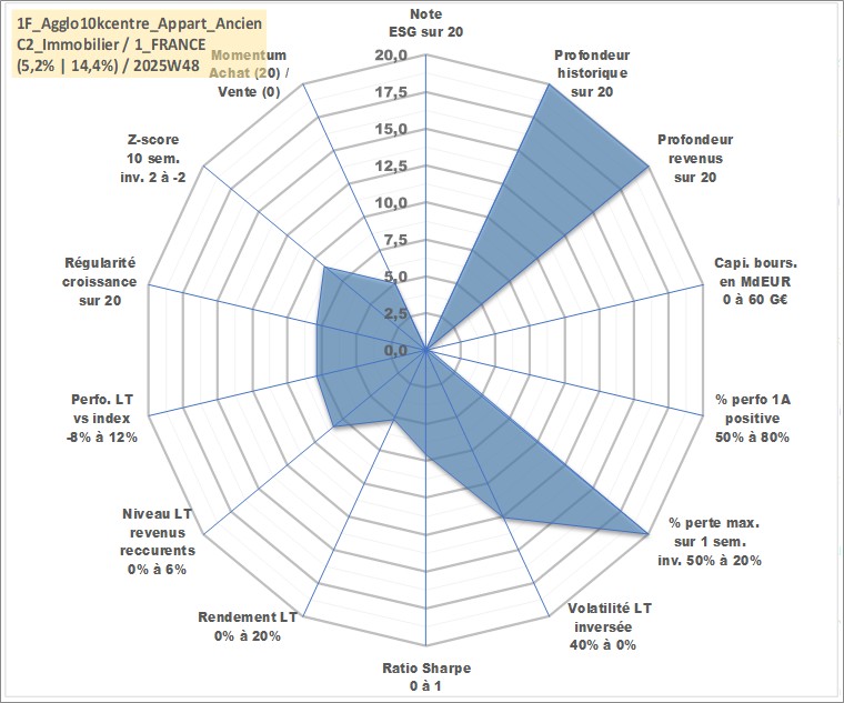 Site dédié aux investisseursPage dédiée sur site financeAnalyse des valorisations hebdomadaires de l'actif 1F_Agglo10kcentre_Appart_Ancien. Cet actif est cote en EUR. Les valorisations couvrent les semaines 1997W01 a 2025W48. Les loyers de cet actif immobilier sont pris egaux a 3,33% annuels de la valeur venale du logement.