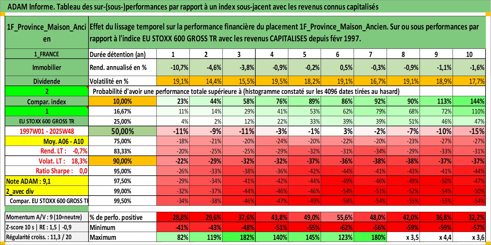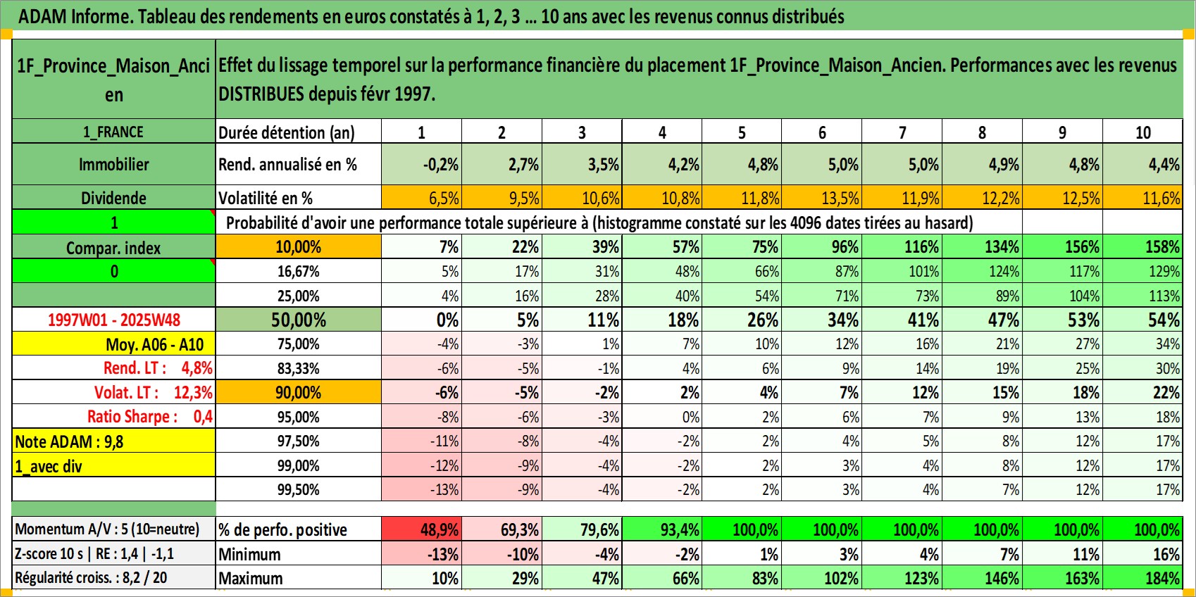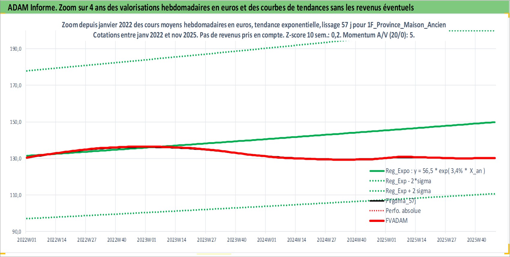 Site dédié aux investisseursPage dédiée sur site financeAnalyse des valorisations hebdomadaires de l'actif 1F_Province_Maison_Ancien. Cet actif est cote en EUR. Les valorisations couvrent les semaines 1997W01 a 2025W48. Les loyers de cet actif immobilier sont pris egaux a 3,33% annuels de la valeur venale du logement.