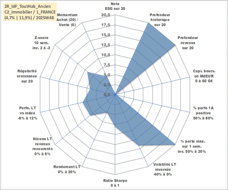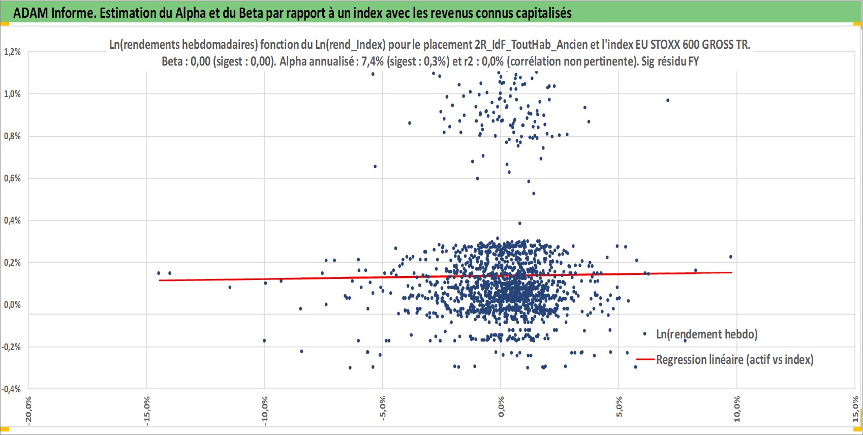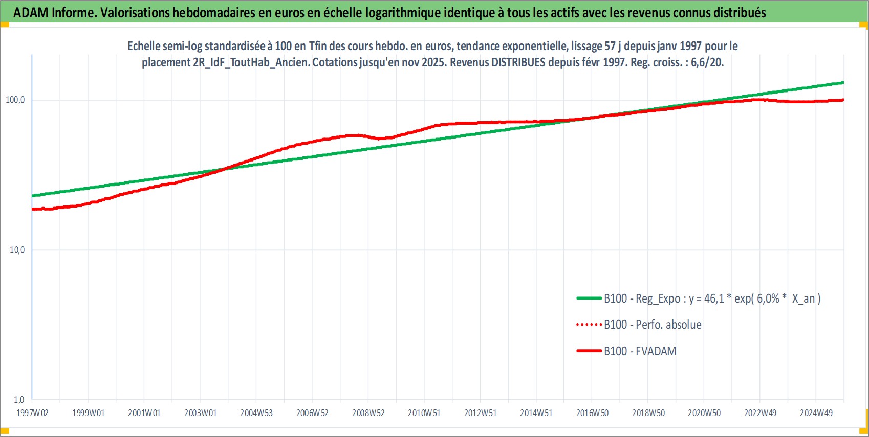 Site dédié aux investisseursPage dédiée sur site financeAnalyse des valorisations hebdomadaires de l'actif 2R_IdF_ToutHab_Ancien. Cet actif est cote en EUR. Les valorisations couvrent les semaines 1997W01 a 2025W48. Les loyers de cet actif immobilier sont pris egaux a 3,33% annuels de la valeur venale du logement.
