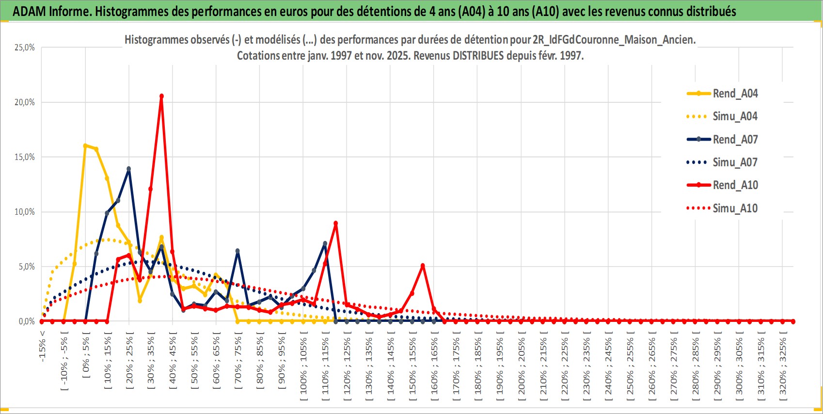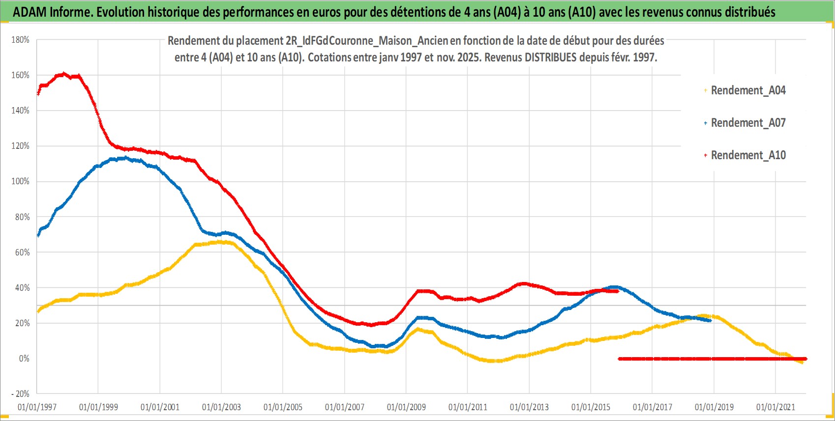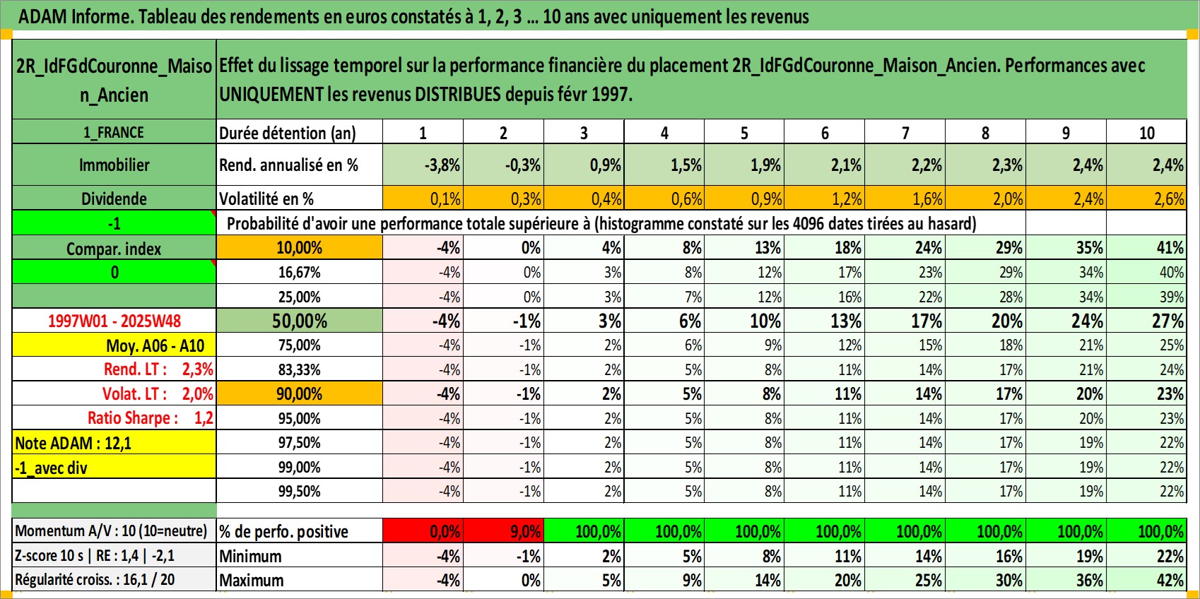 Site dédié aux investisseursPage dédiée sur site financeAnalyse des valorisations hebdomadaires de l'actif 2R_IdFGdCouronne_Maison_Ancien. Cet actif est cote en EUR. Les valorisations couvrent les semaines 1997W01 a 2025W48. Les loyers de cet actif immobilier sont pris egaux a 3,33% annuels de la valeur venale du logement.