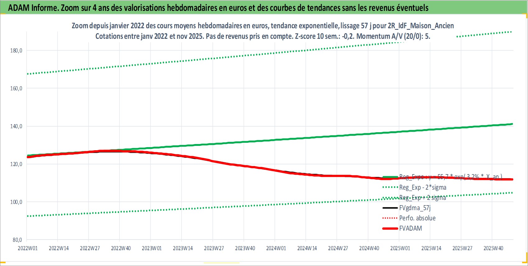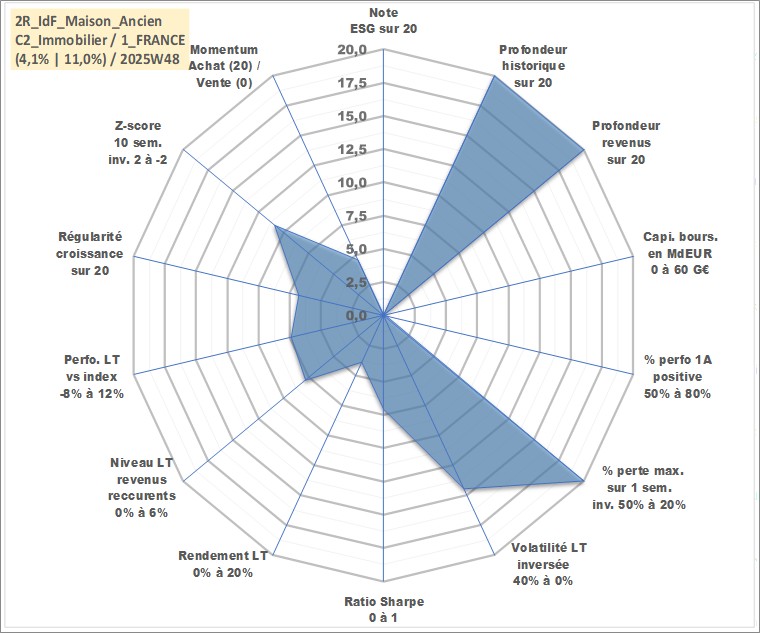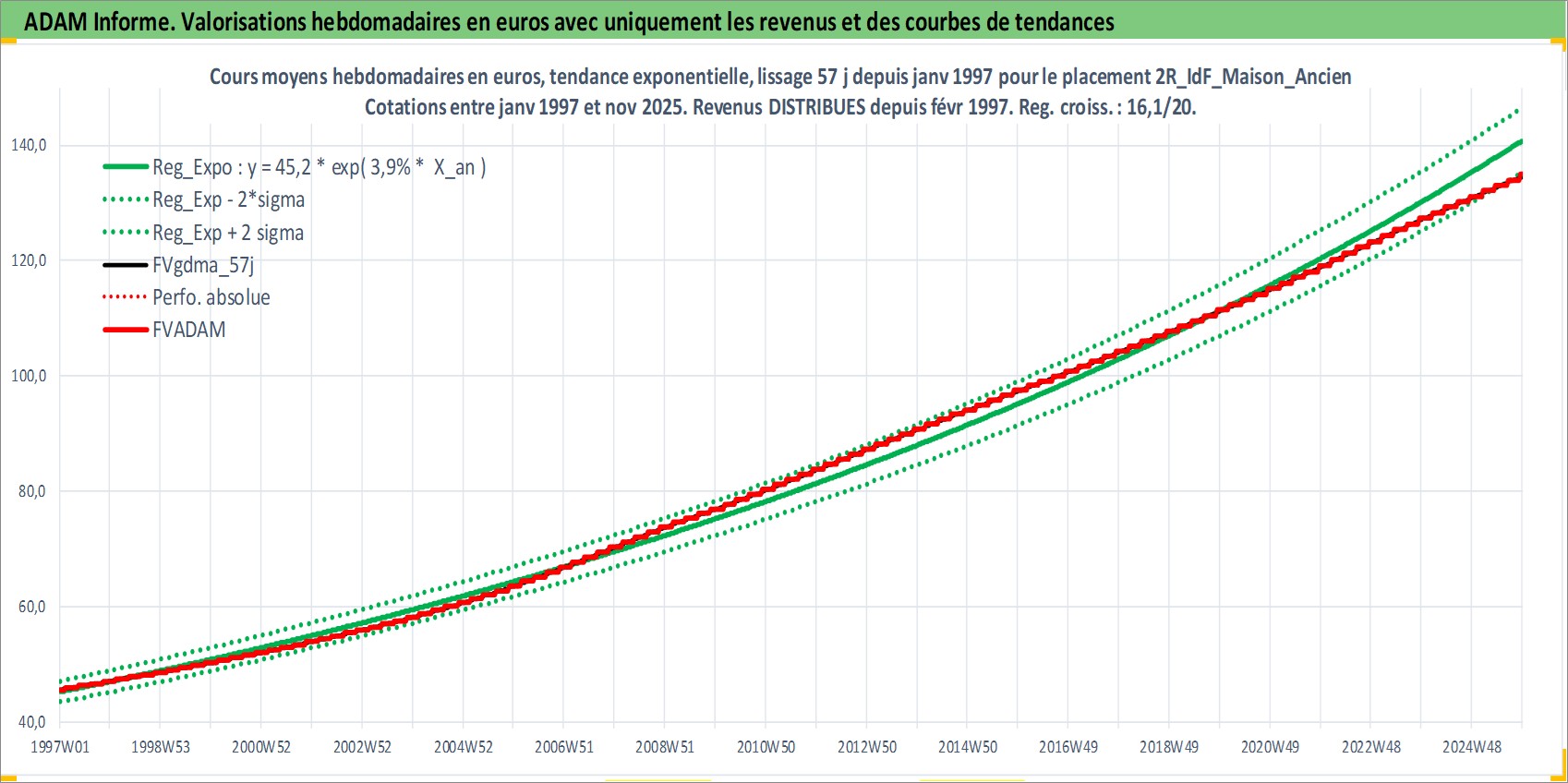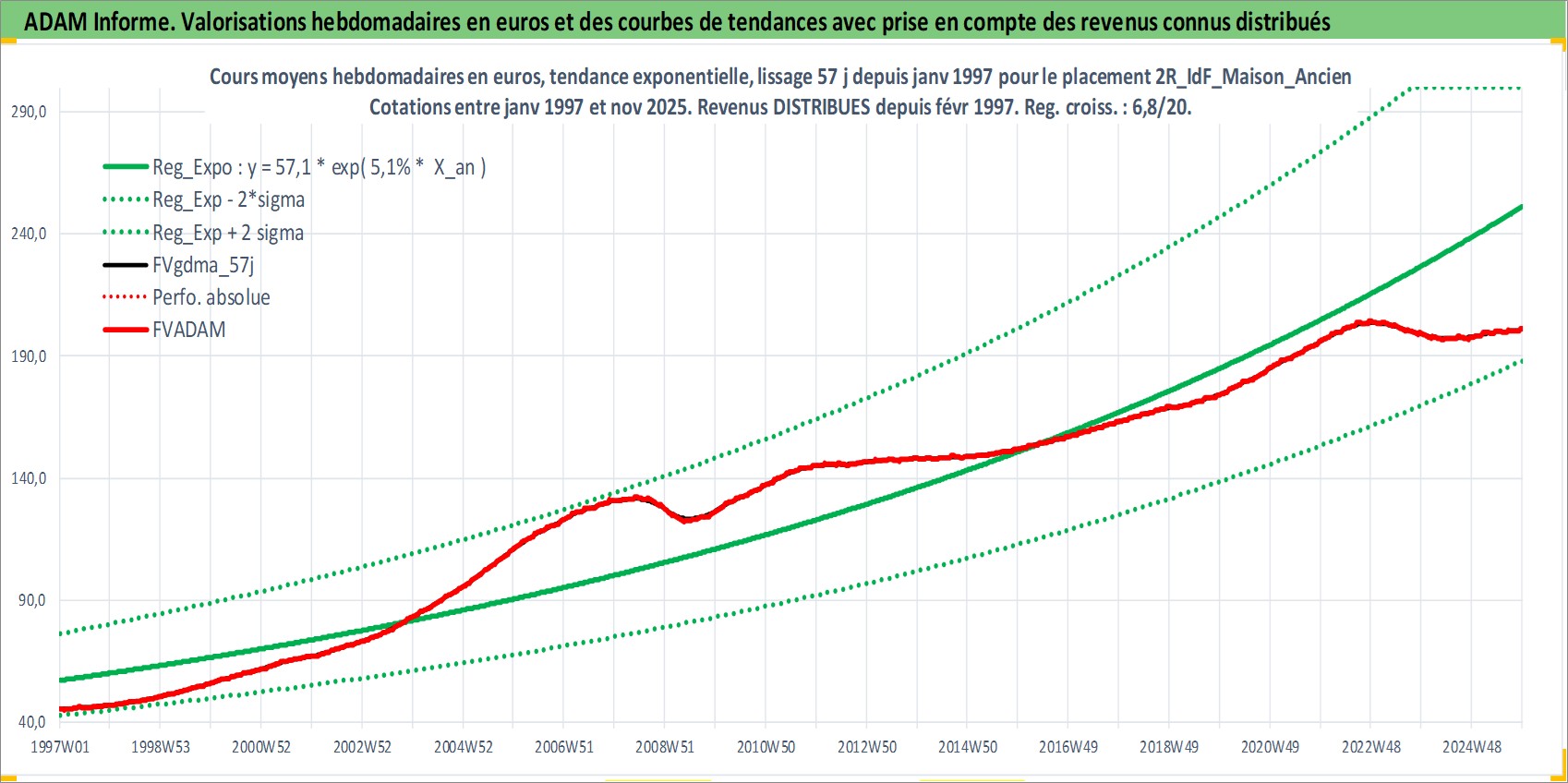 Site dédié aux investisseursPage dédiée sur site financeAnalyse des valorisations hebdomadaires de l'actif 2R_IdF_Maison_Ancien. Cet actif est cote en EUR. Les valorisations couvrent les semaines 1997W01 a 2025W48. Les loyers de cet actif immobilier sont pris egaux a 3,33% annuels de la valeur venale du logement.