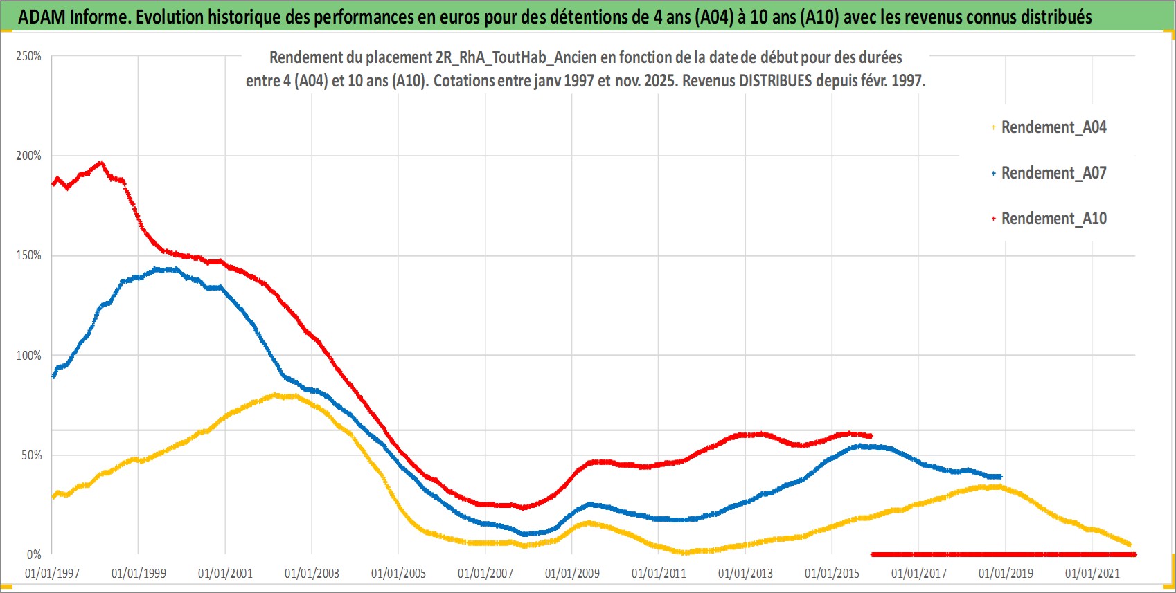 Site dédié aux investisseursPage dédiée sur site financeAnalyse des valorisations hebdomadaires de l'actif 2R_RhA_ToutHab_Ancien. Cet actif est cote en EUR. Les valorisations couvrent les semaines 1997W01 a 2025W48. Les loyers de cet actif immobilier sont pris egaux a 3,33% annuels de la valeur venale du logement.