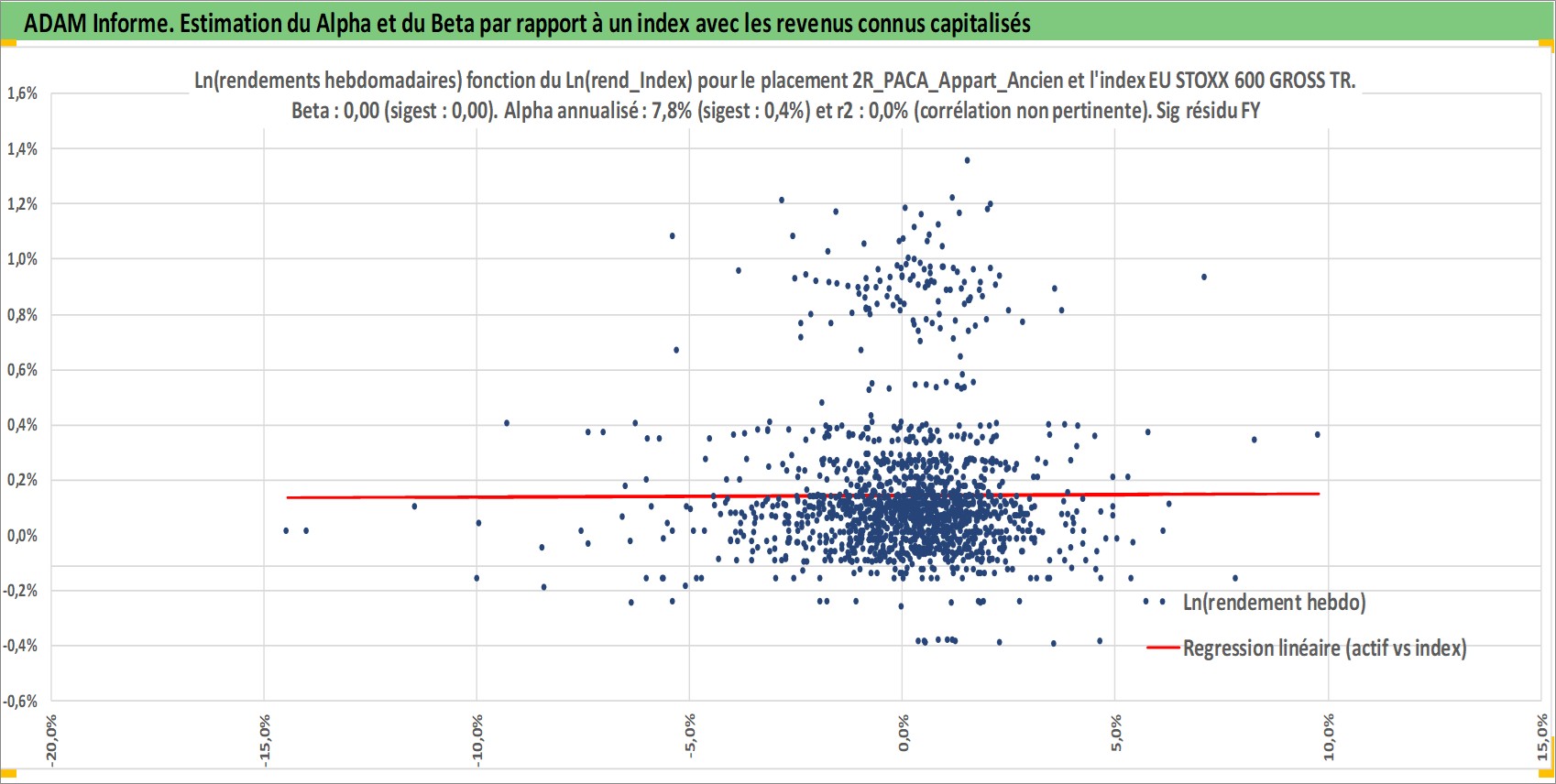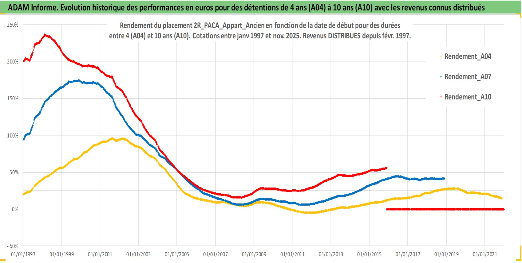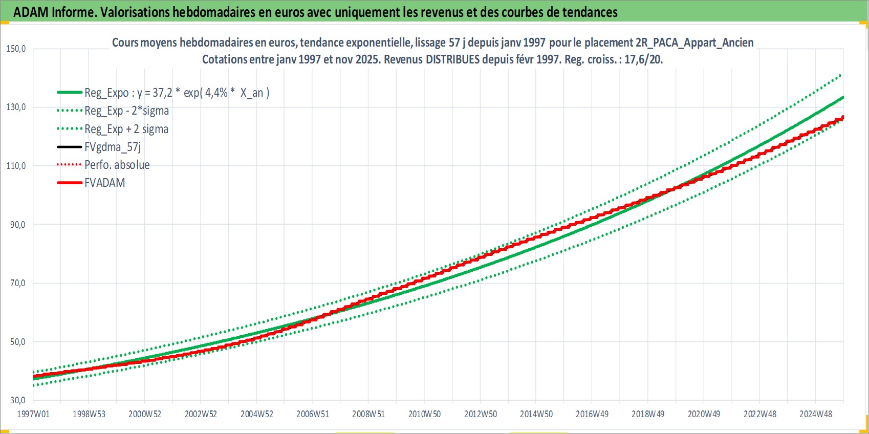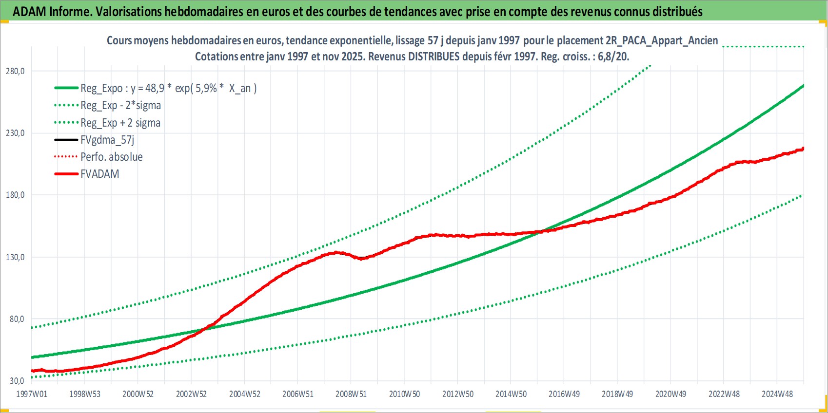 Site dédié aux investisseursPage dédiée sur site financeAnalyse des valorisations hebdomadaires de l'actif 2R_PACA_Appart_Ancien. Cet actif est cote en EUR. Les valorisations couvrent les semaines 1997W01 a 2025W48. Les loyers de cet actif immobilier sont pris egaux a 3,33% annuels de la valeur venale du logement.
