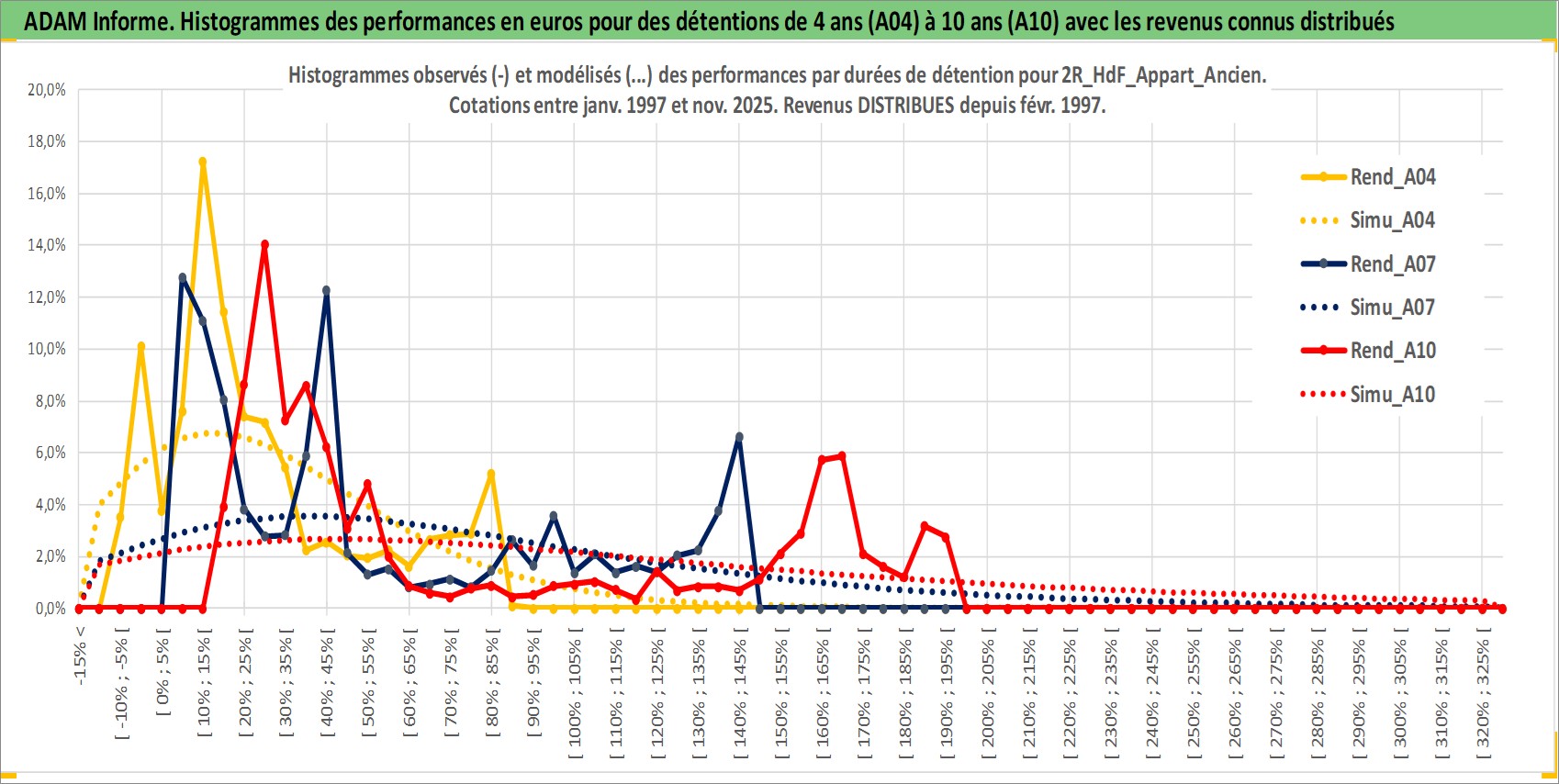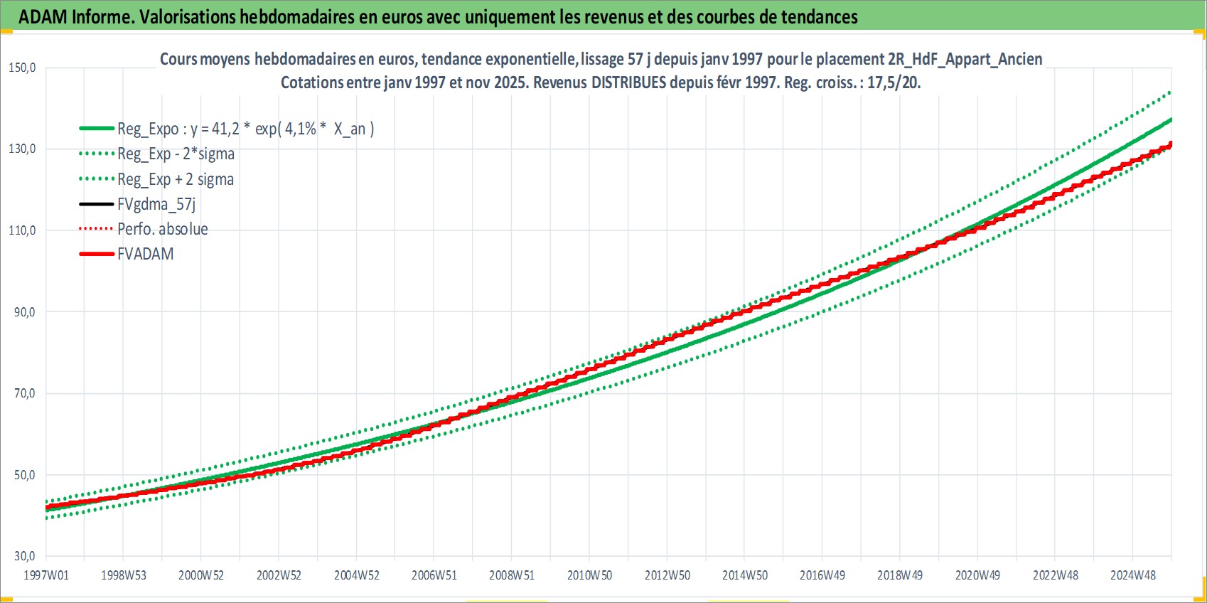 Site dédié aux investisseursPage dédiée sur site financeAnalyse des valorisations hebdomadaires de l'actif 2R_HdF_Appart_Ancien. Cet actif est cote en EUR. Les valorisations couvrent les semaines 1997W01 a 2025W48. Les loyers de cet actif immobilier sont pris egaux a 3,33% annuels de la valeur venale du logement.