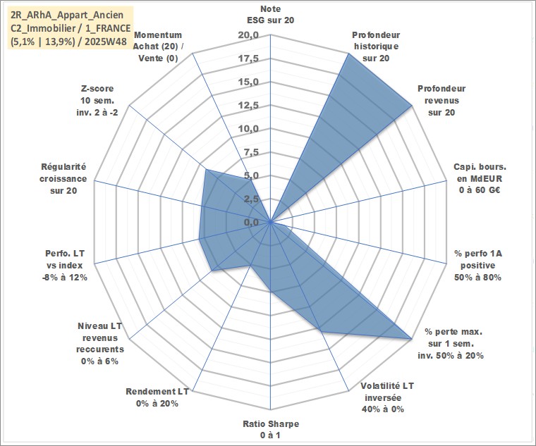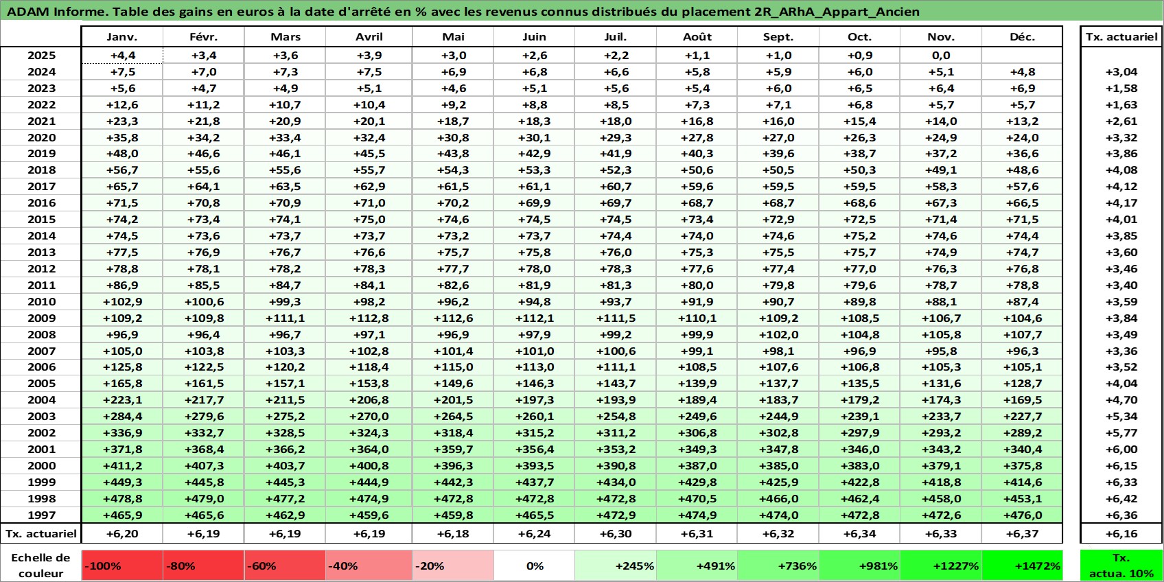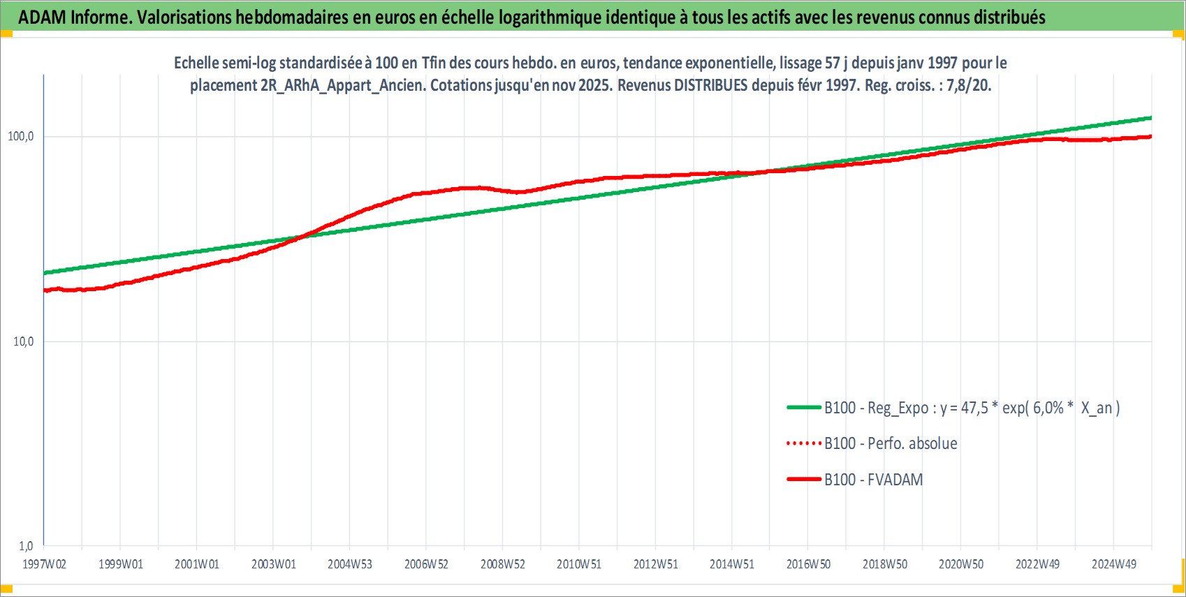Site dédié aux investisseursPage dédiée sur site financeAnalyse des valorisations hebdomadaires de l'actif 2R_ARhA_Appart_Ancien. Cet actif est cote en EUR. Les valorisations couvrent les semaines 1997W01 a 2025W48. Les loyers de cet actif immobilier sont pris egaux a 3,33% annuels de la valeur venale du logement.