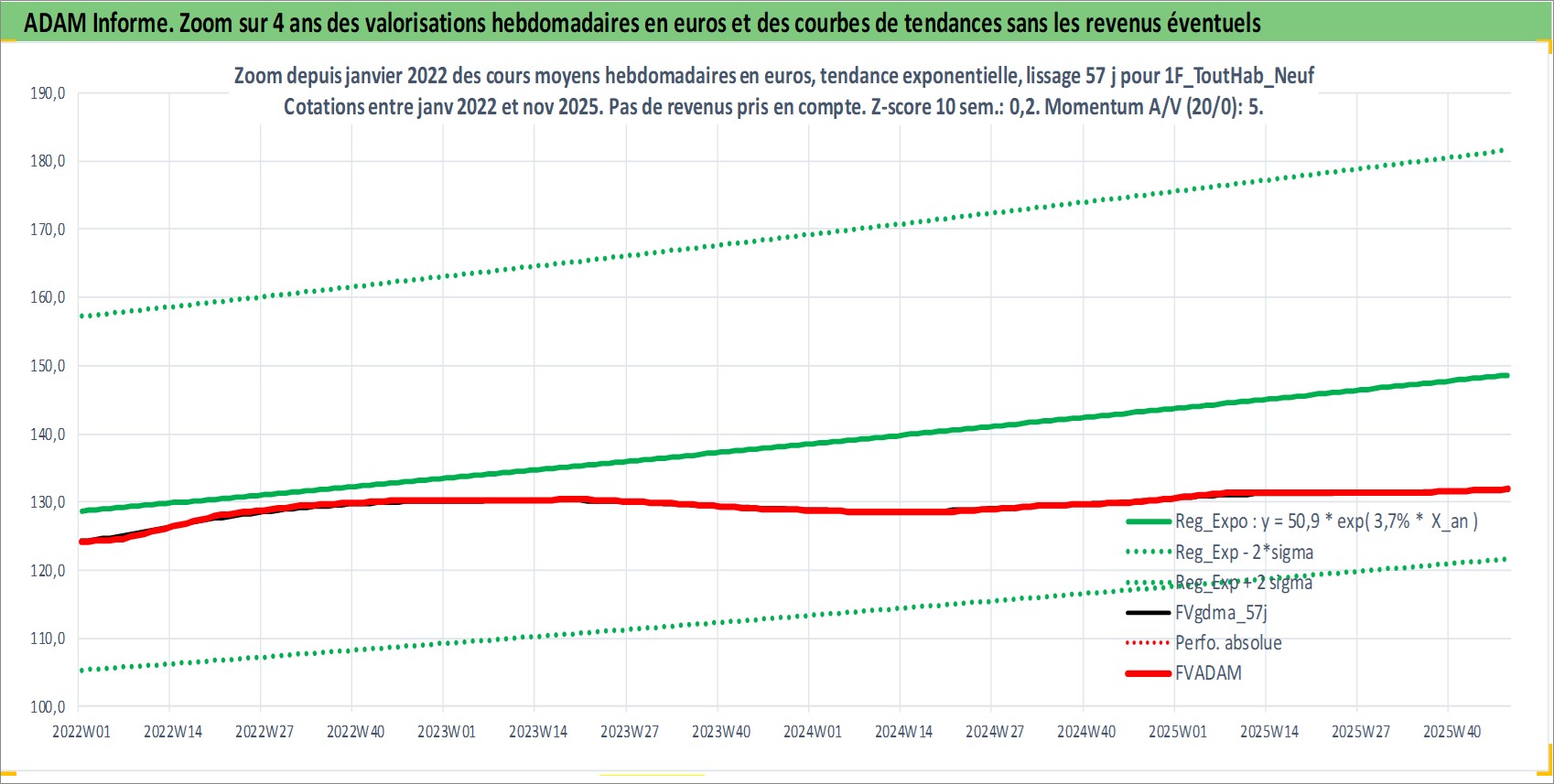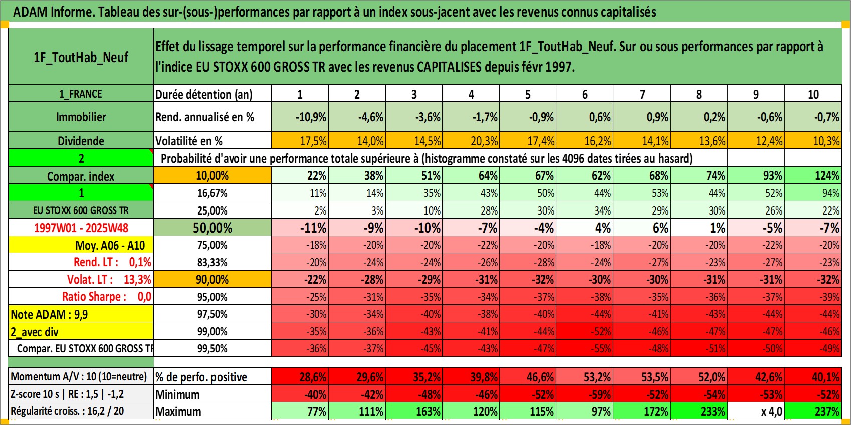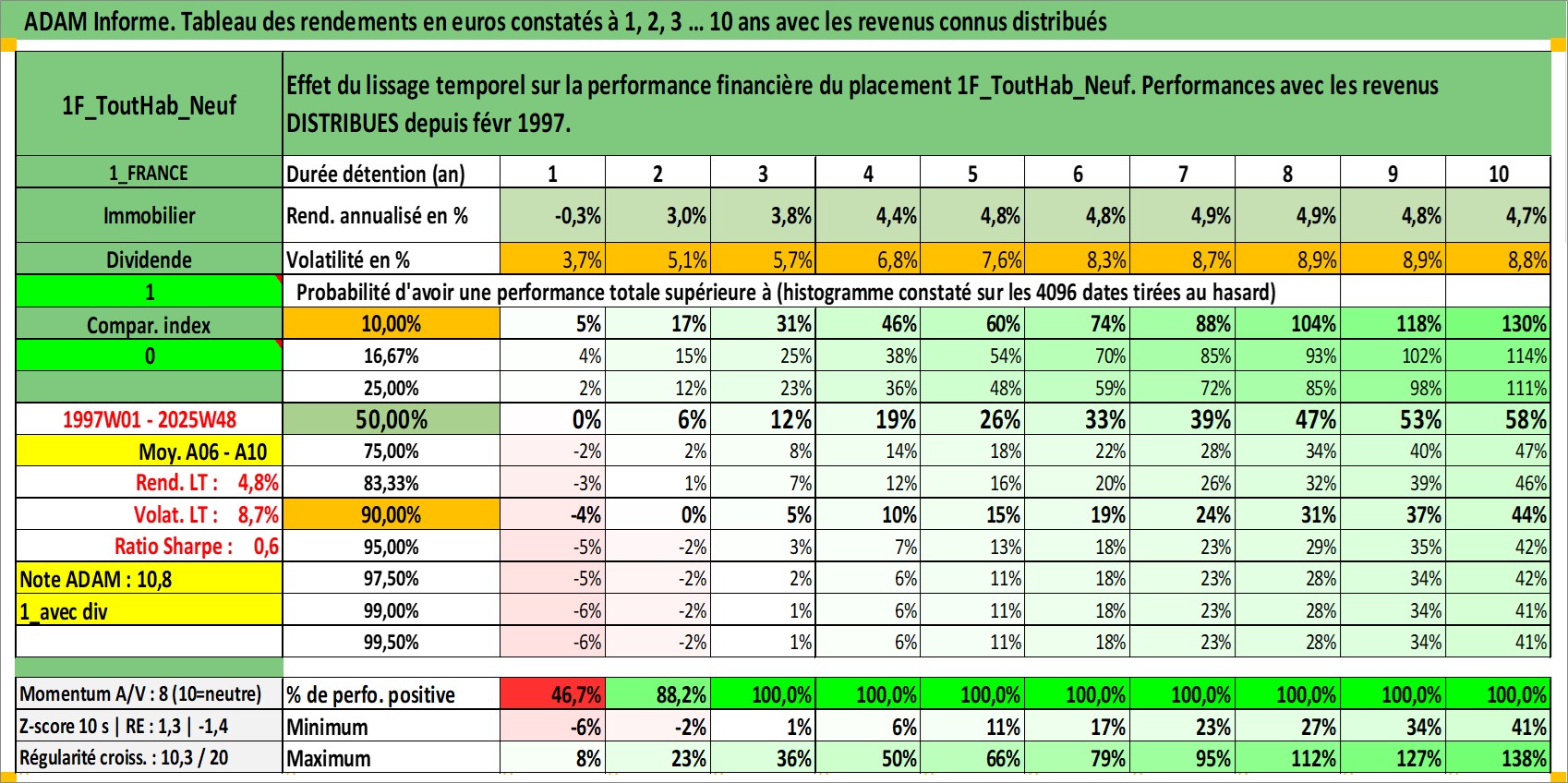 Site dédié aux investisseursPage dédiée sur site financeAnalyse des valorisations hebdomadaires de l'actif 1F_ToutHab_Neuf. Cet actif est cote en EUR. Les valorisations couvrent les semaines 1997W01 a 2025W48. Les loyers de cet actif immobilier sont pris egaux a 3,33% annuels de la valeur venale du logement.