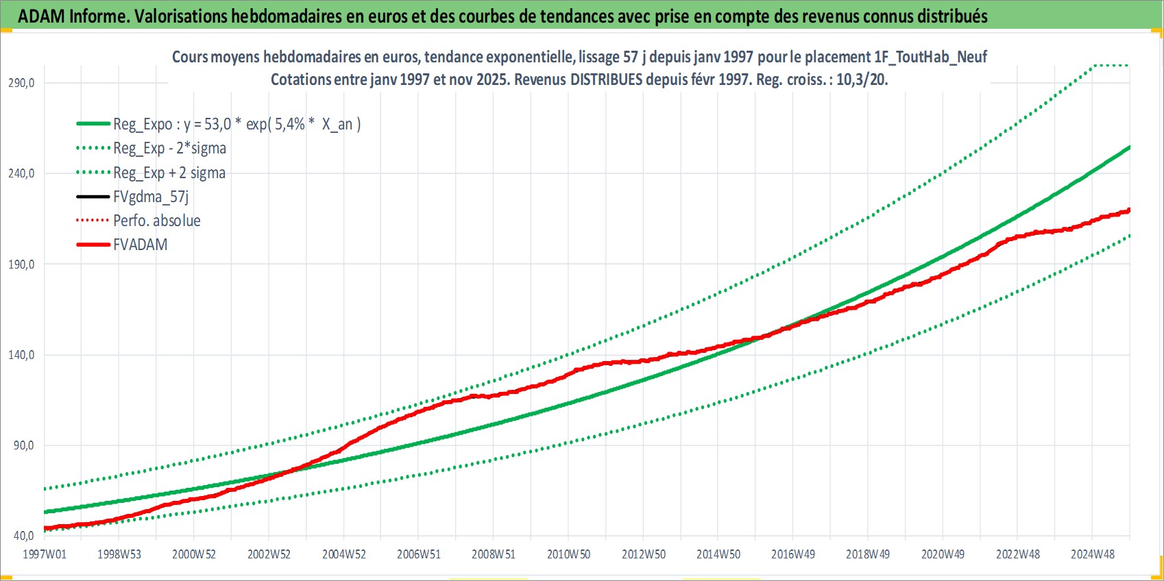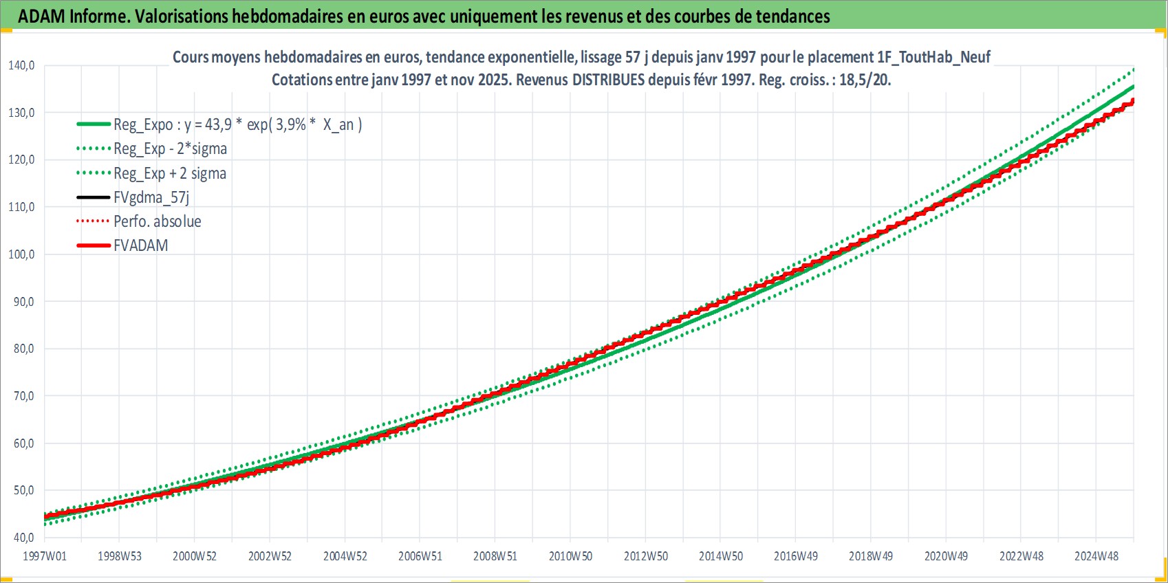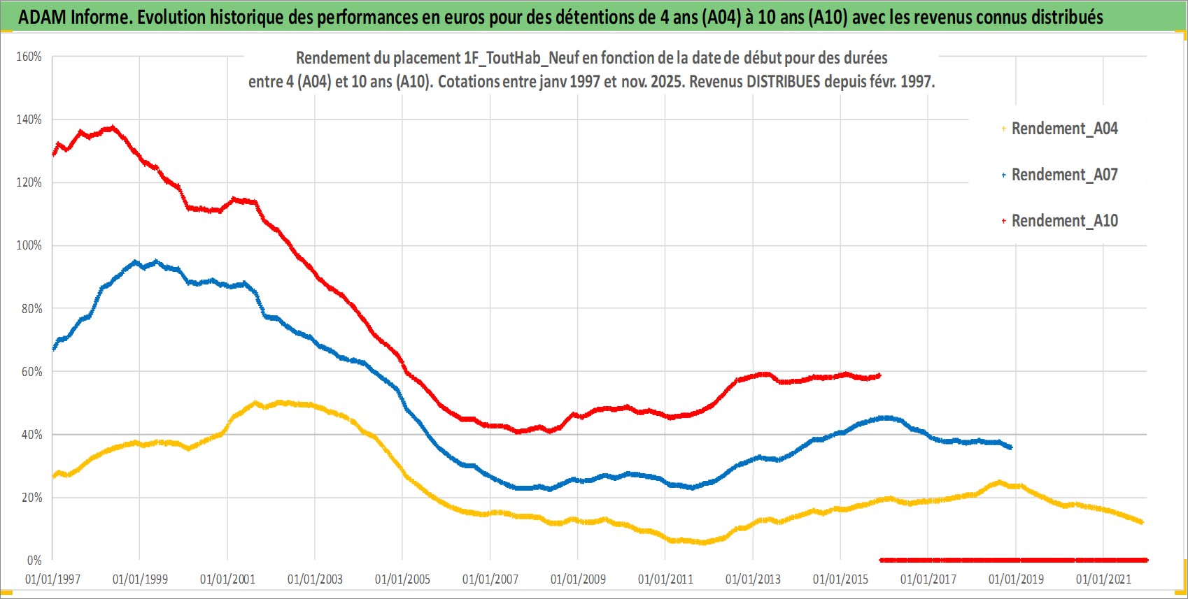 Site dédié aux investisseursPage dédiée sur site financeAnalyse des valorisations hebdomadaires de l'actif 1F_ToutHab_Neuf. Cet actif est cote en EUR. Les valorisations couvrent les semaines 1997W01 a 2025W48. Les loyers de cet actif immobilier sont pris egaux a 3,33% annuels de la valeur venale du logement.
