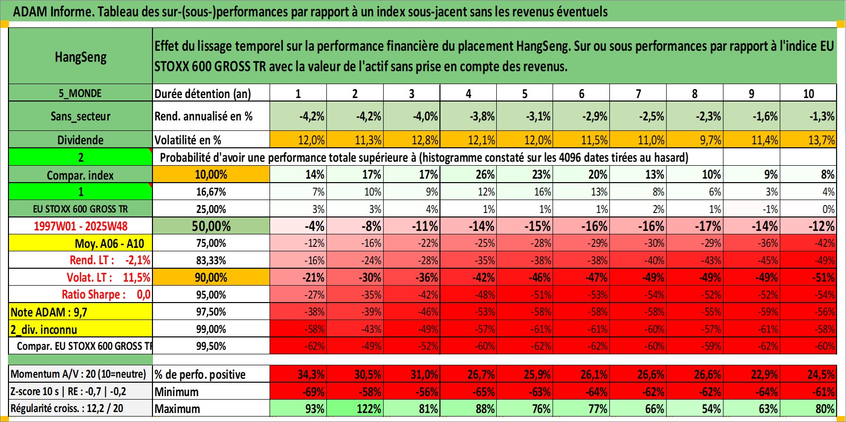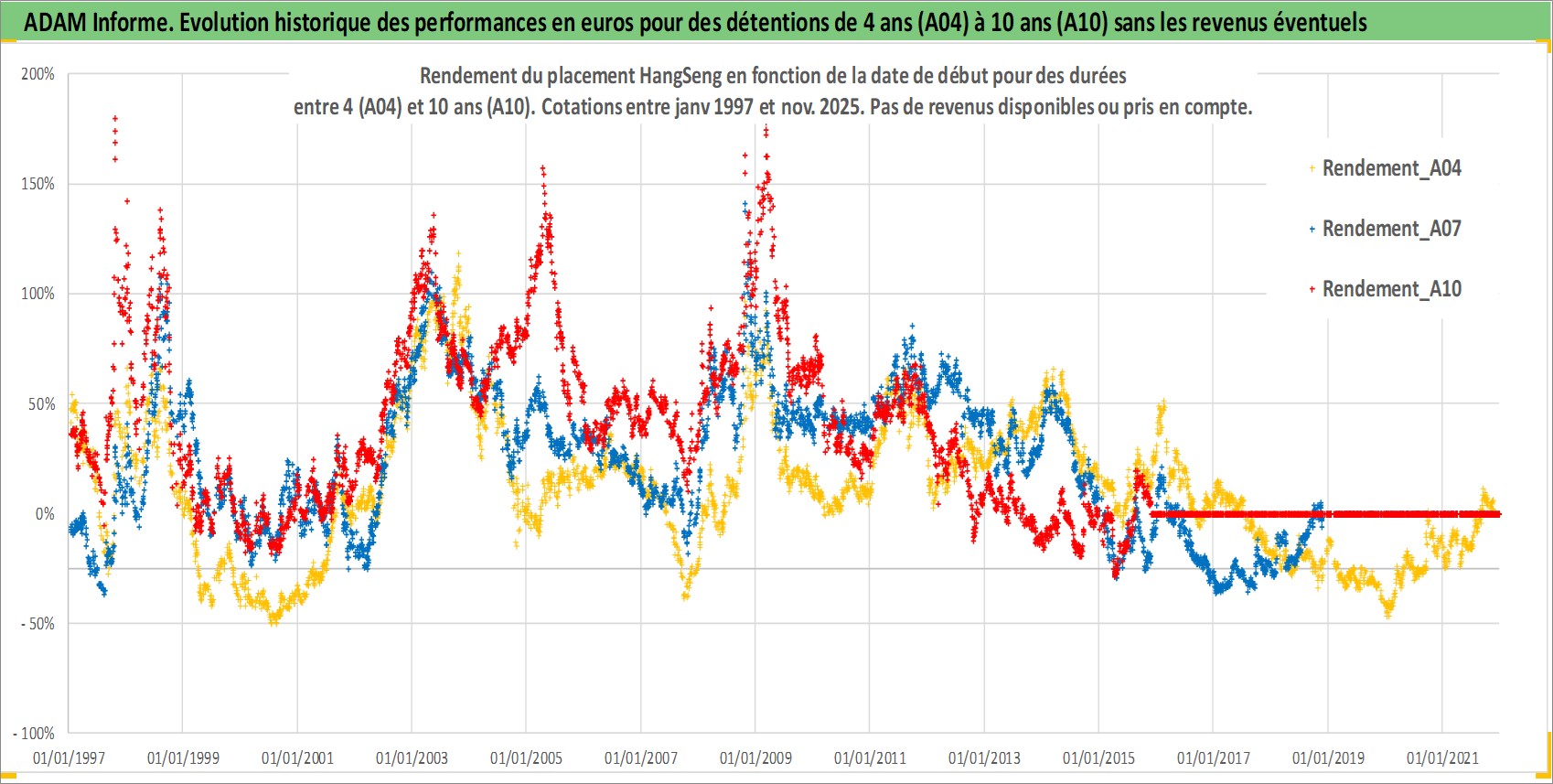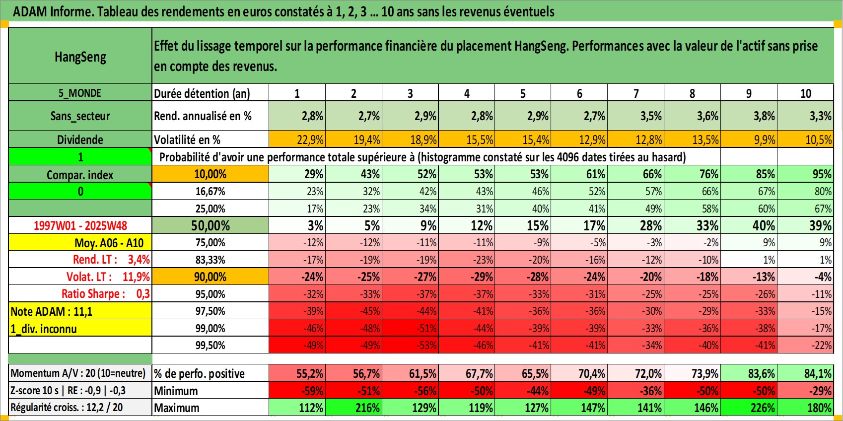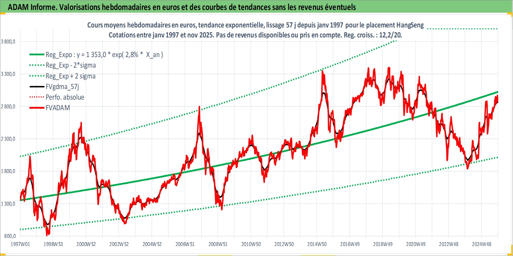 Site dédié aux investisseursPage dédiée sur site financeAnalyse des valorisations hebdomadaires de l'actif HangSeng. Cet actif est cote en HKD. Les valorisations sont en contrevaleur EURO et couvrent les semaines 1997W01 a 2025W48. Les revenus de cet actif financier ne sont pas connus car non existants ou non disponibles sur le site Yahoo Finance. La note ESG de cet actif n'est pas connue.