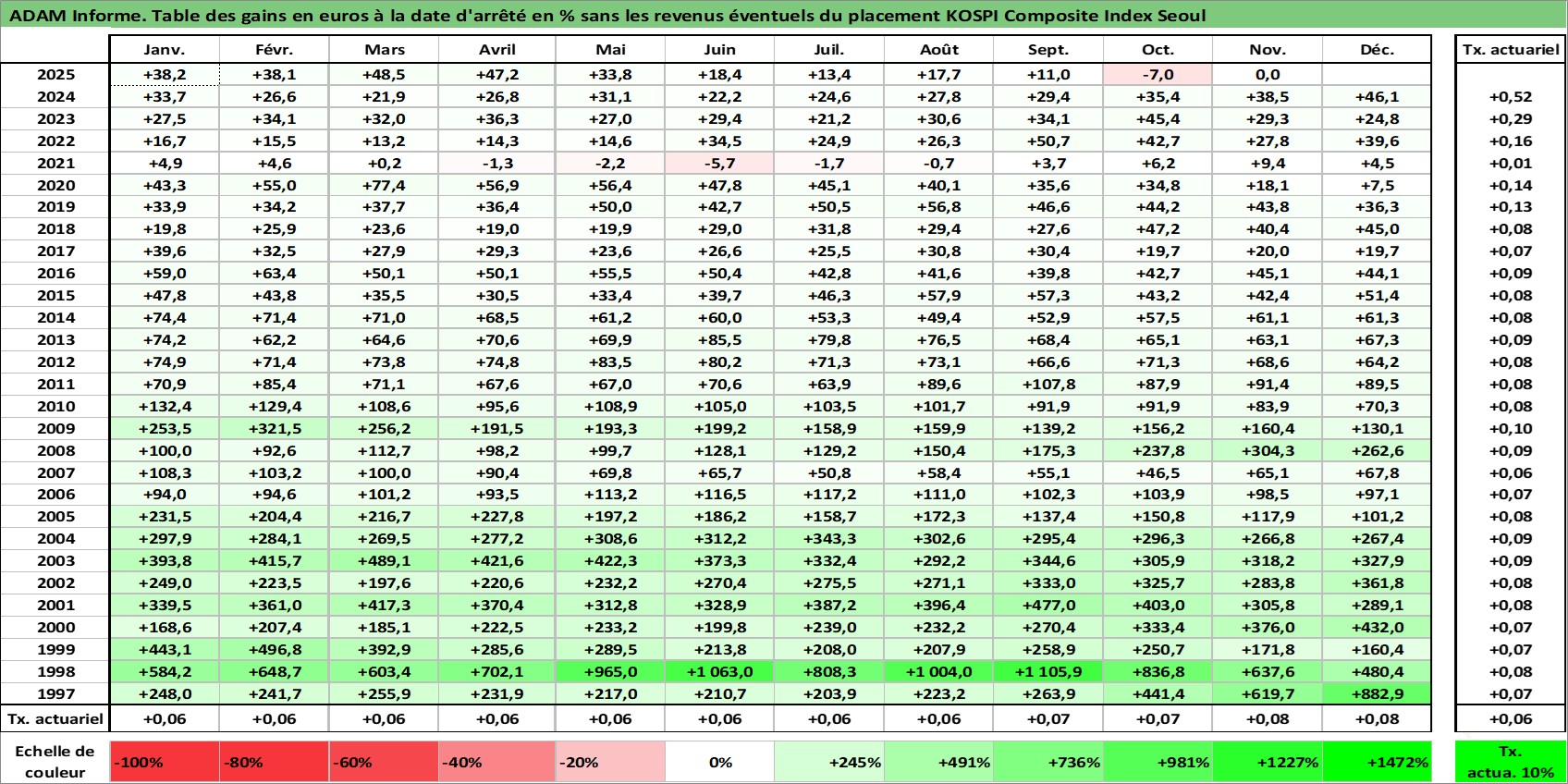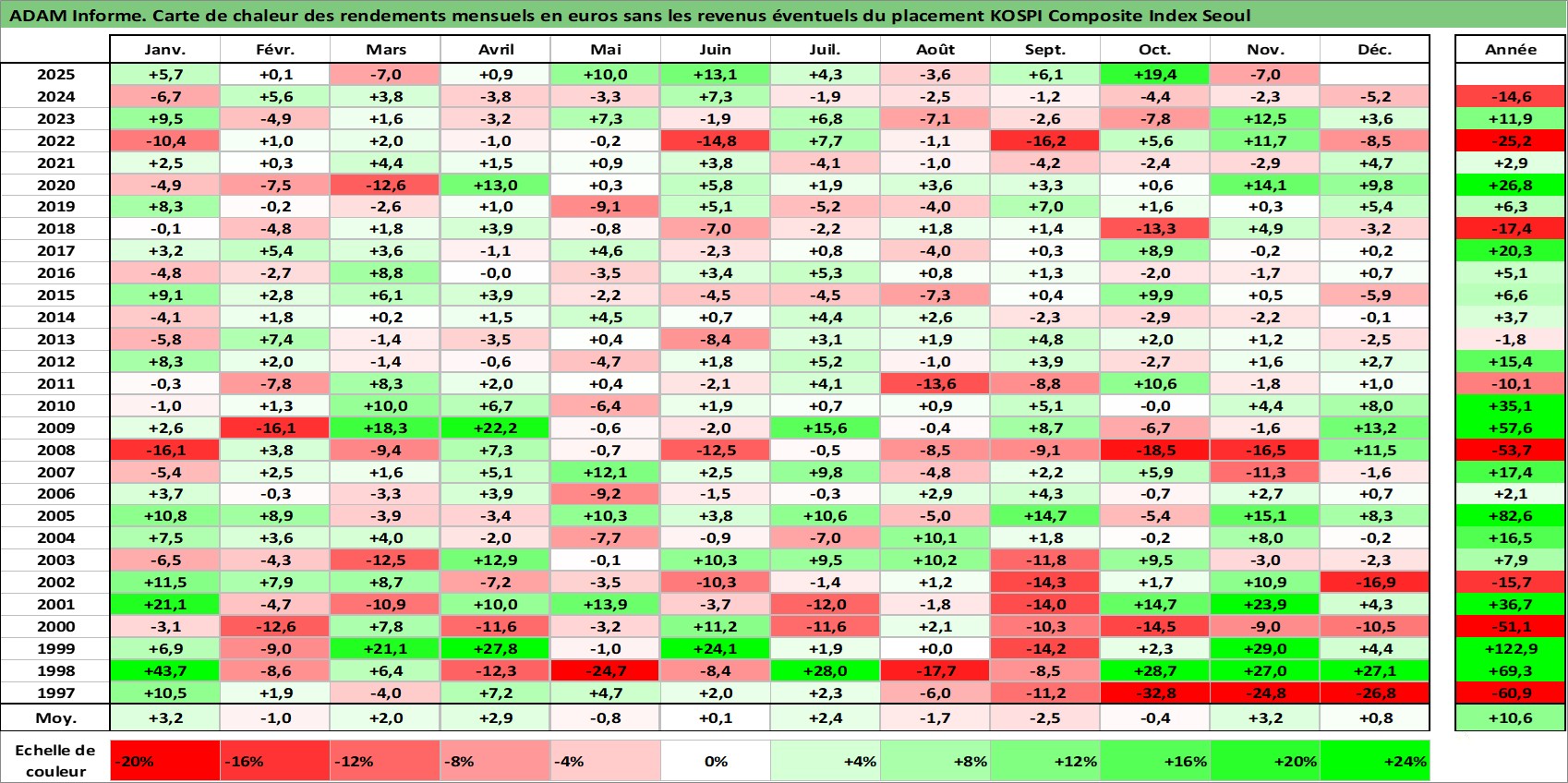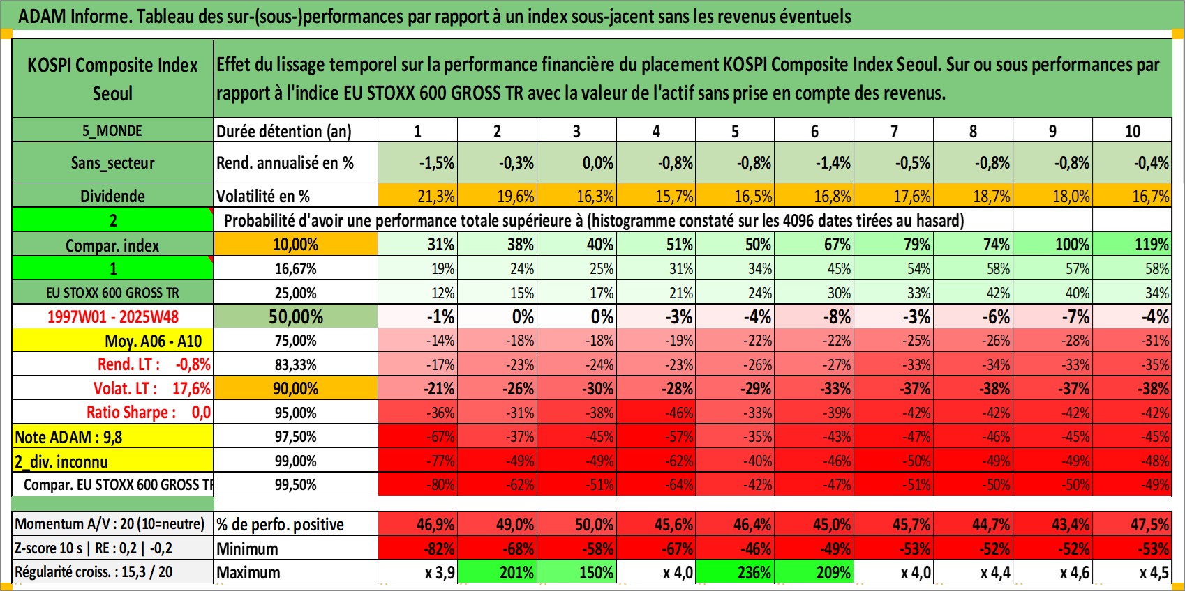 Site dédié aux investisseursPage dédiée sur site financeAnalyse des valorisations hebdomadaires de l'actif KOSPI Composite Index Seoul. Cet actif est cote en KRW. Les valorisations sont en contrevaleur EURO et couvrent les semaines 1997W01 a 2025W48. Les revenus de cet actif financier ne sont pas connus car non existants ou non disponibles sur le site Yahoo Finance. La note ESG de cet actif n'est pas connue.