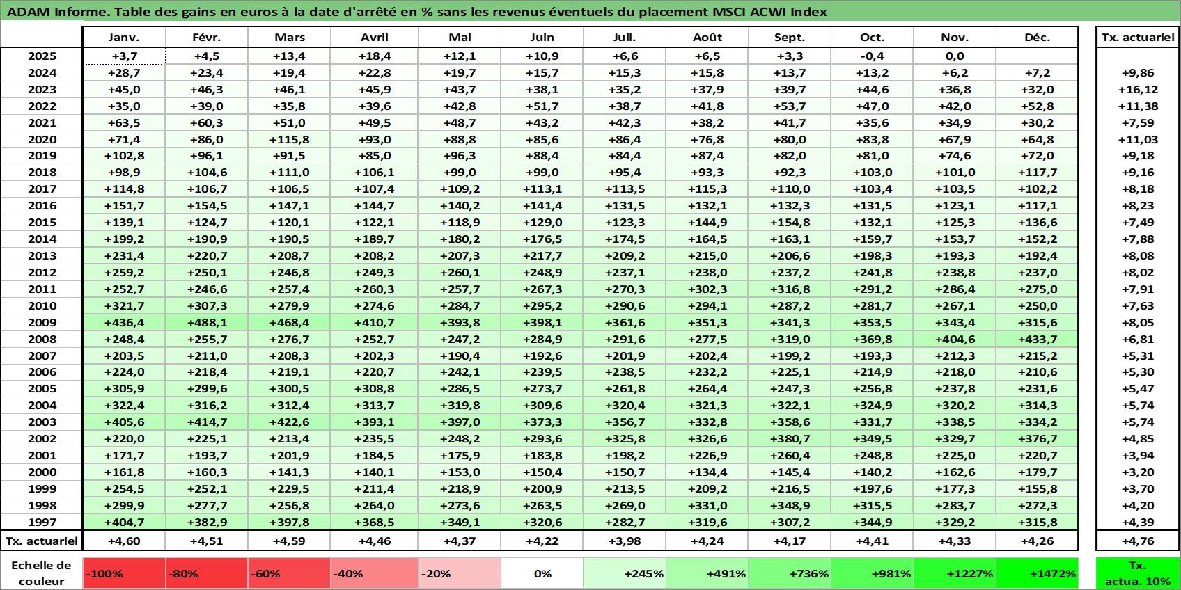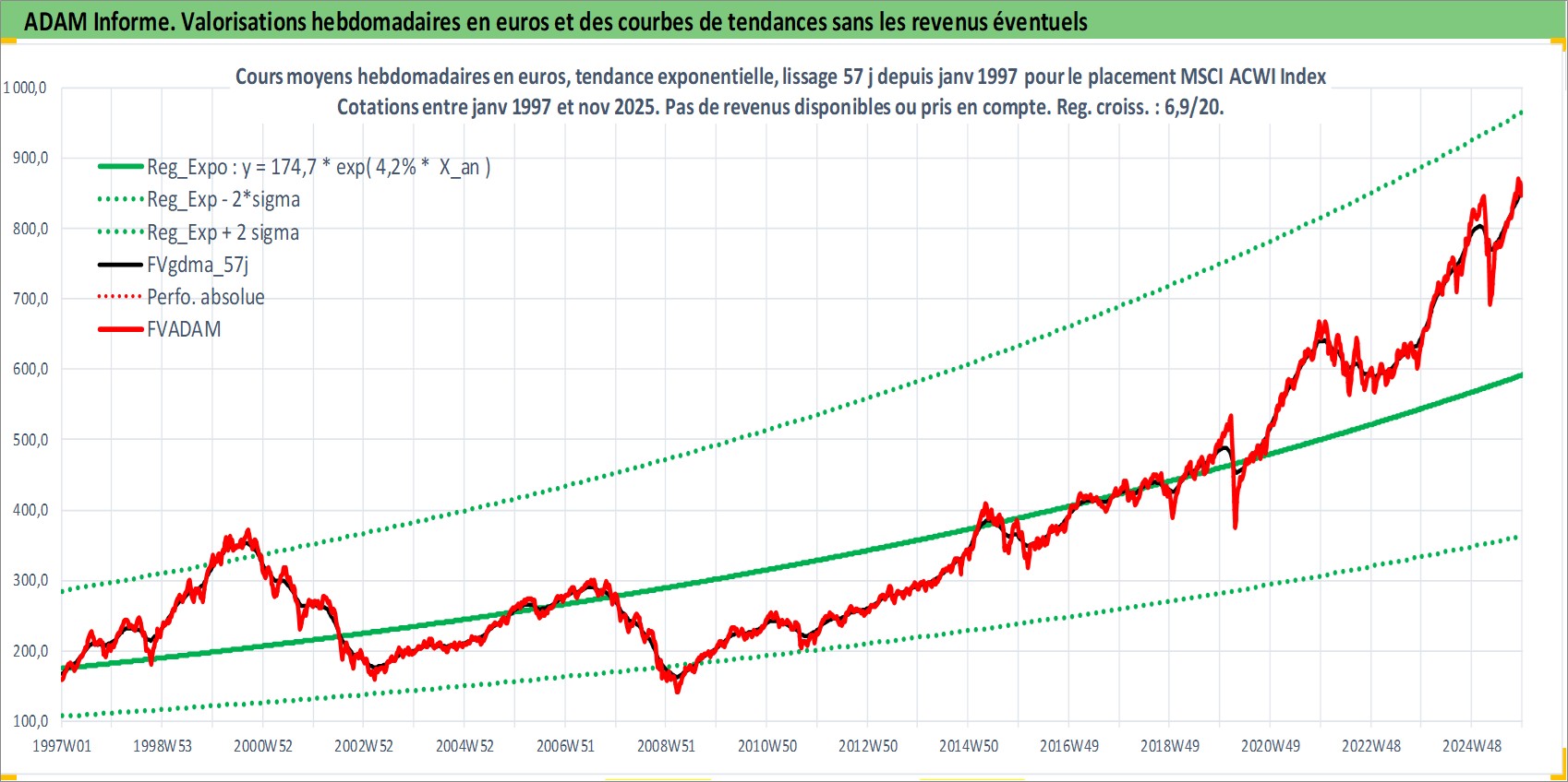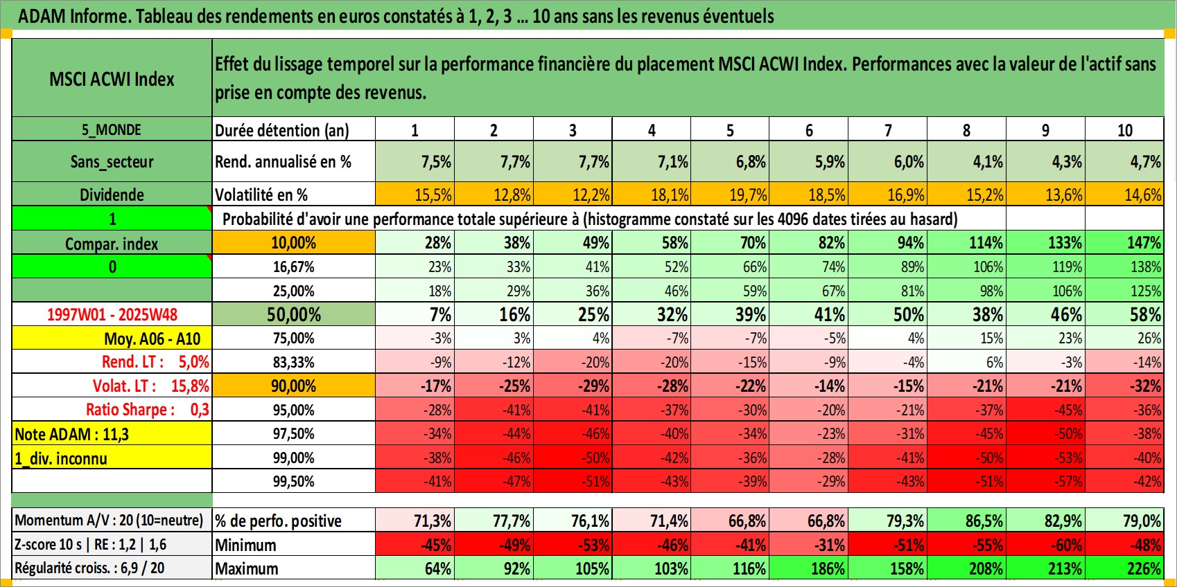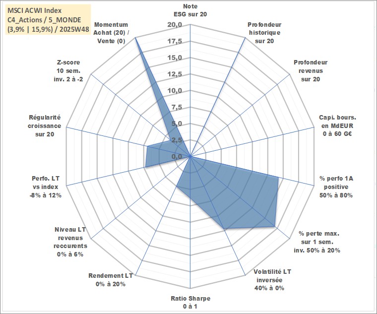 Site dédié aux investisseursPage dédiée sur site financeAnalyse des valorisations hebdomadaires de l'actif MSCI ACWI Index. Cet actif est cote en USD. Les valorisations sont en contrevaleur EURO et couvrent les semaines 1997W01 a 2025W48. Les revenus de cet actif financier ne sont pas connus car non existants ou non disponibles sur le site Yahoo Finance. La note ESG de cet actif n'est pas connue.