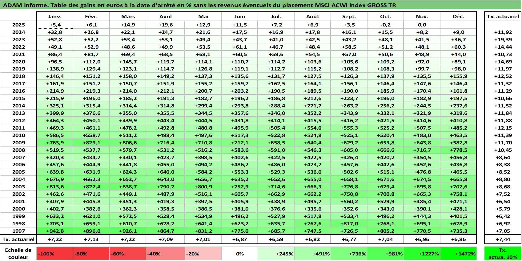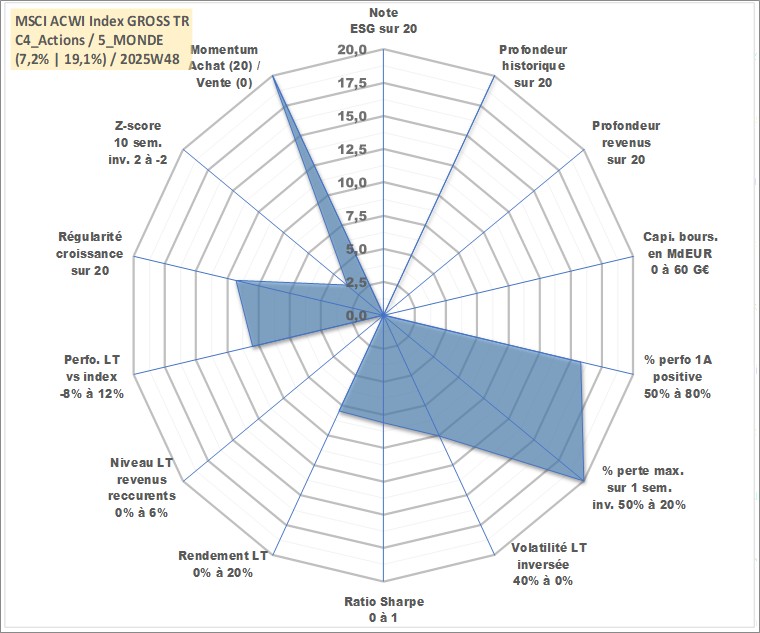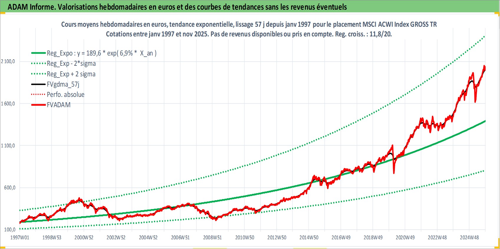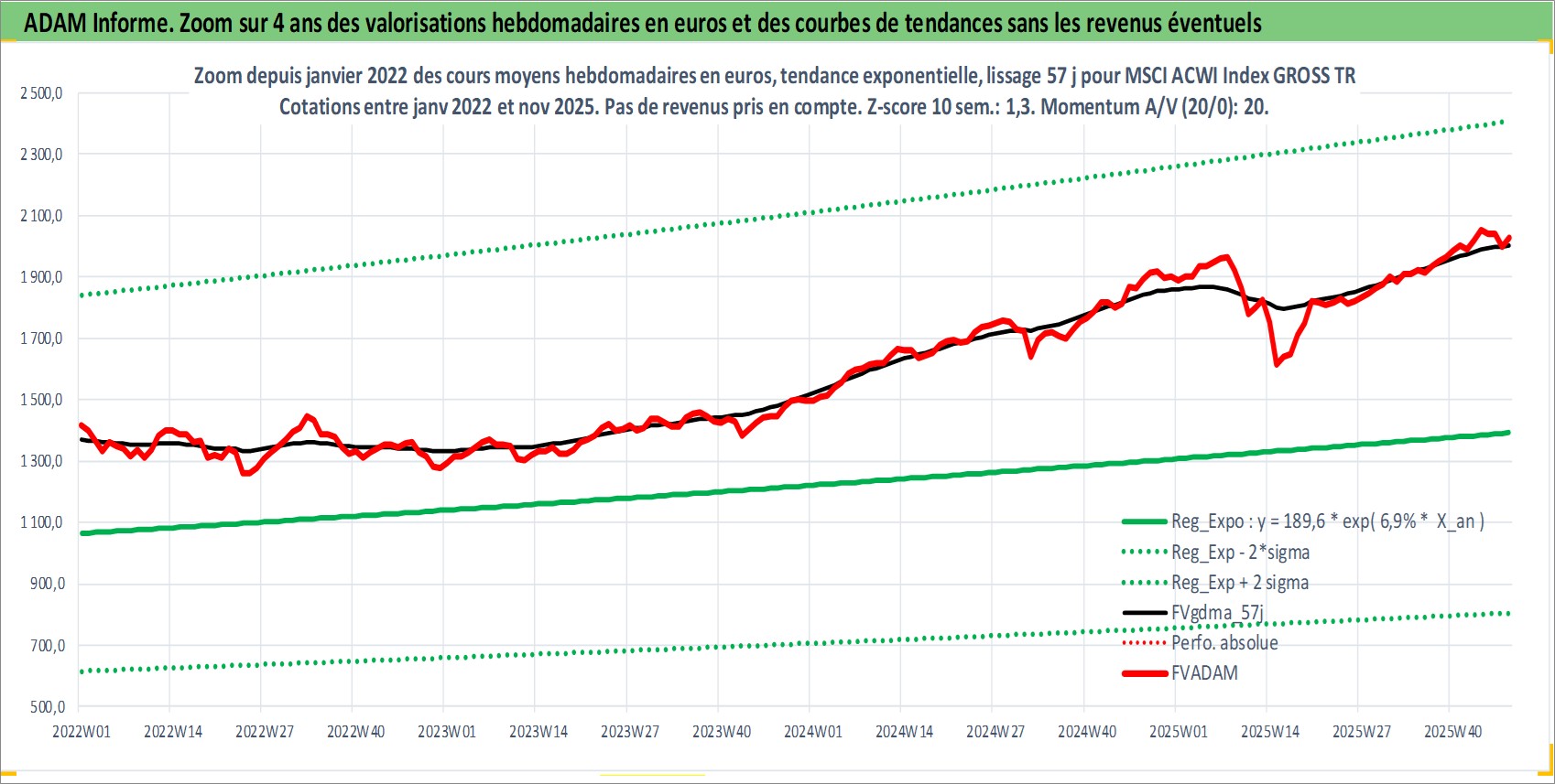 Site dédié aux investisseursPage dédiée sur site financeAnalyse des valorisations hebdomadaires de l'actif MSCI ACWI Index GROSS TR. Cet actif est cote en USD. Les valorisations sont en contrevaleur EURO et couvrent les semaines 1997W01 a 2025W48. Les revenus de cet actif financier ne sont pas connus car non existants ou non disponibles sur le site Yahoo Finance. La note ESG de cet actif n'est pas connue.
