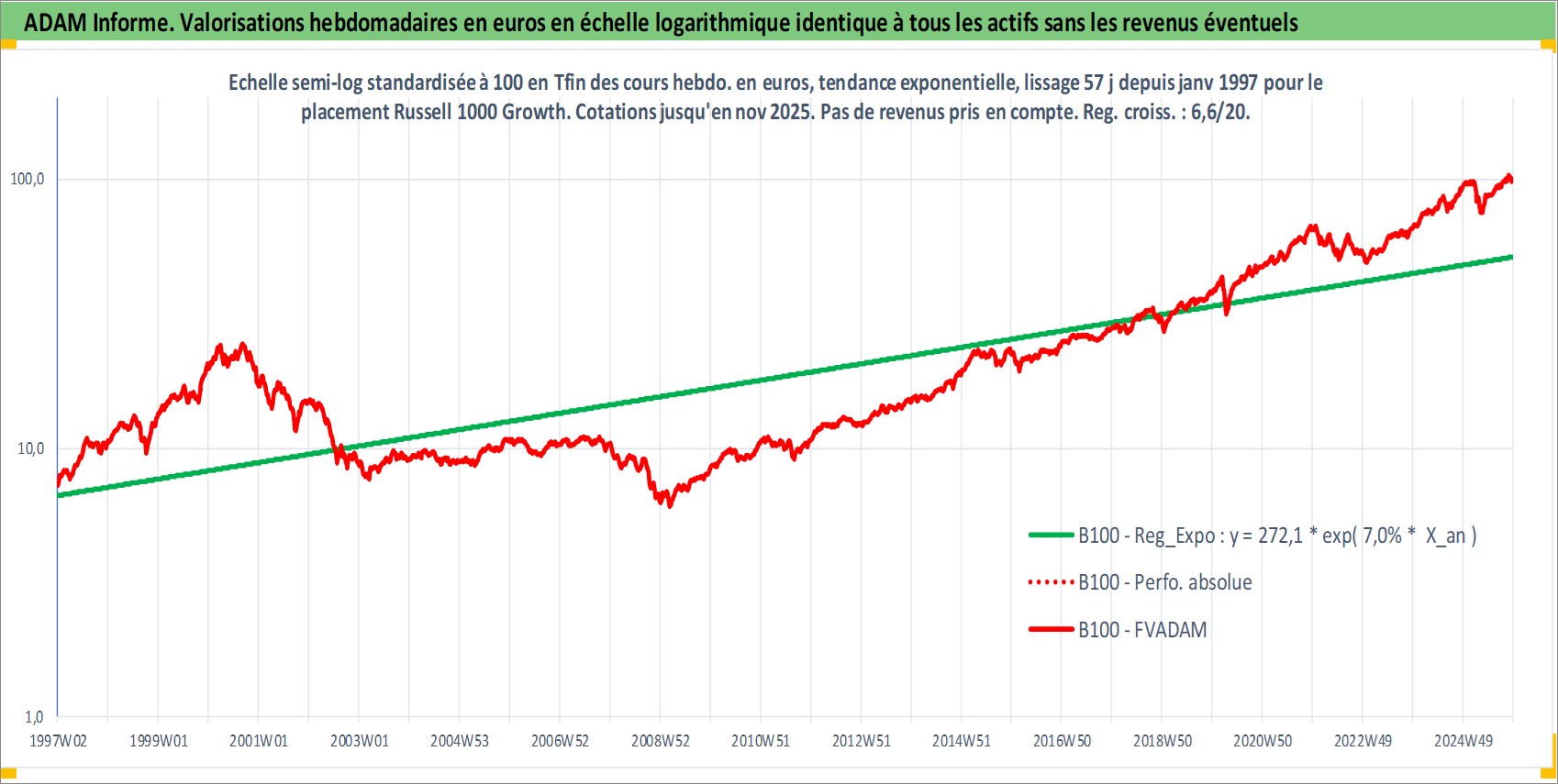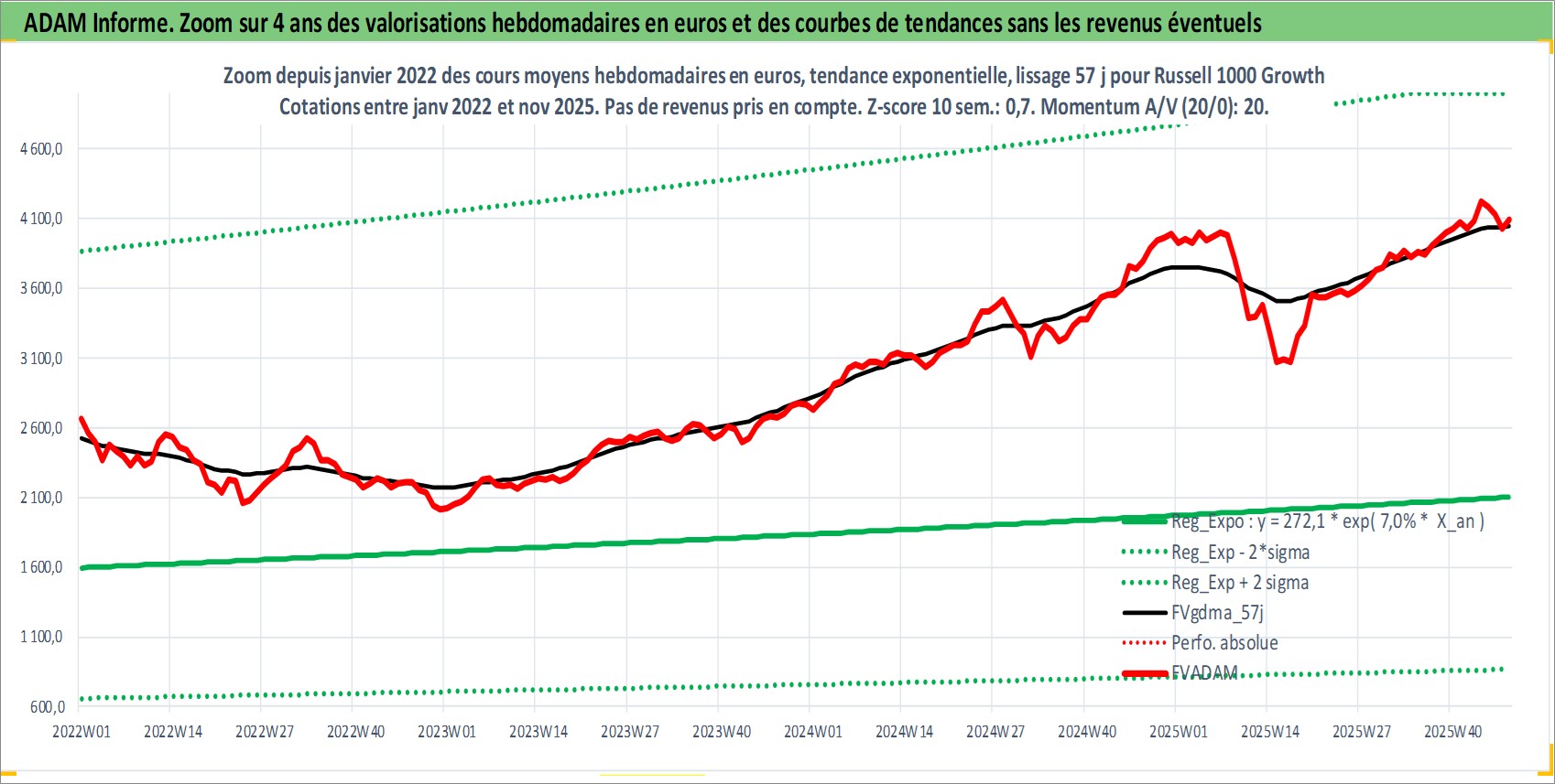 Site dédié aux investisseursPage dédiée sur site financeAnalyse des valorisations hebdomadaires de l'actif Russell 1000 Growth. Cet actif est cote en USD. Les valorisations sont en contrevaleur EURO et couvrent les semaines 1997W01 a 2025W48. Les revenus de cet actif financier ne sont pas connus car non existants ou non disponibles sur le site Yahoo Finance. La note ESG de cet actif n'est pas connue.