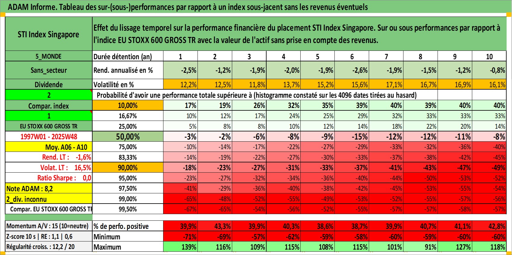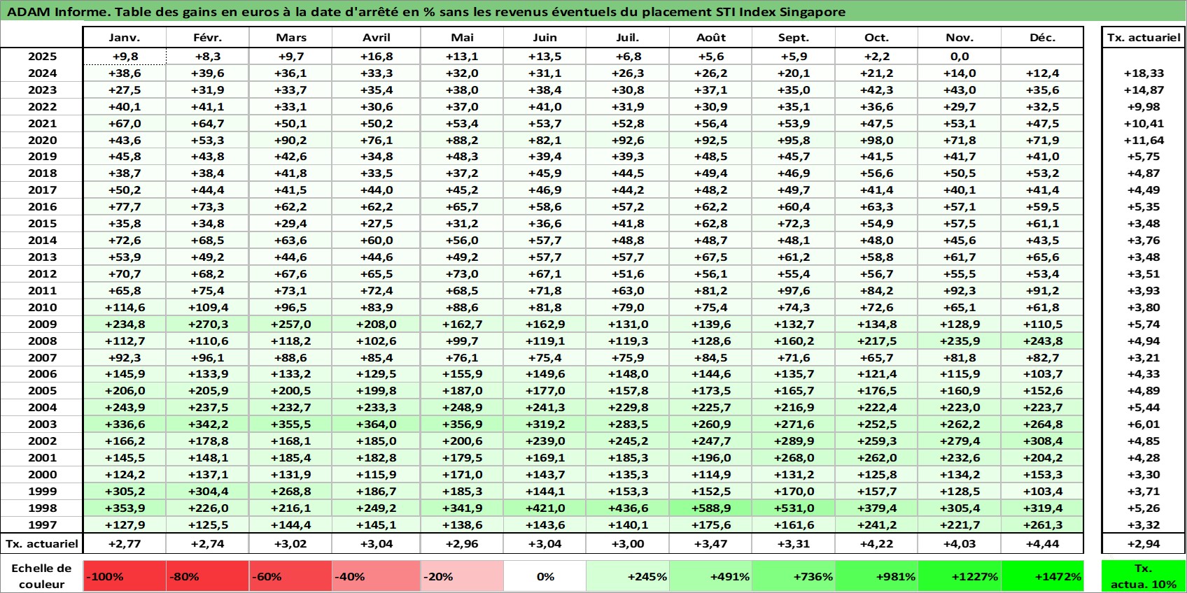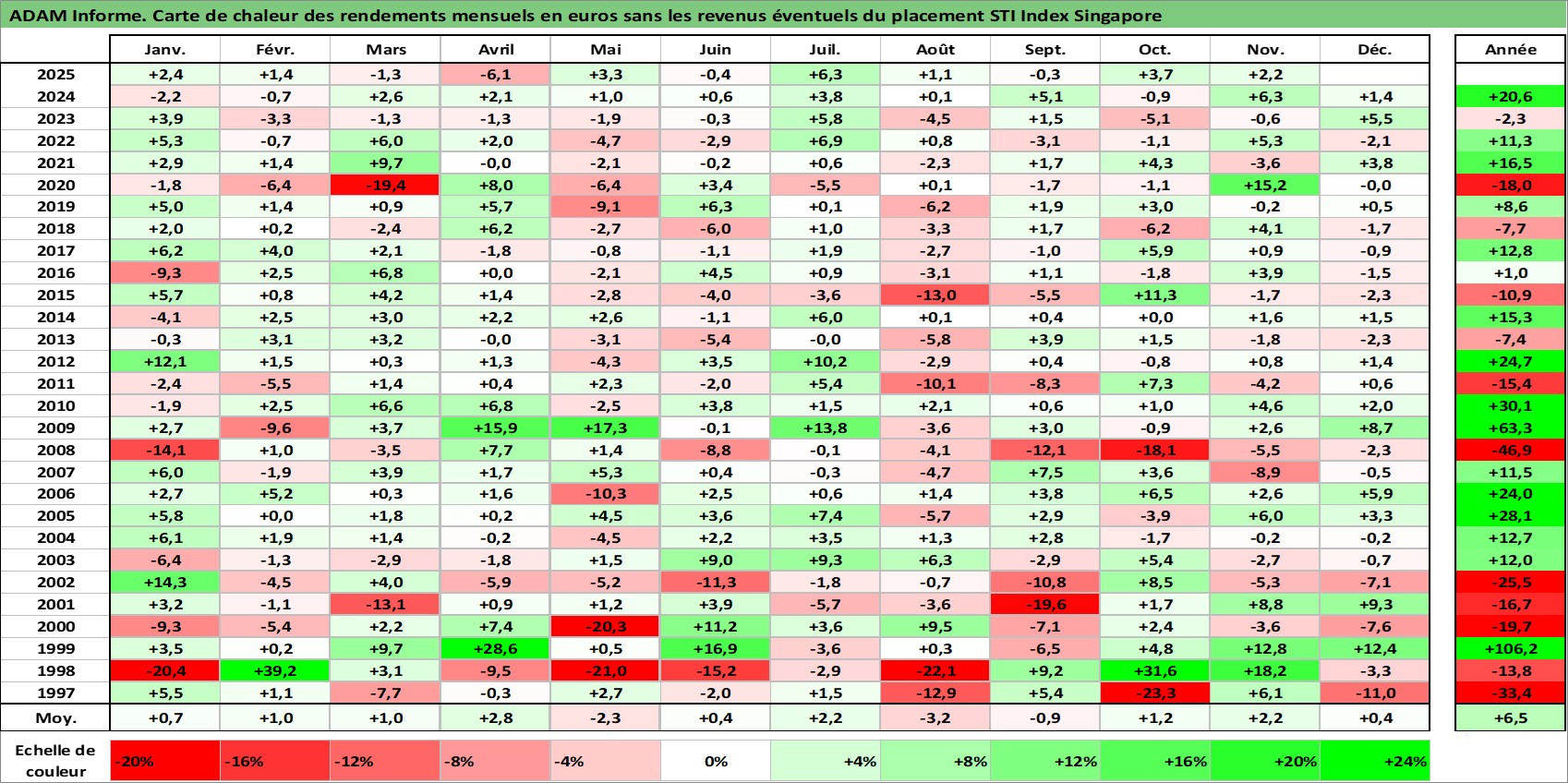 Site dédié aux investisseursPage dédiée sur site financeAnalyse des valorisations hebdomadaires de l'actif STI Index Singapore. Cet actif est cote en SGD. Les valorisations sont en contrevaleur EURO et couvrent les semaines 1997W01 a 2025W48. Les revenus de cet actif financier ne sont pas connus car non existants ou non disponibles sur le site Yahoo Finance. La note ESG de cet actif n'est pas connue.