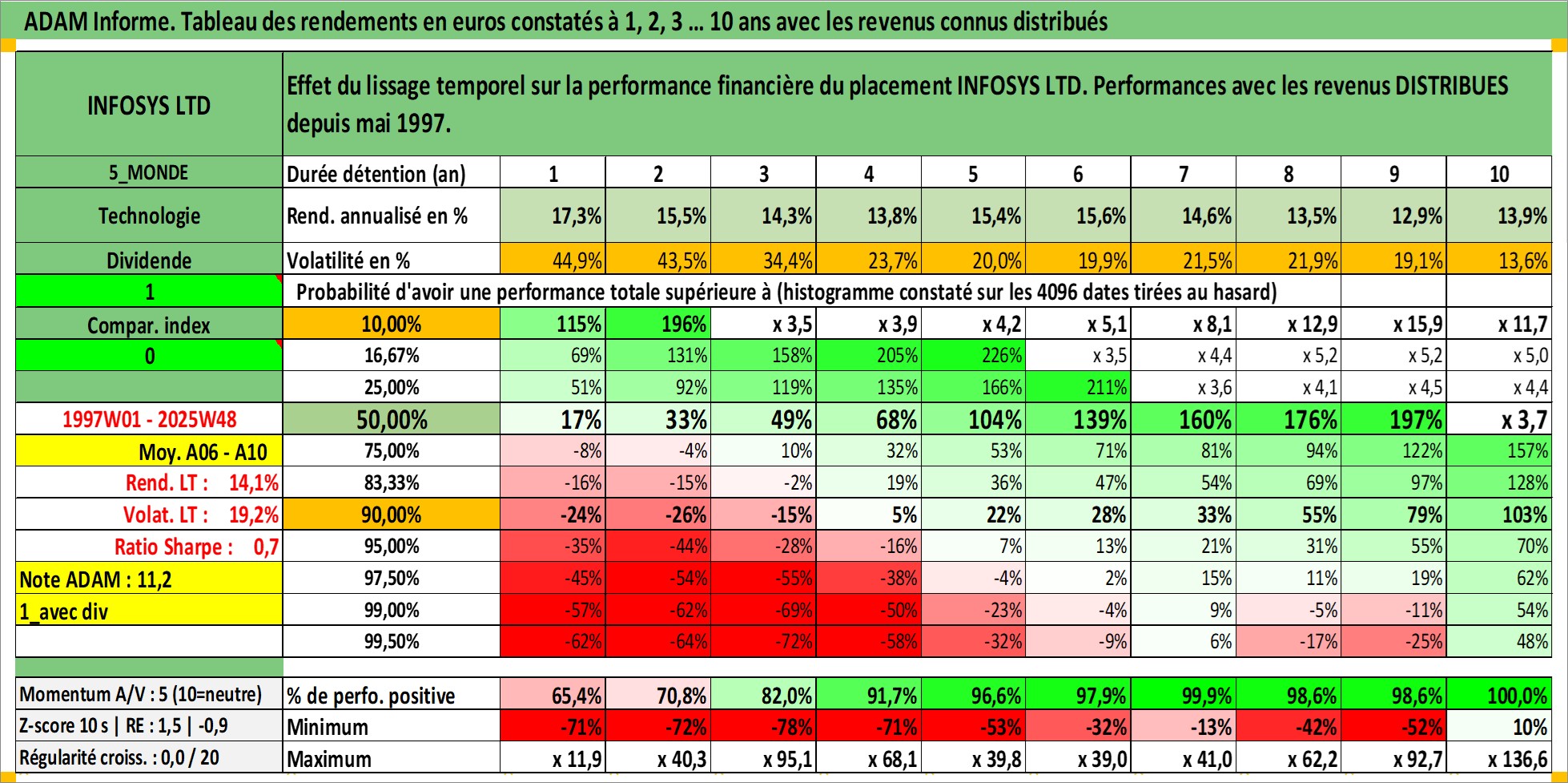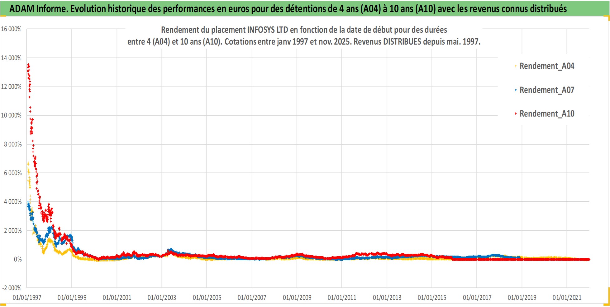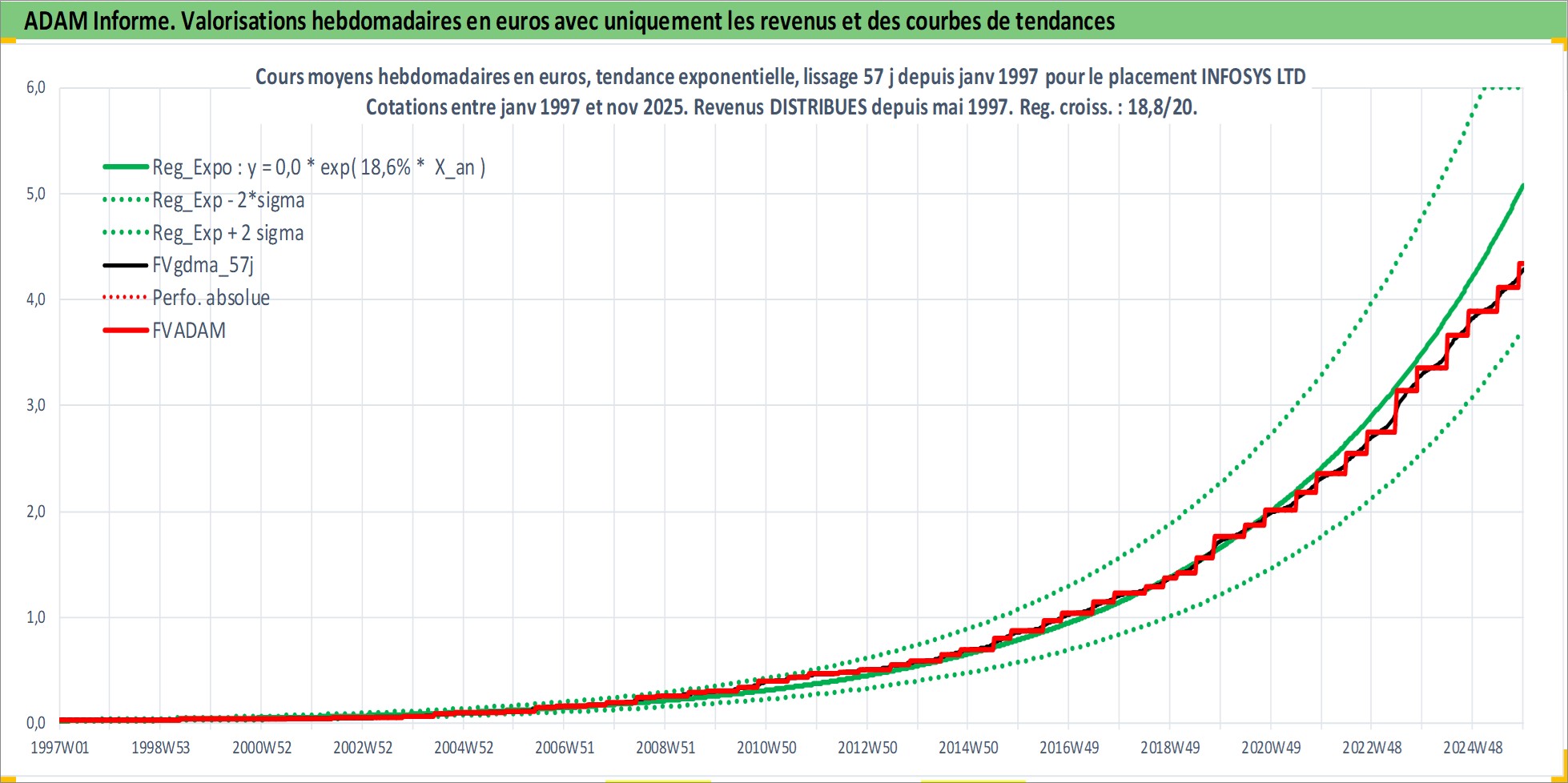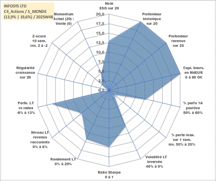 Site dédié aux investisseursPage dédiée sur site financeAnalyse des valorisations hebdomadaires de l'action INFOSYS LTD. Cet actif est cote en INR. Les valorisations sont en contrevaleur EURO et couvrent les semaines 1997W01 a 2025W48. Les revenus de cet actif financier sont pris en compte depuis la semaine 1997W21. La note globale ESG de cet actif est estimee a 13.0 (apres rebasage entre 0 et 20).