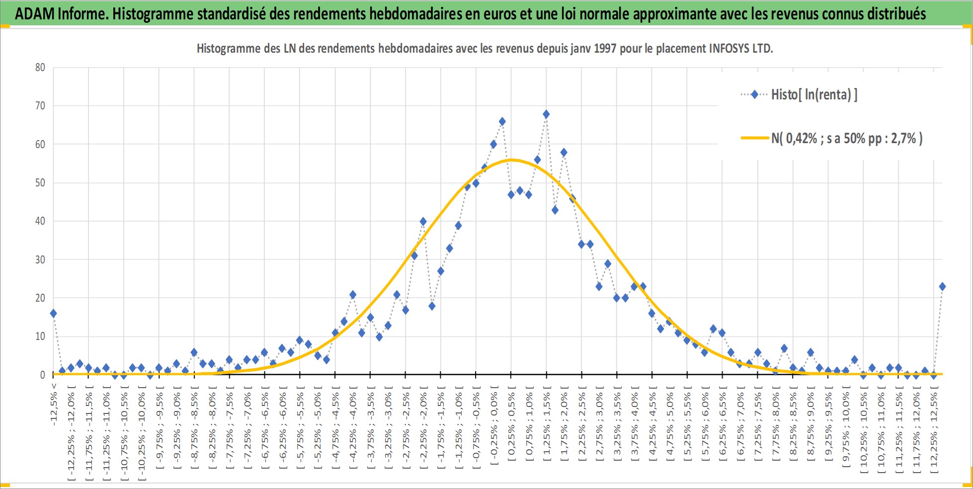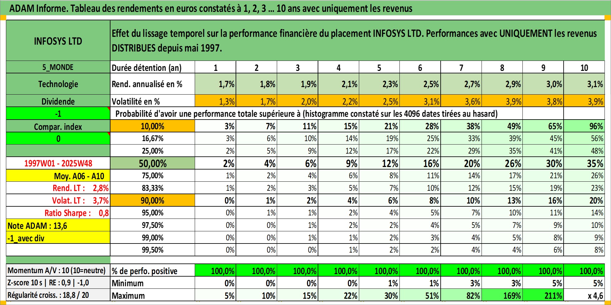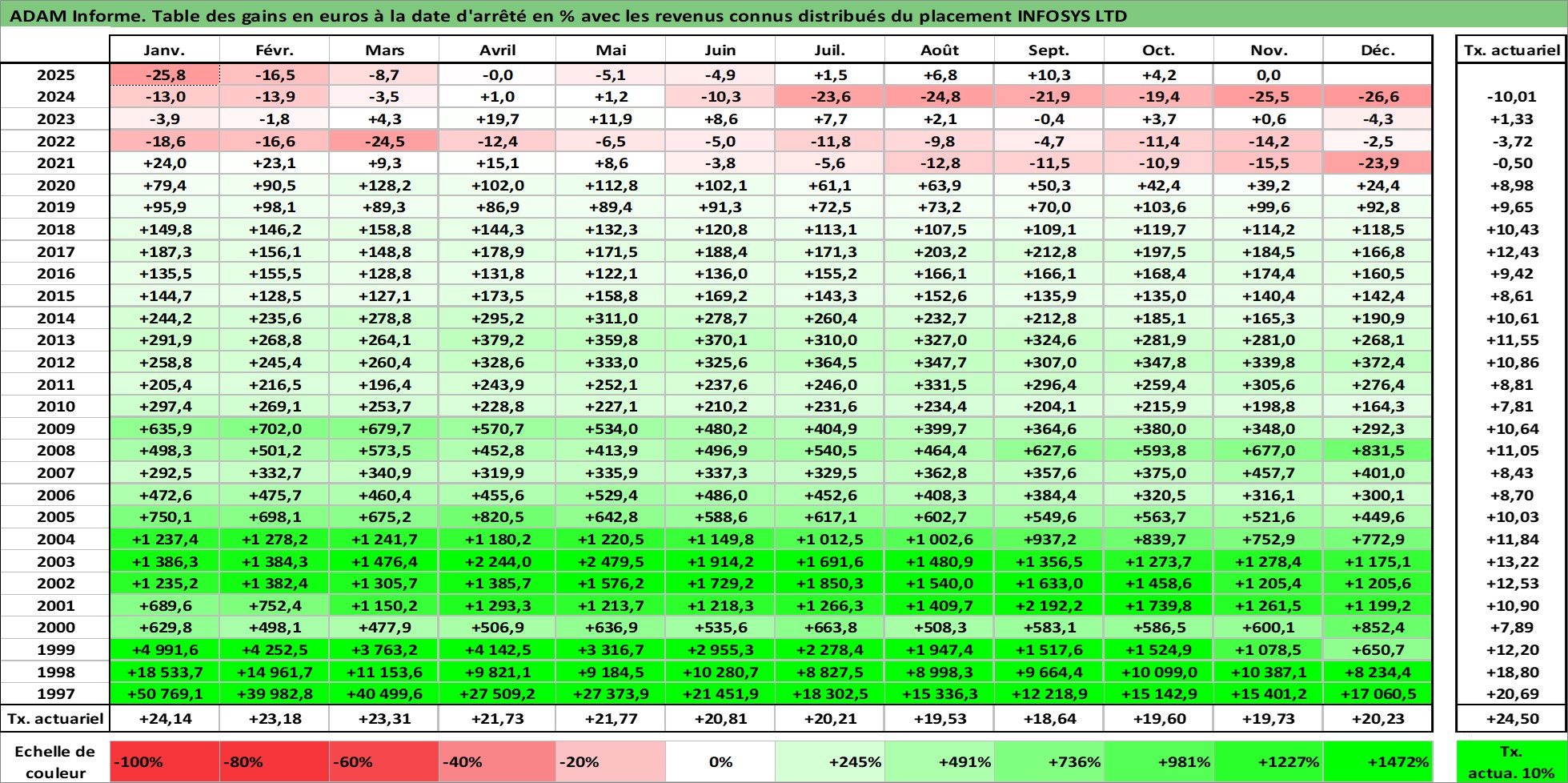 Site dédié aux investisseursPage dédiée sur site financeAnalyse des valorisations hebdomadaires de l'action INFOSYS LTD. Cet actif est cote en INR. Les valorisations sont en contrevaleur EURO et couvrent les semaines 1997W01 a 2025W48. Les revenus de cet actif financier sont pris en compte depuis la semaine 1997W21. La note globale ESG de cet actif est estimee a 13.0 (apres rebasage entre 0 et 20).