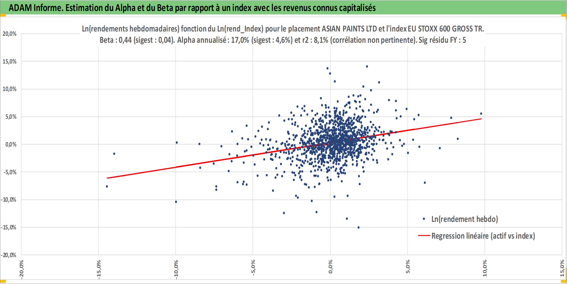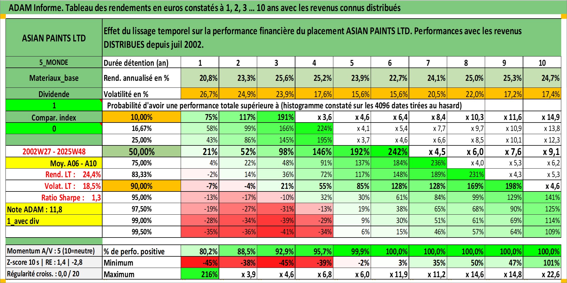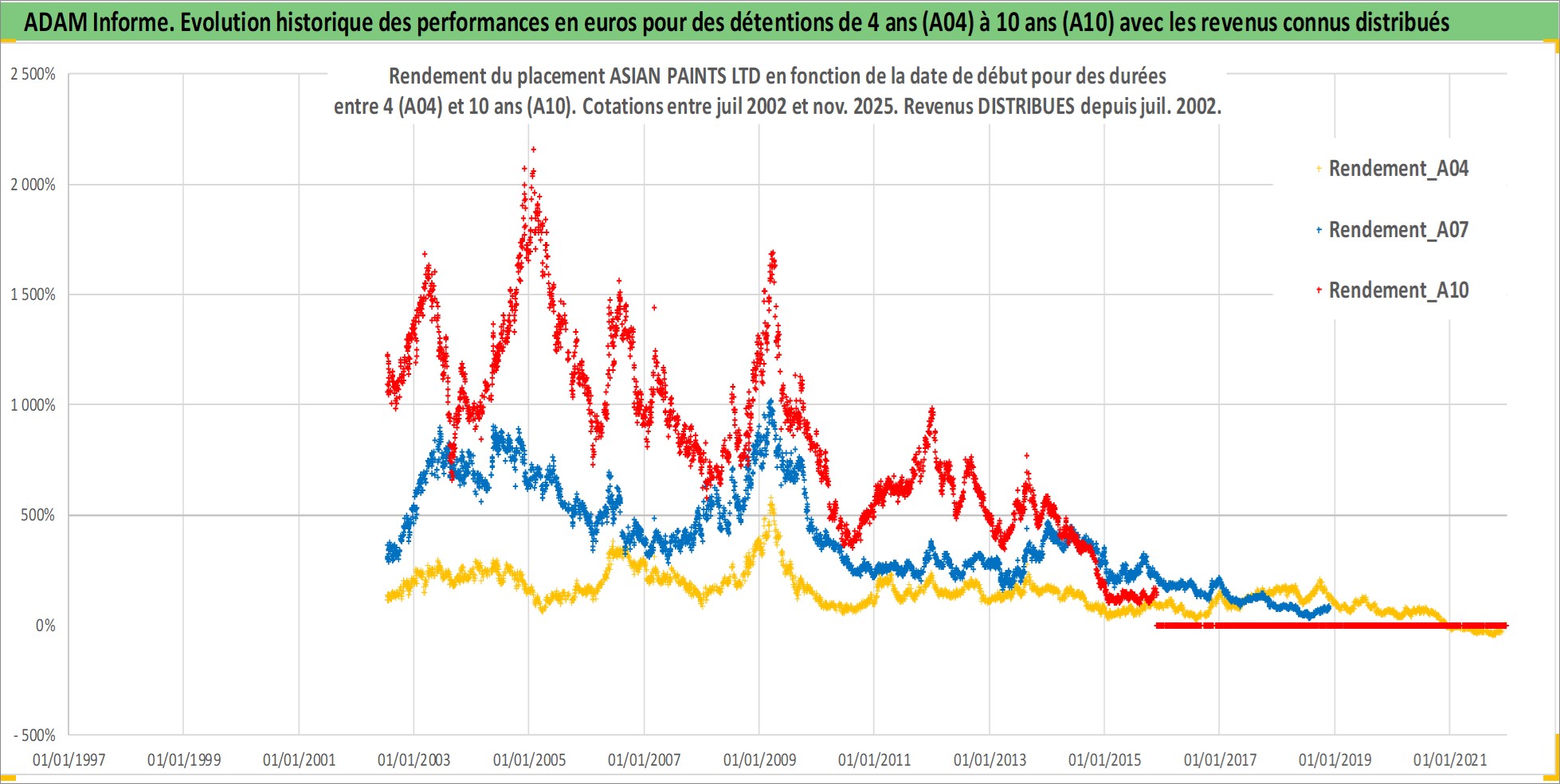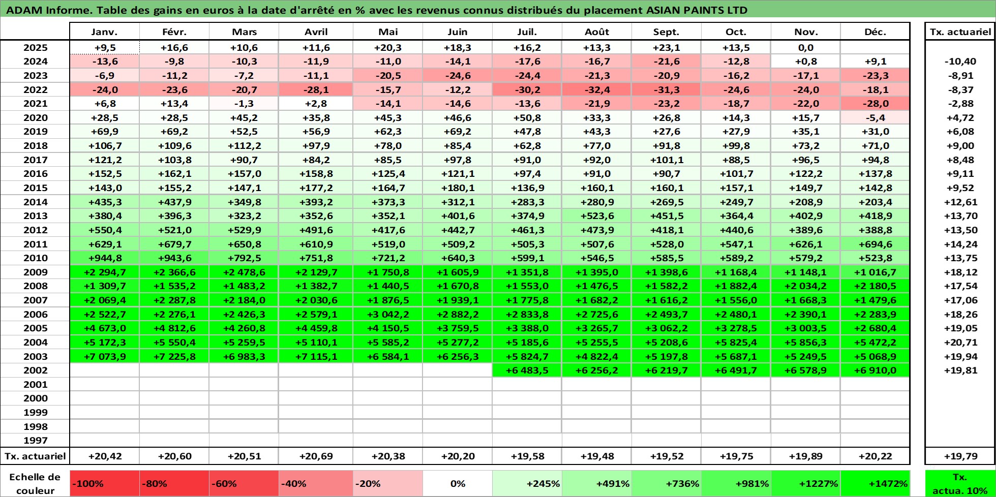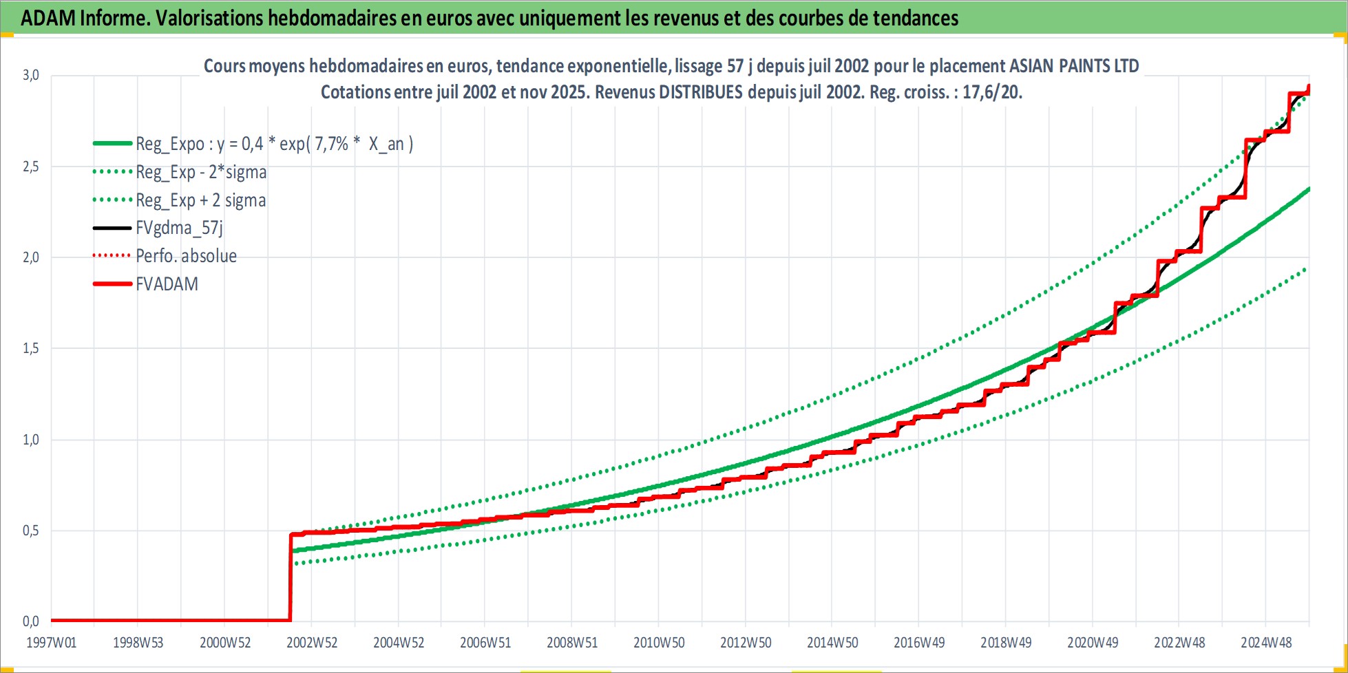 Site dédié aux investisseursPage dédiée sur site financeAnalyse des valorisations hebdomadaires de l'action ASIAN PAINTS LTD. Cet actif est cote en INR. Les valorisations sont en contrevaleur EURO et couvrent les semaines 2002W27 a 2025W48. Les revenus de cet actif financier sont pris en compte depuis la semaine 2002W28. La note globale ESG de cet actif est estimee a 5.0 (apres rebasage entre 0 et 20).