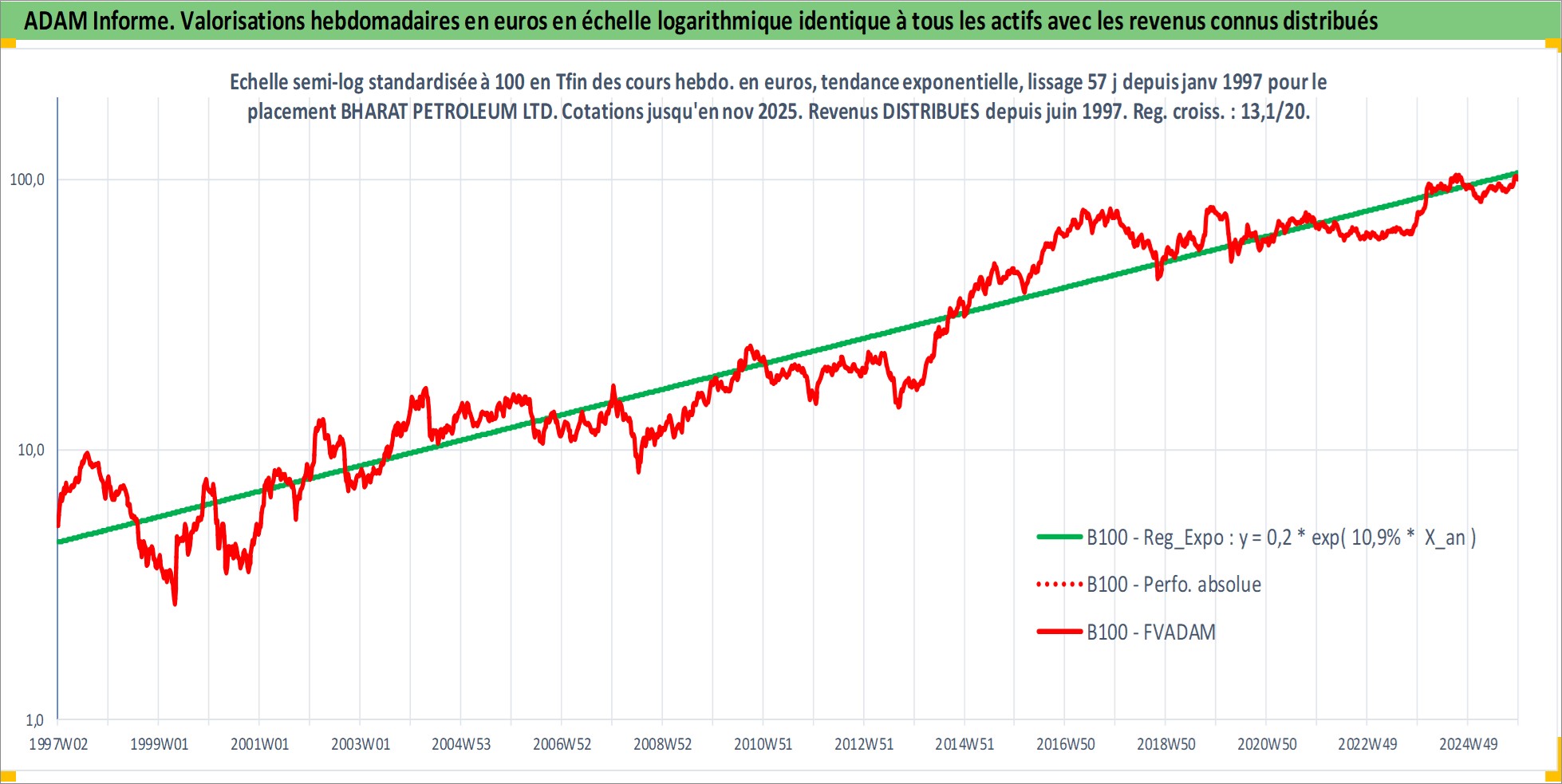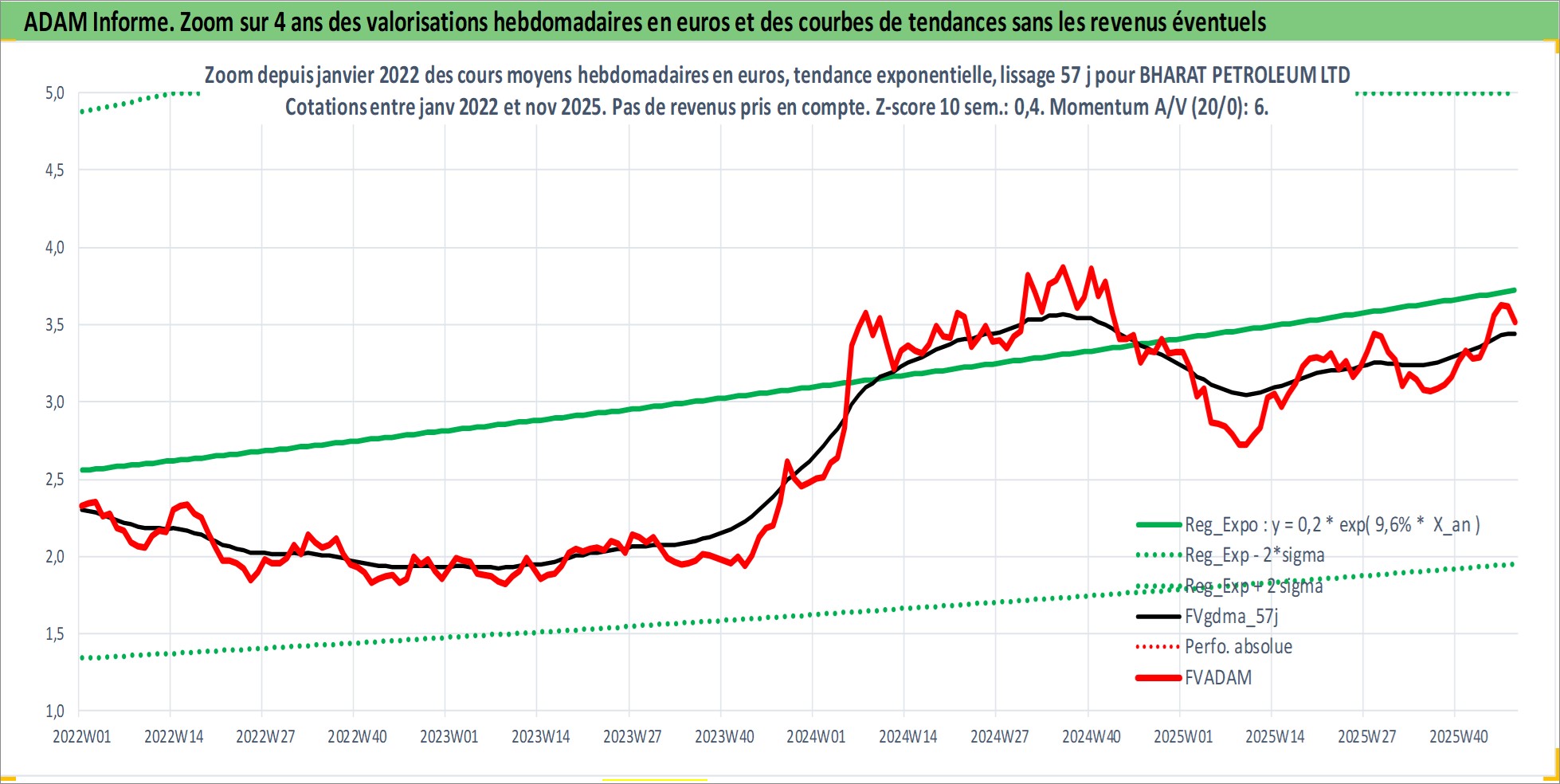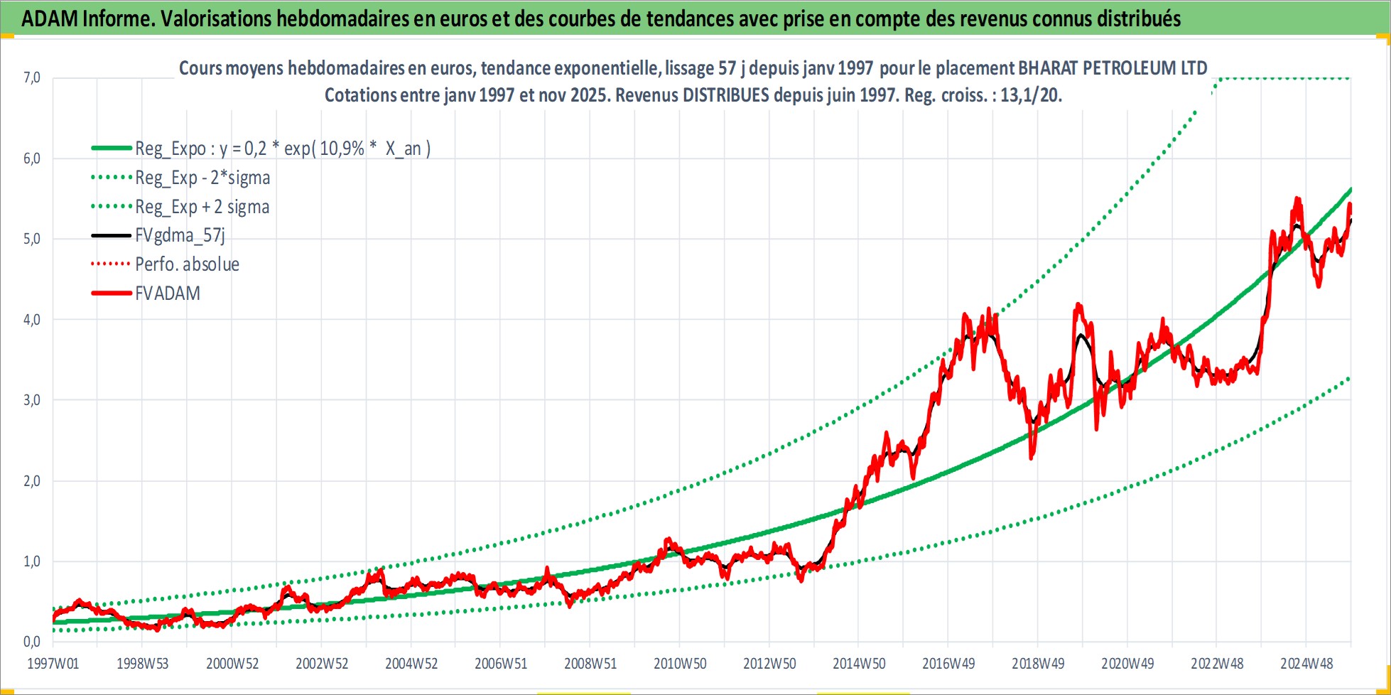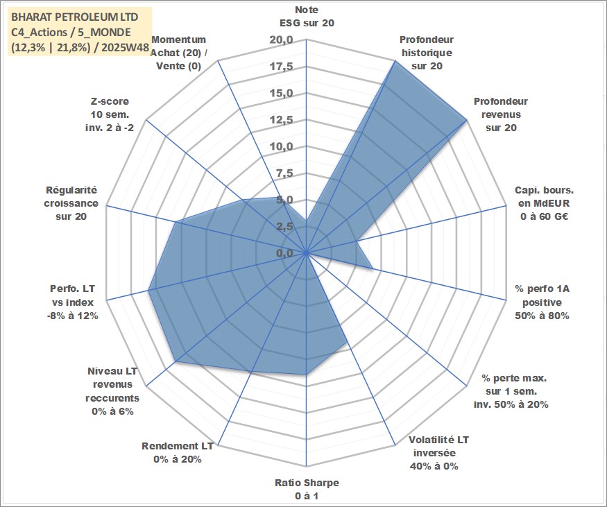 Site dédié aux investisseursPage dédiée sur site financeAnalyse des valorisations hebdomadaires de l'action BHARAT PETROLEUM LTD. Cet actif est cote en INR. Les valorisations sont en contrevaleur EURO et couvrent les semaines 1997W01 a 2025W48. Les revenus de cet actif financier sont pris en compte depuis la semaine 1997W26. La note globale ESG de cet actif est estimee a 3.0 (apres rebasage entre 0 et 20).