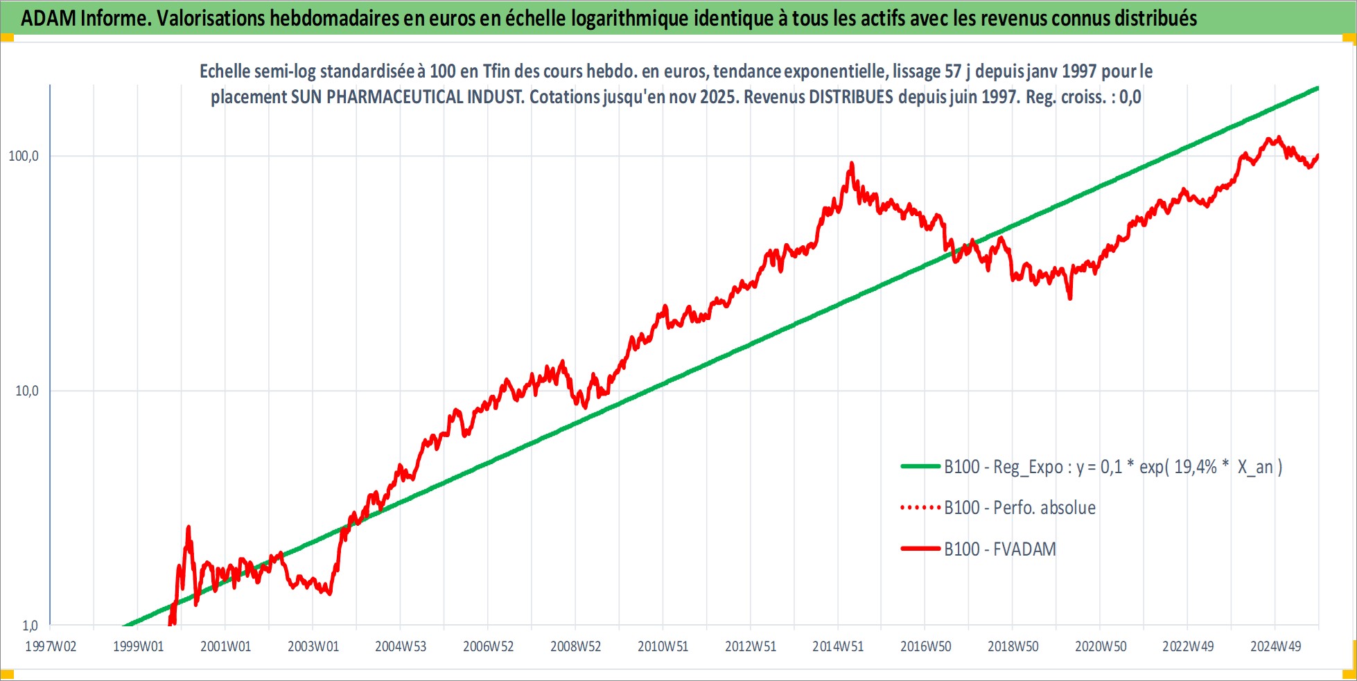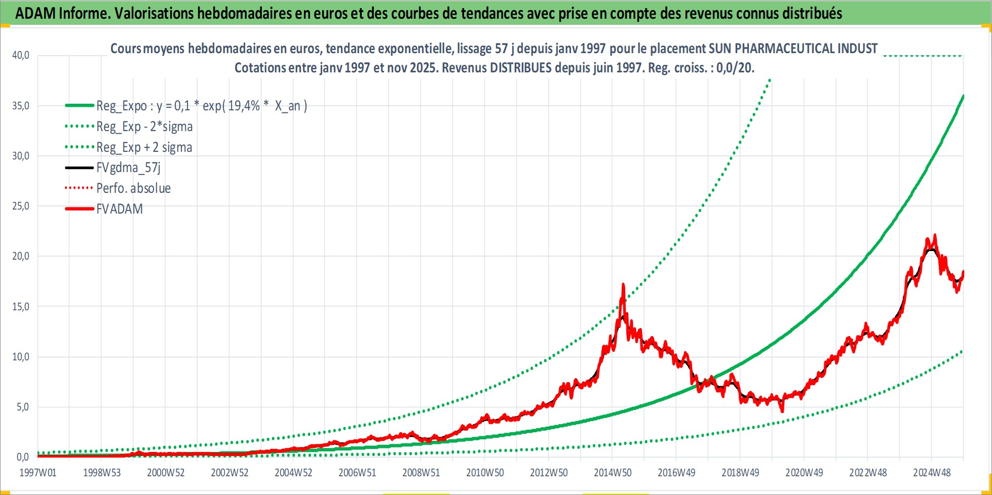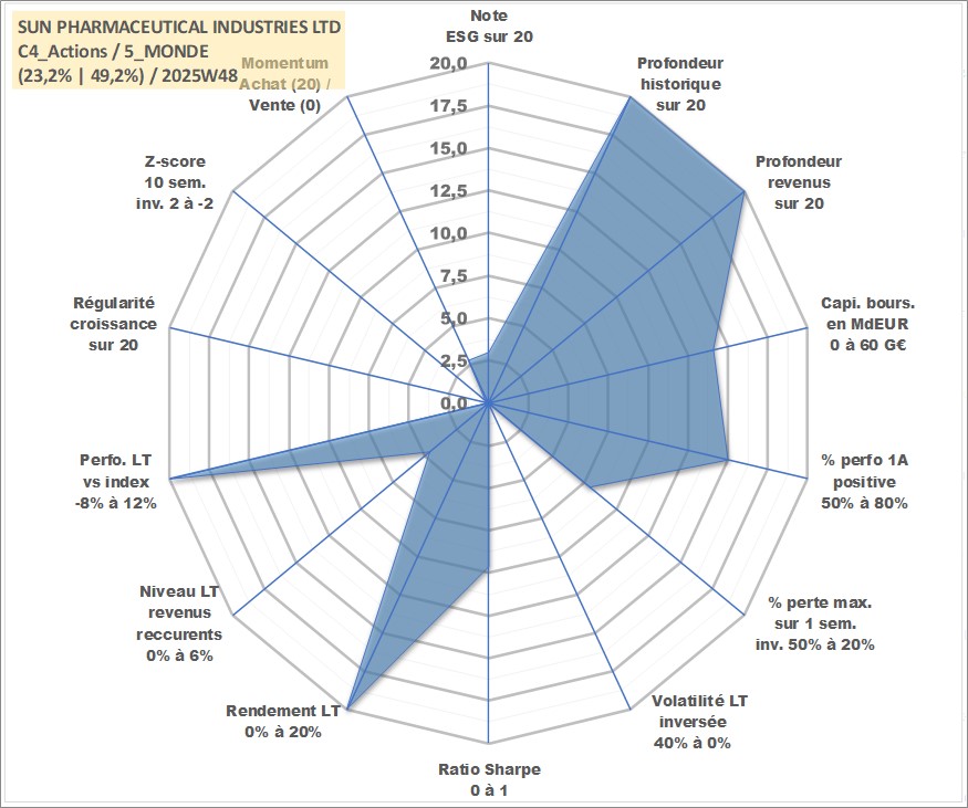 Site dédié aux investisseursPage dédiée sur site financeAnalyse des valorisations hebdomadaires de l'action SUN PHARMACEUTICAL INDUSTRIES LTD. Cet actif est cote en INR. Les valorisations sont en contrevaleur EURO et couvrent les semaines 1997W01 a 2025W48. Les revenus de cet actif financier sont pris en compte depuis la semaine 1997W24. La note globale ESG de cet actif est estimee a 3.0 (apres rebasage entre 0 et 20).