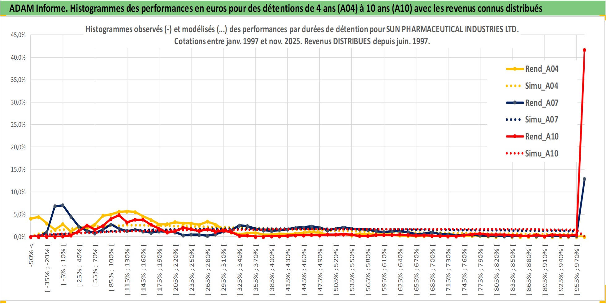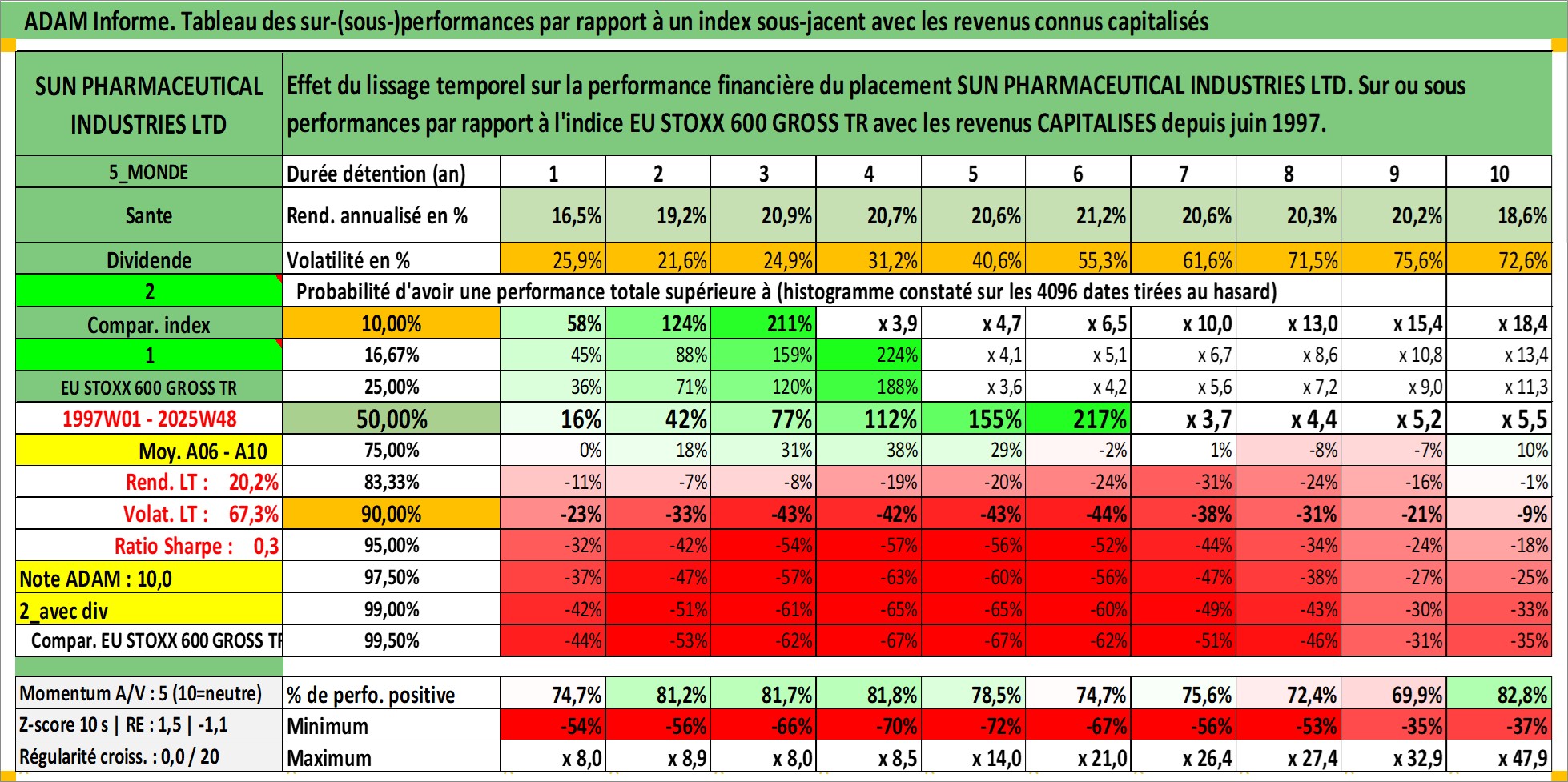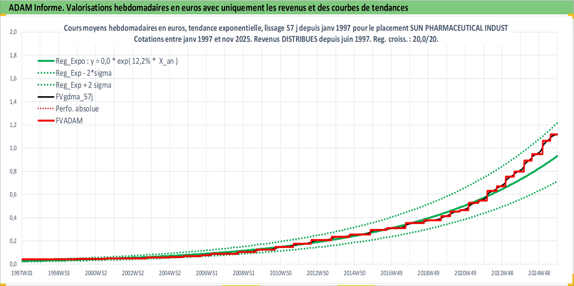 Site dédié aux investisseursPage dédiée sur site financeAnalyse des valorisations hebdomadaires de l'action SUN PHARMACEUTICAL INDUSTRIES LTD. Cet actif est cote en INR. Les valorisations sont en contrevaleur EURO et couvrent les semaines 1997W01 a 2025W48. Les revenus de cet actif financier sont pris en compte depuis la semaine 1997W24. La note globale ESG de cet actif est estimee a 3.0 (apres rebasage entre 0 et 20).
