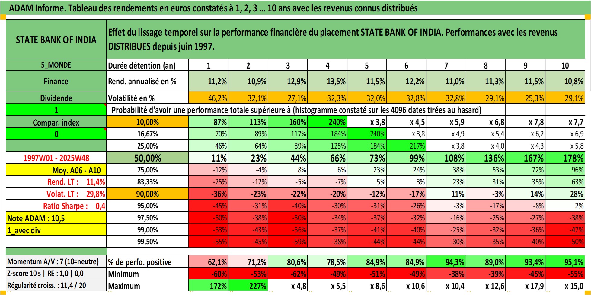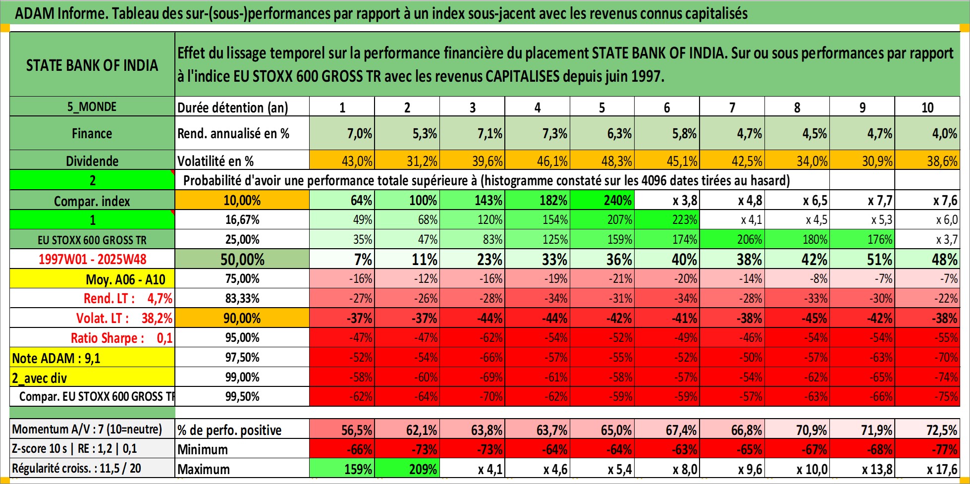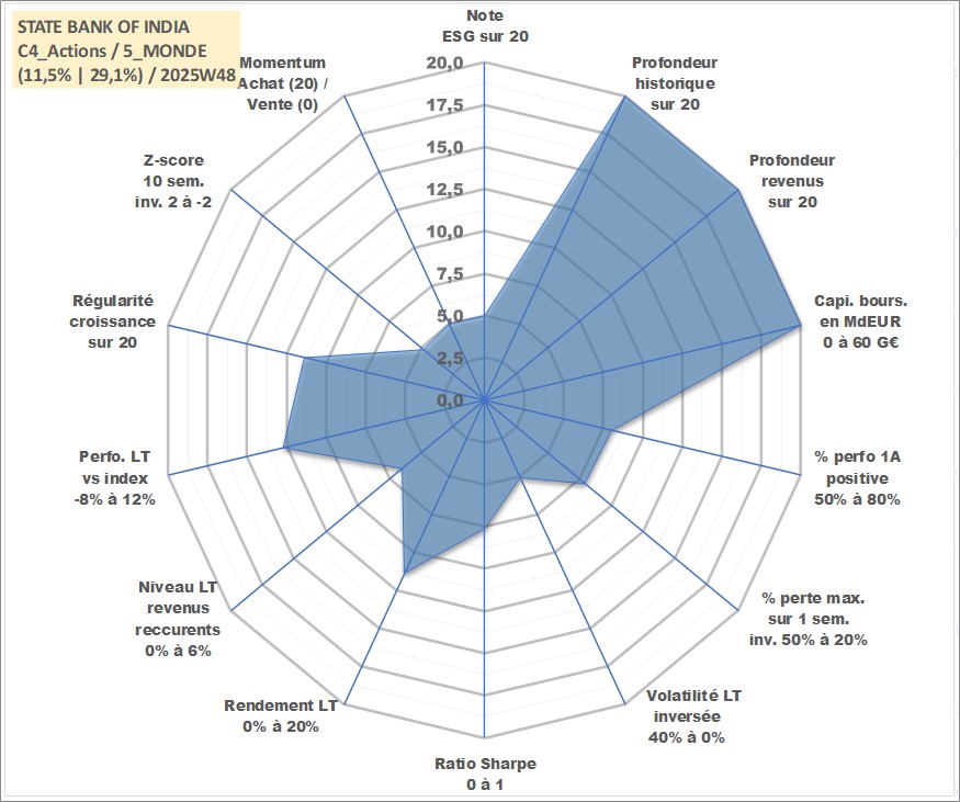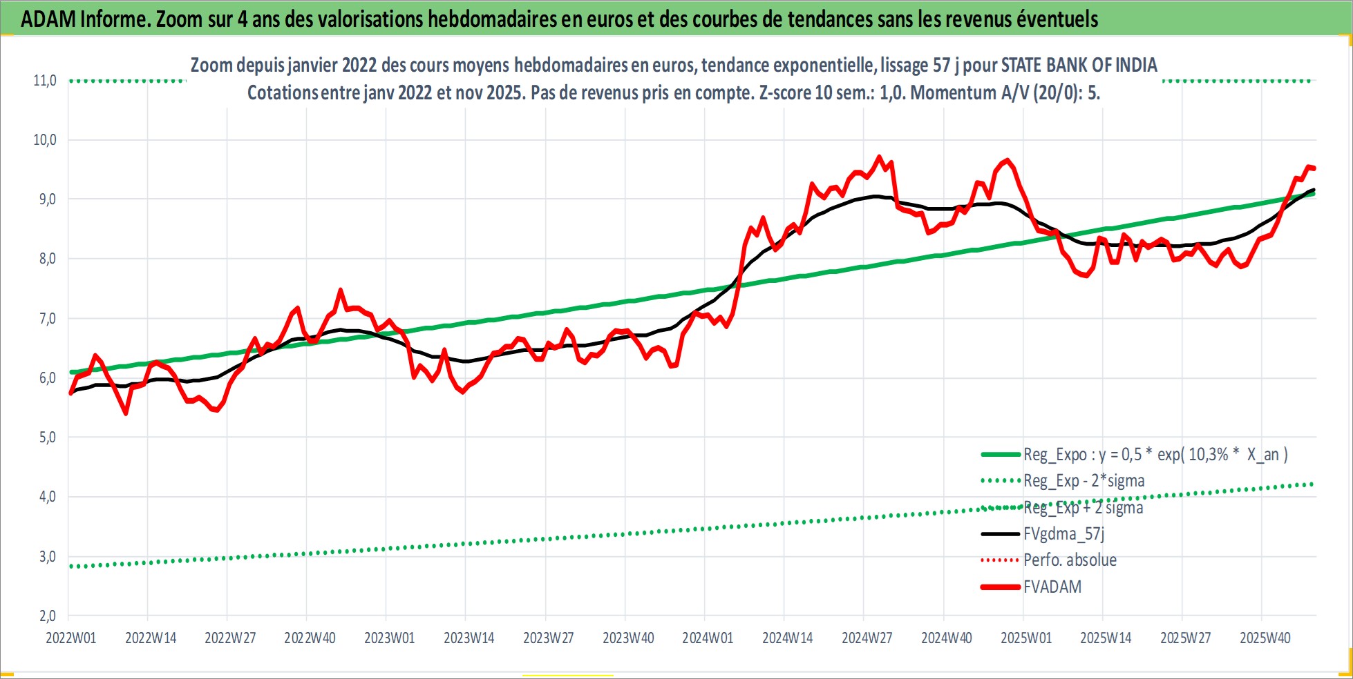 Site dédié aux investisseursPage dédiée sur site financeAnalyse des valorisations hebdomadaires de l'action STATE BANK OF INDIA. Cet actif est cote en INR. Les valorisations sont en contrevaleur EURO et couvrent les semaines 1997W01 a 2025W48. Les revenus de cet actif financier sont pris en compte depuis la semaine 1997W25. La note globale ESG de cet actif est estimee a 5.0 (apres rebasage entre 0 et 20).