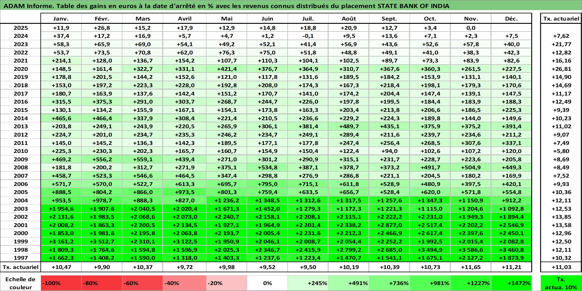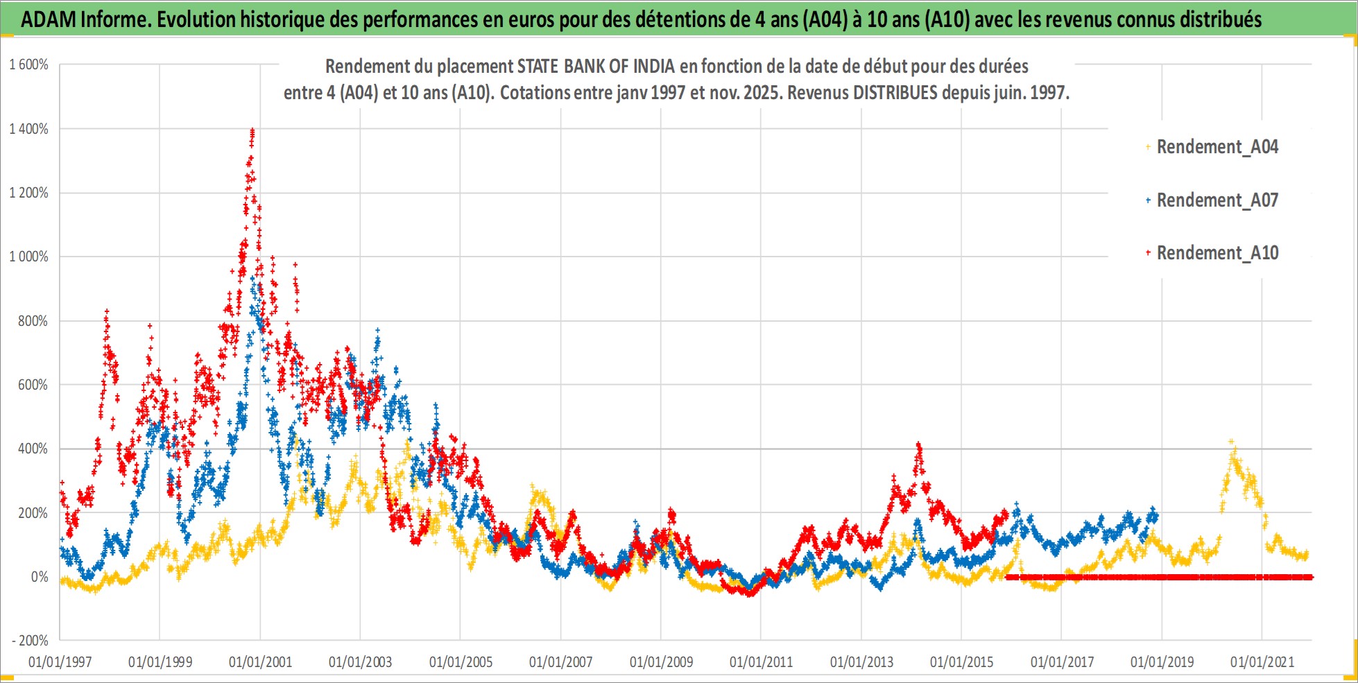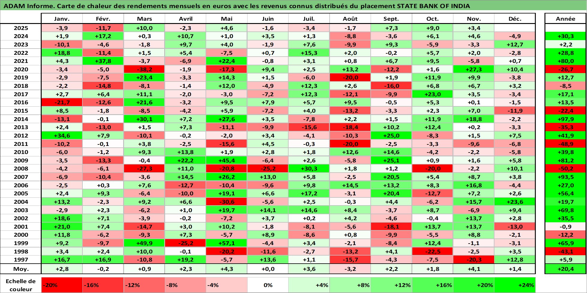 Site dédié aux investisseursPage dédiée sur site financeAnalyse des valorisations hebdomadaires de l'action STATE BANK OF INDIA. Cet actif est cote en INR. Les valorisations sont en contrevaleur EURO et couvrent les semaines 1997W01 a 2025W48. Les revenus de cet actif financier sont pris en compte depuis la semaine 1997W25. La note globale ESG de cet actif est estimee a 5.0 (apres rebasage entre 0 et 20).