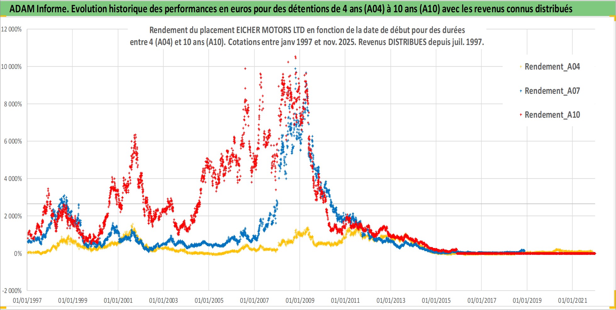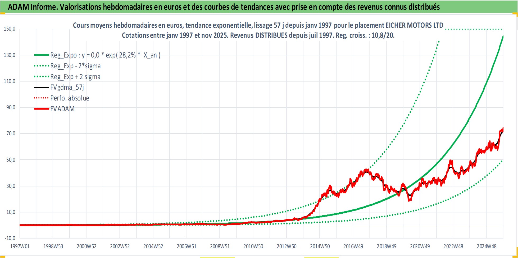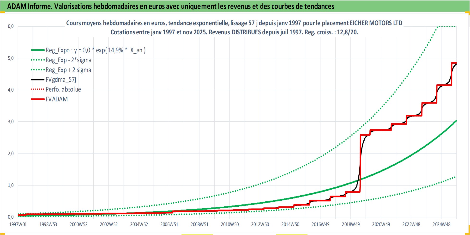 Site dédié aux investisseursPage dédiée sur site financeAnalyse des valorisations hebdomadaires de l'action EICHER MOTORS LTD. Cet actif est cote en INR. Les valorisations sont en contrevaleur EURO et couvrent les semaines 1997W01 a 2025W48. Les revenus de cet actif financier sont pris en compte depuis la semaine 1997W30. La note globale ESG de cet actif est estimee a 15.0 (apres rebasage entre 0 et 20).