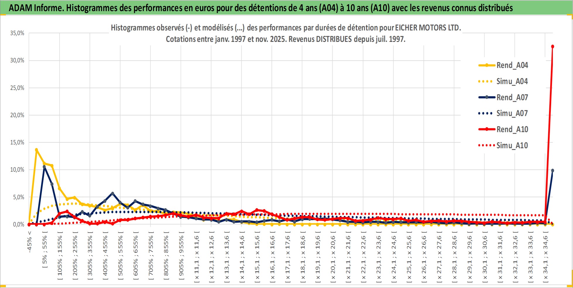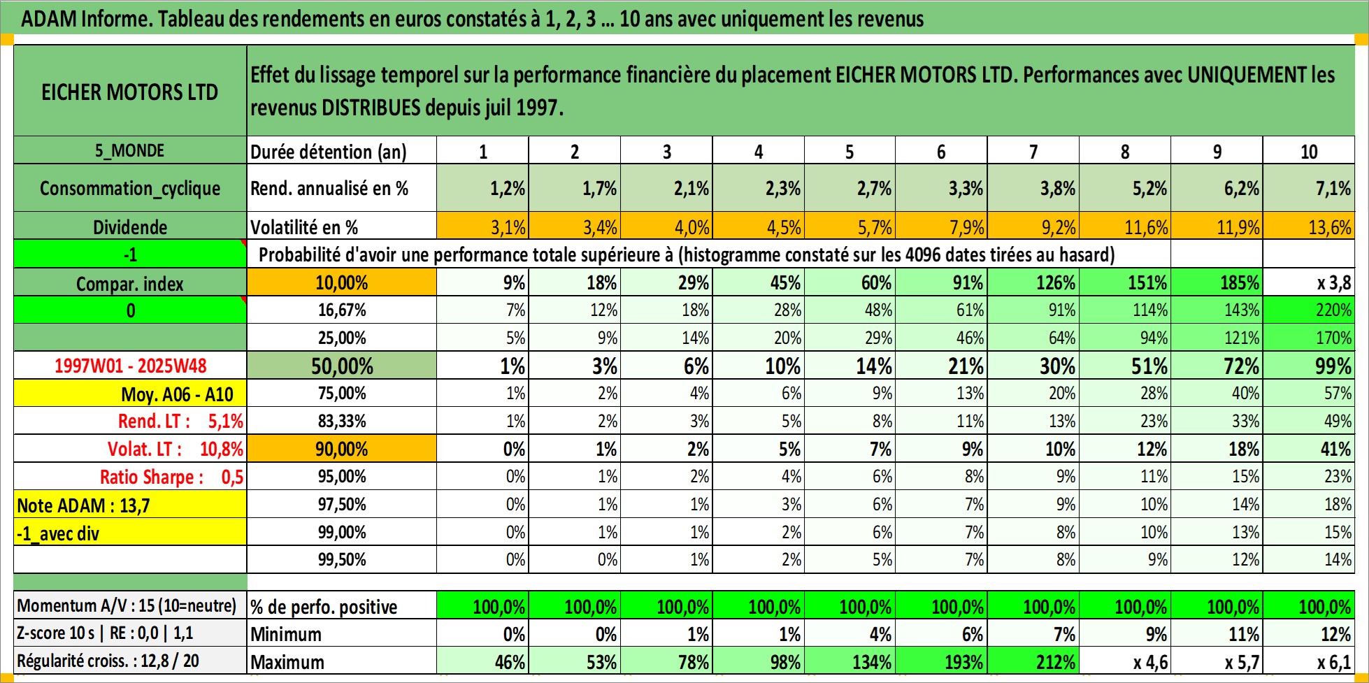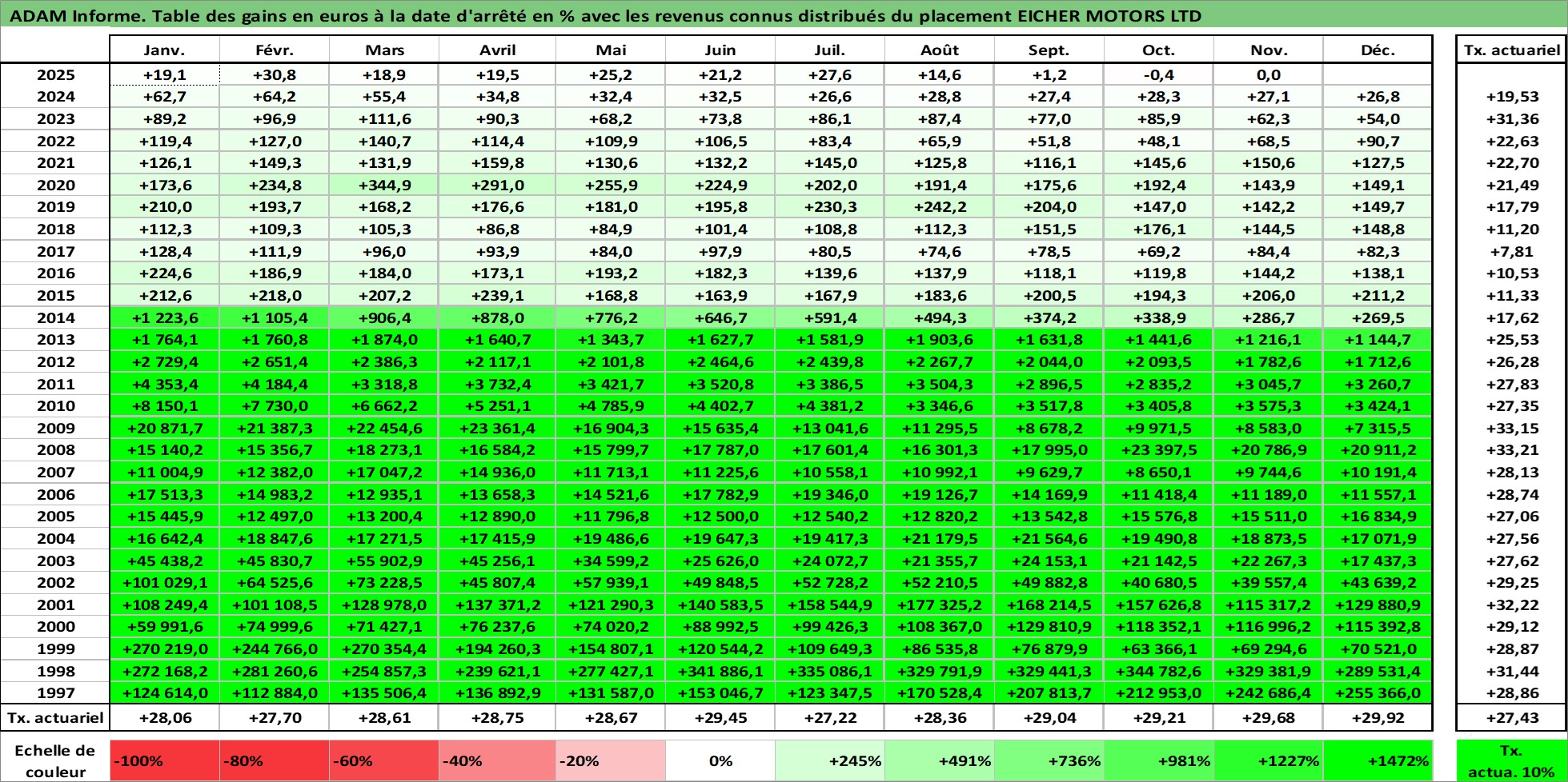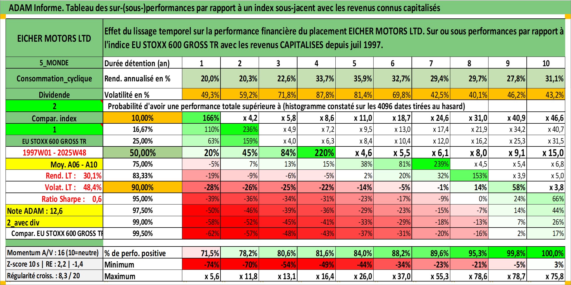 Site dédié aux investisseursPage dédiée sur site financeAnalyse des valorisations hebdomadaires de l'action EICHER MOTORS LTD. Cet actif est cote en INR. Les valorisations sont en contrevaleur EURO et couvrent les semaines 1997W01 a 2025W48. Les revenus de cet actif financier sont pris en compte depuis la semaine 1997W30. La note globale ESG de cet actif est estimee a 15.0 (apres rebasage entre 0 et 20).