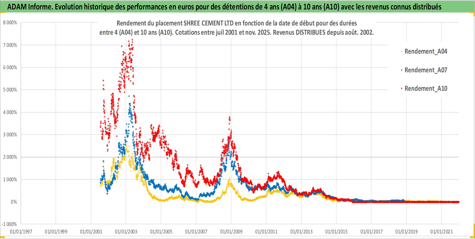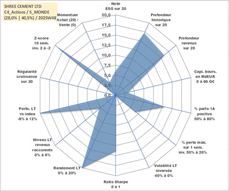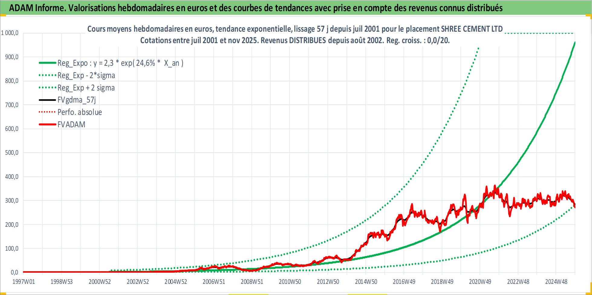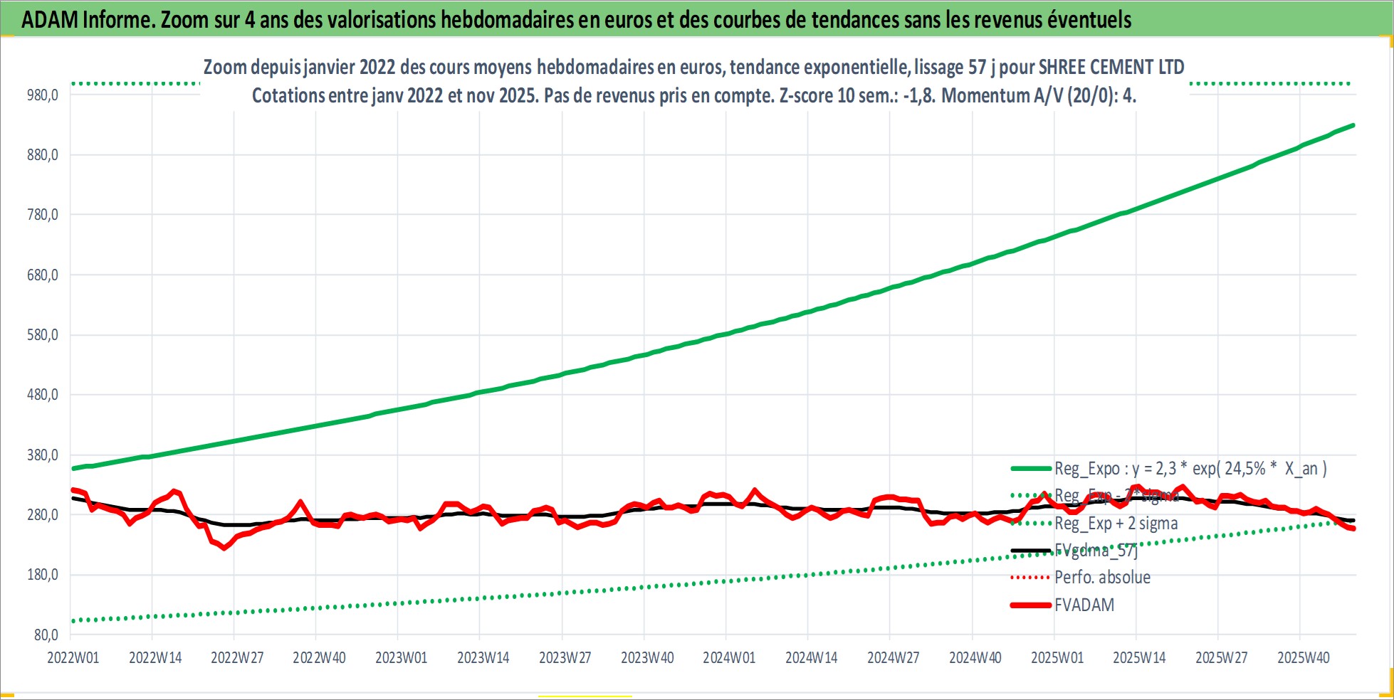 Site dédié aux investisseursPage dédiée sur site financeAnalyse des valorisations hebdomadaires de l'action SHREE CEMENT LTD. Cet actif est cote en INR. Les valorisations sont en contrevaleur EURO et couvrent les semaines 2001W27 a 2025W48. Les revenus de cet actif financier sont pris en compte depuis la semaine 2002W33. La note globale ESG de cet actif est estimee a 6.0 (apres rebasage entre 0 et 20).