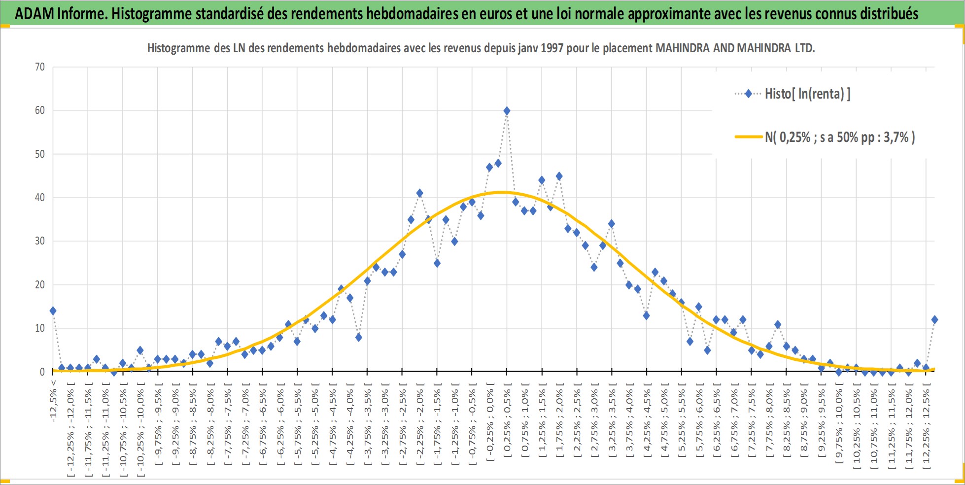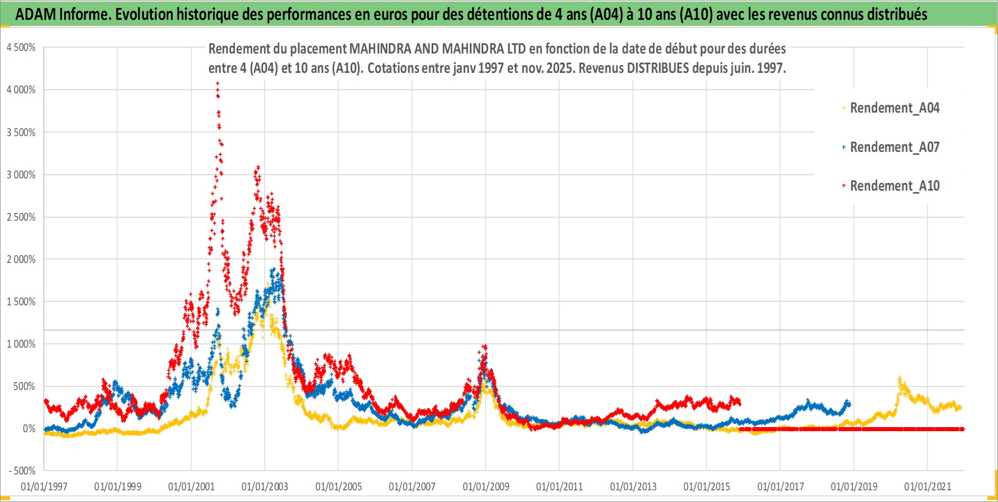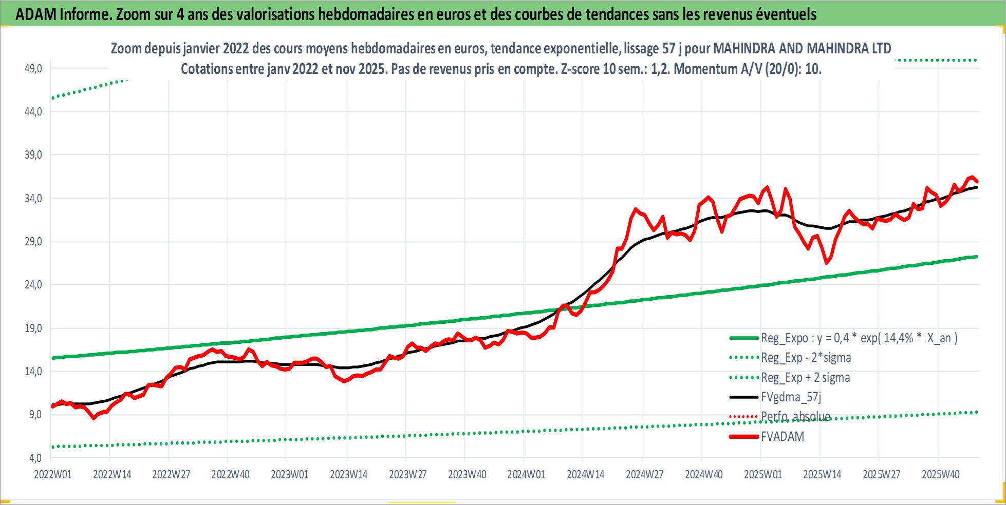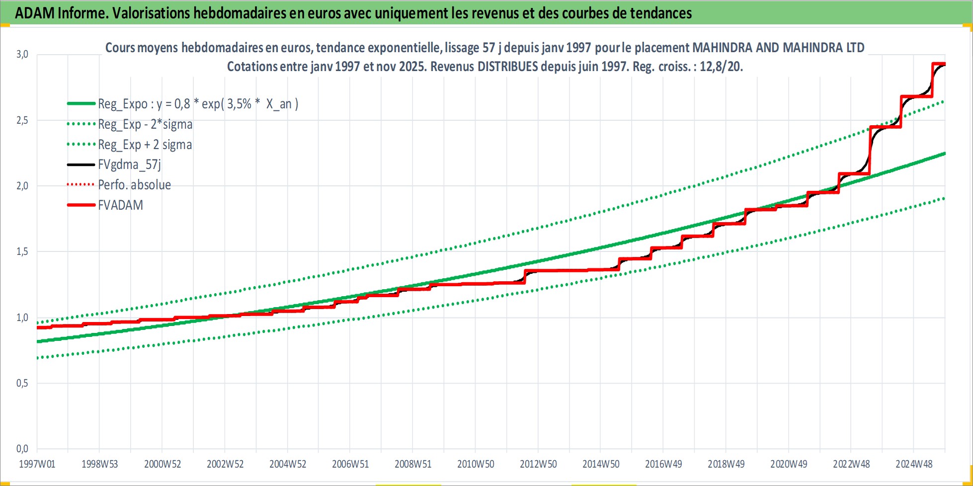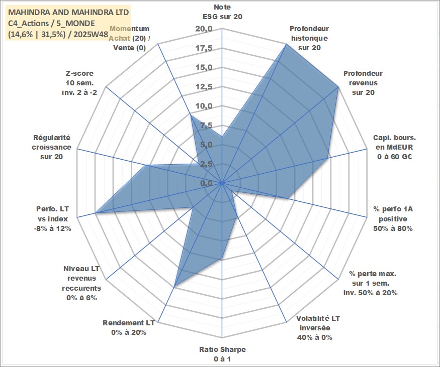 Site dédié aux investisseursPage dédiée sur site financeAnalyse des valorisations hebdomadaires de l'action MAHINDRA AND MAHINDRA LTD. Cet actif est cote en INR. Les valorisations sont en contrevaleur EURO et couvrent les semaines 1997W01 a 2025W48. Les revenus de cet actif financier sont pris en compte depuis la semaine 1997W25. La note globale ESG de cet actif est estimee a 6.0 (apres rebasage entre 0 et 20).