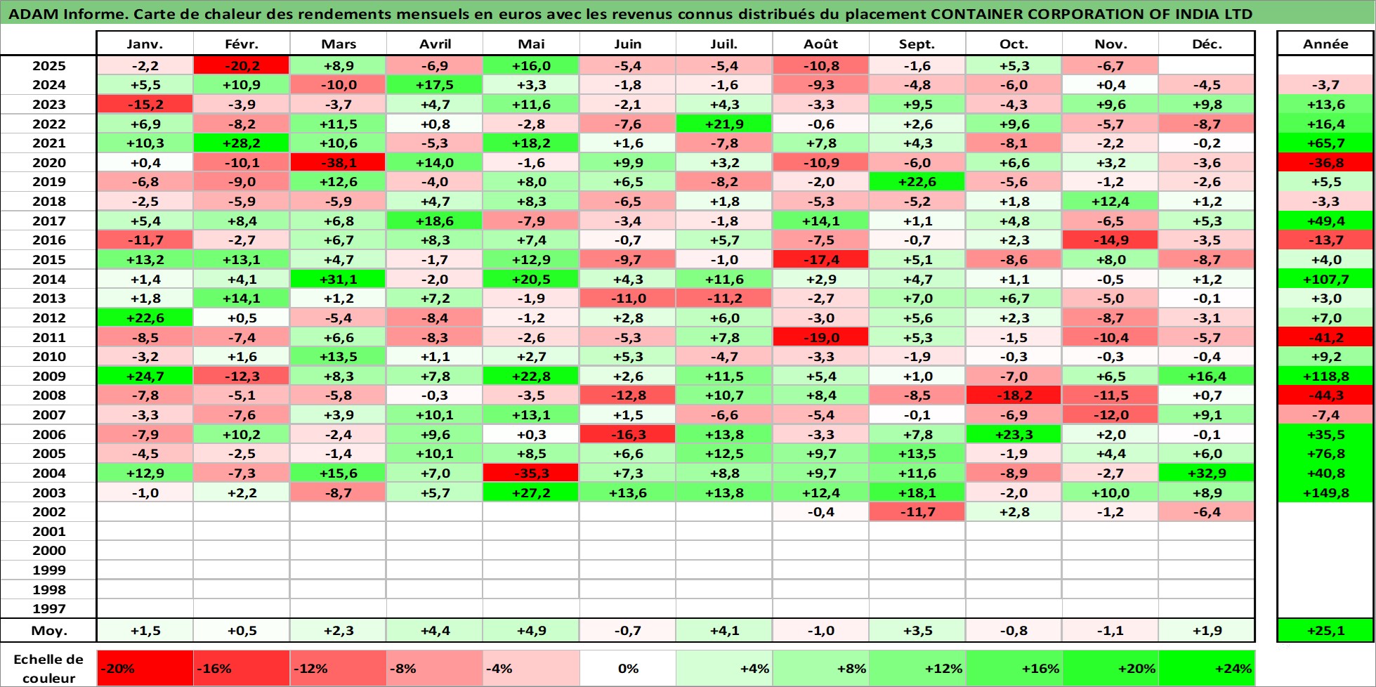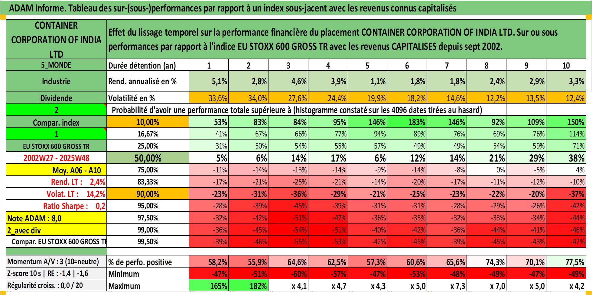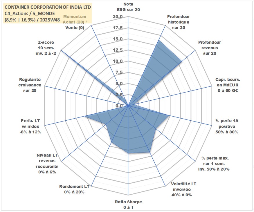 Site dédié aux investisseursPage dédiée sur site financeAnalyse des valorisations hebdomadaires de l'action CONTAINER CORPORATION OF INDIA LTD. Cet actif est cote en INR. Les valorisations sont en contrevaleur EURO et couvrent les semaines 2002W27 a 2025W48. Les revenus de cet actif financier sont pris en compte depuis la semaine 2002W37. La note ESG de cet actif n'est pas connue.