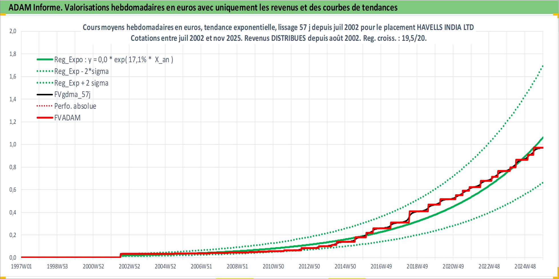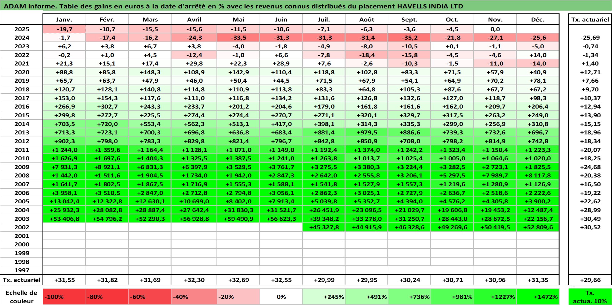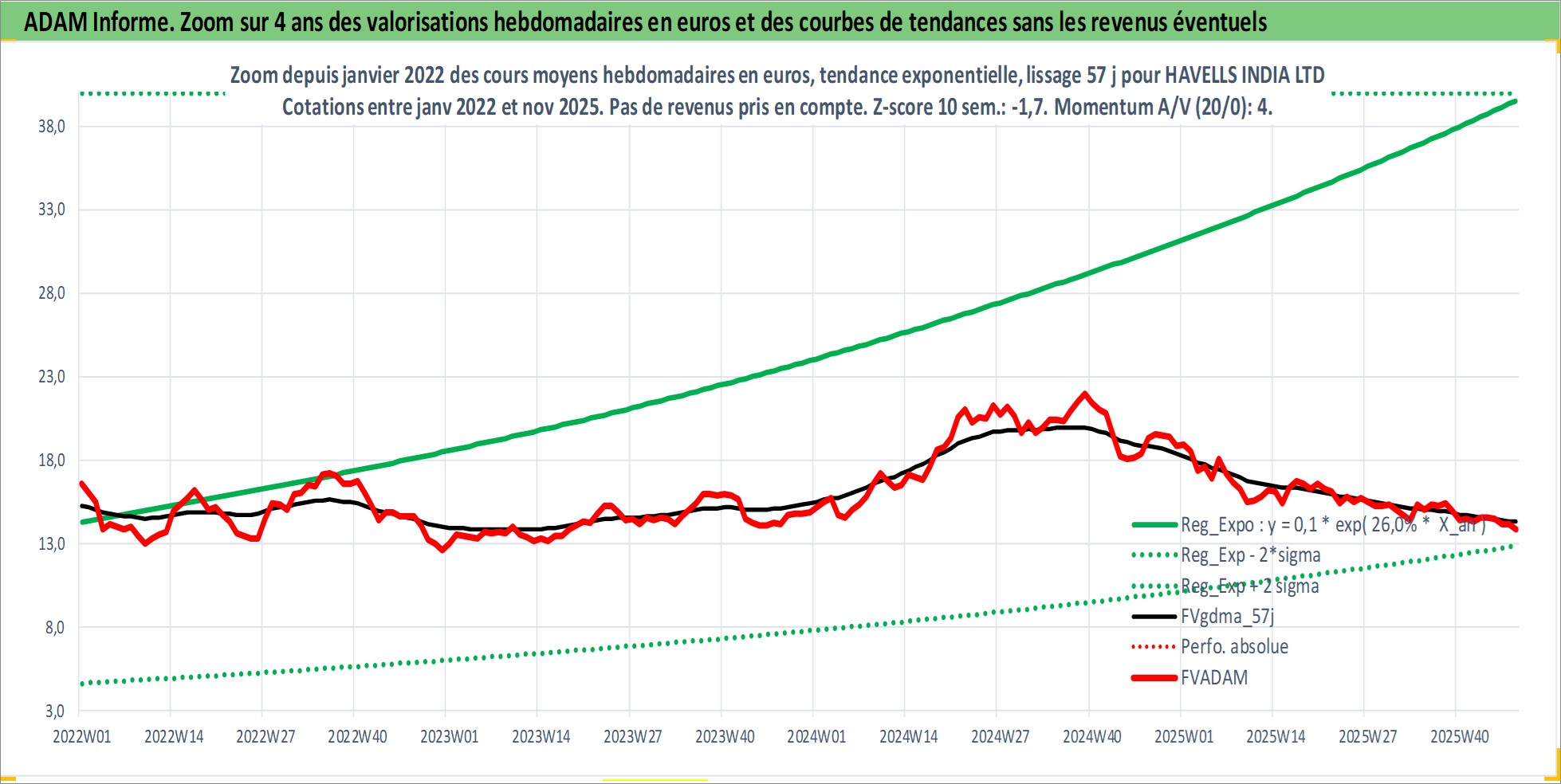 Site dédié aux investisseursPage dédiée sur site financeAnalyse des valorisations hebdomadaires de l'action HAVELLS INDIA LTD. Cet actif est cote en INR. Les valorisations sont en contrevaleur EURO et couvrent les semaines 2002W27 a 2025W48. Les revenus de cet actif financier sont pris en compte depuis la semaine 2002W32. La note ESG de cet actif n'est pas connue.