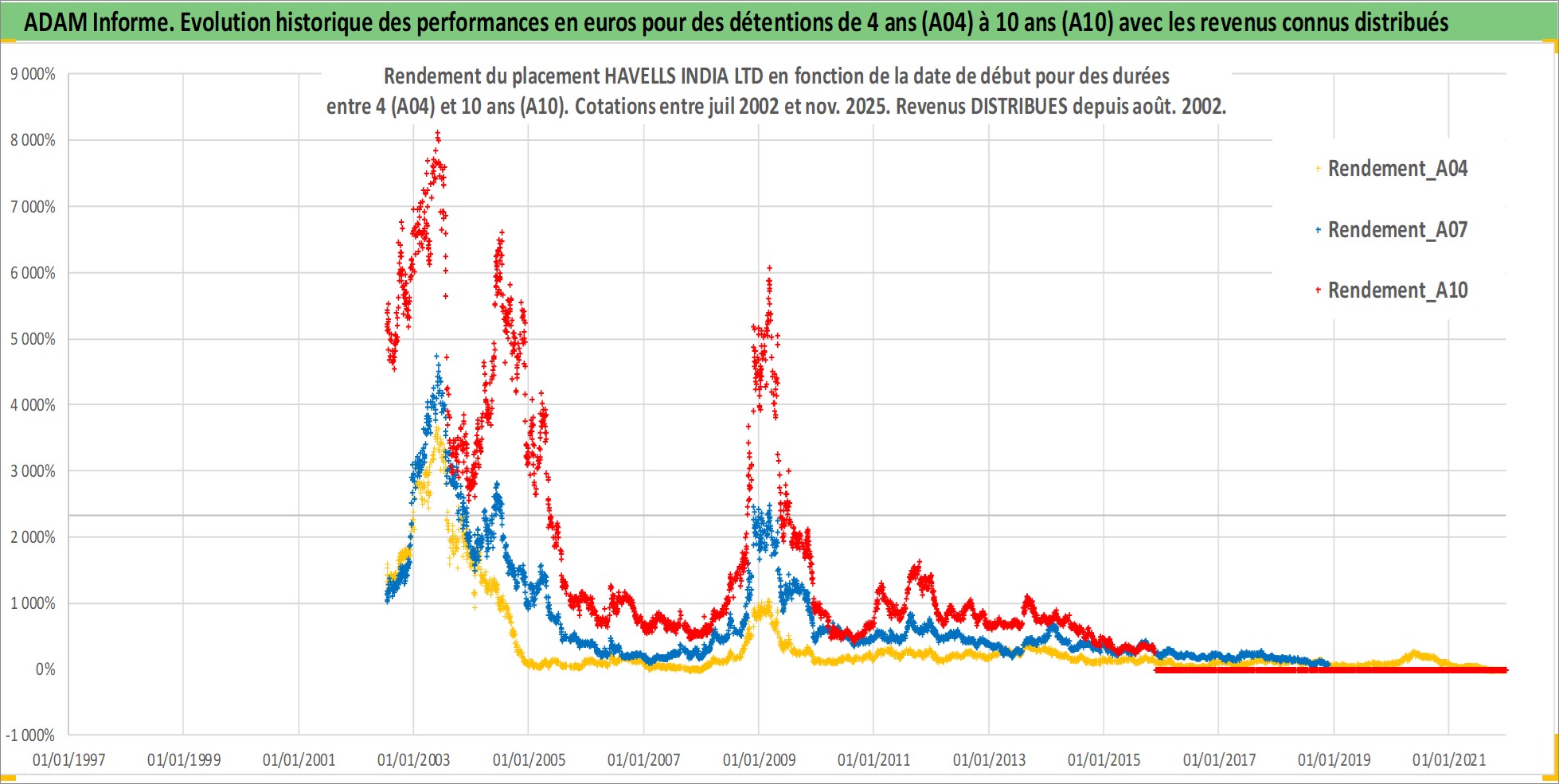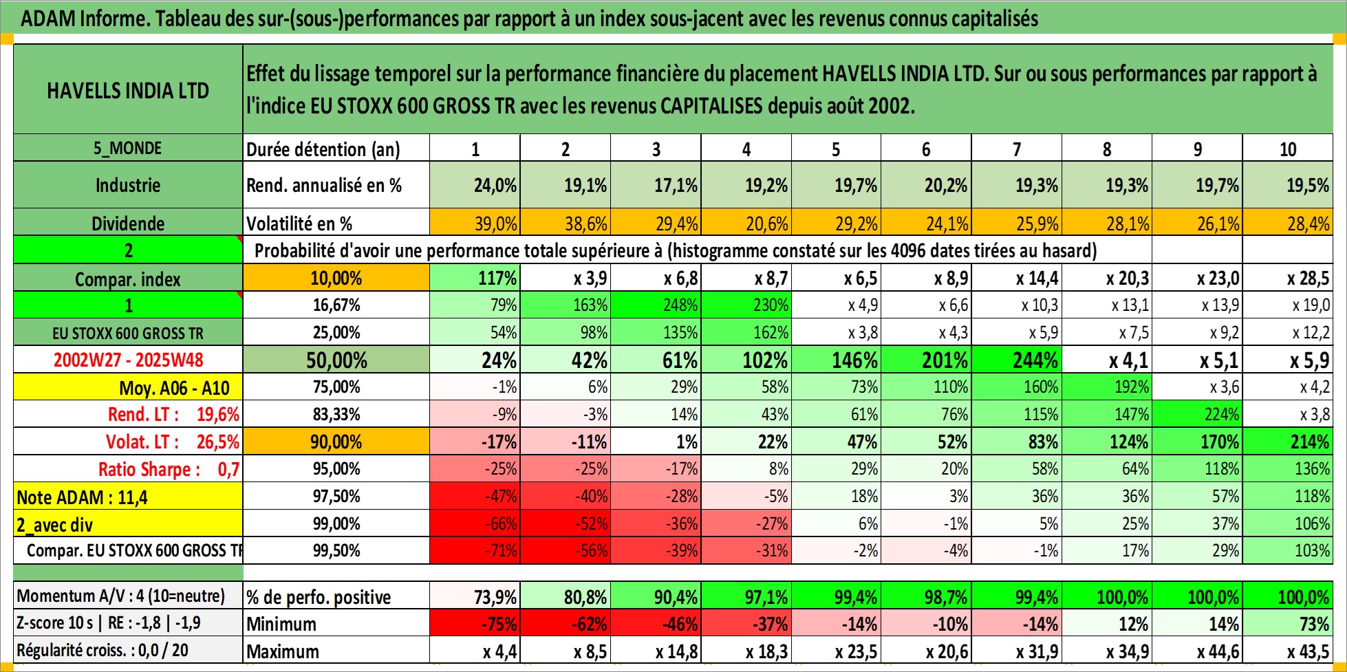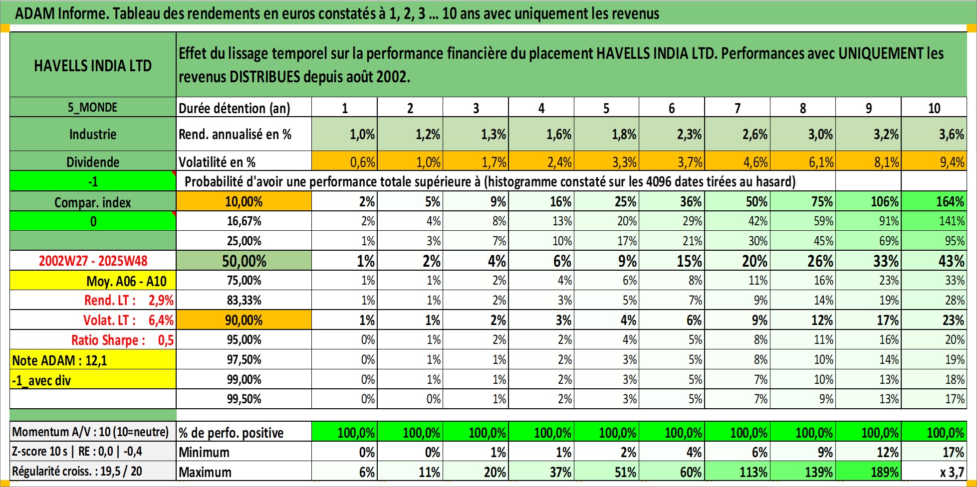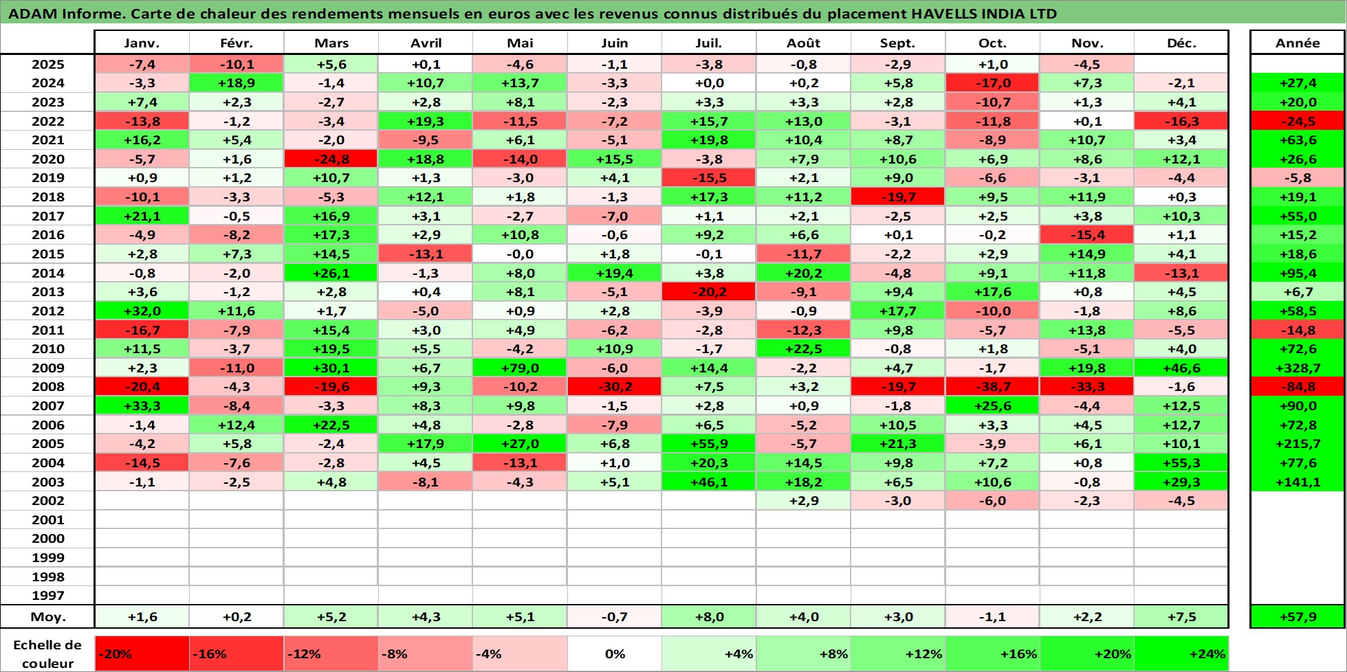 Site dédié aux investisseursPage dédiée sur site financeAnalyse des valorisations hebdomadaires de l'action HAVELLS INDIA LTD. Cet actif est cote en INR. Les valorisations sont en contrevaleur EURO et couvrent les semaines 2002W27 a 2025W48. Les revenus de cet actif financier sont pris en compte depuis la semaine 2002W32. La note ESG de cet actif n'est pas connue.
