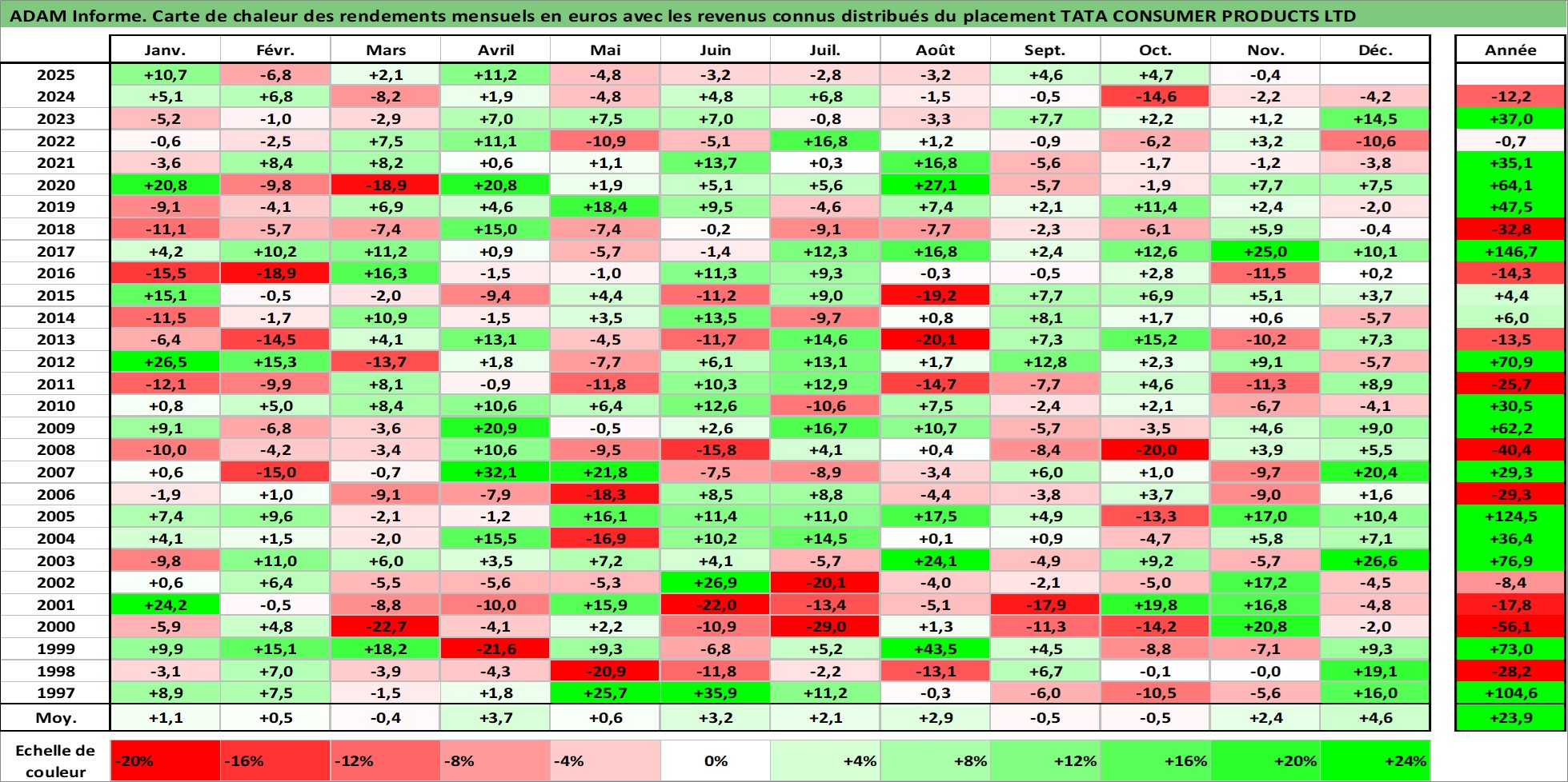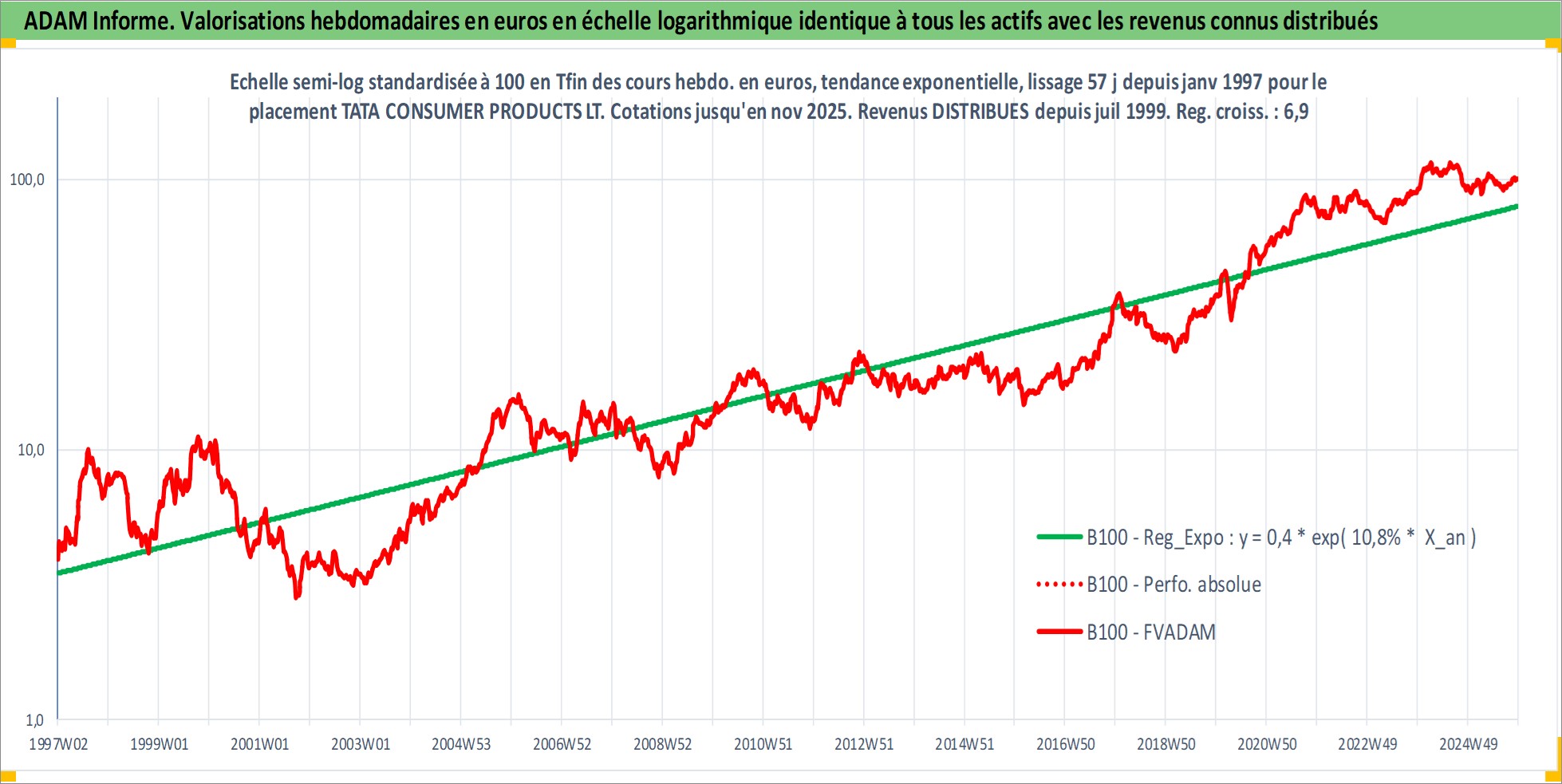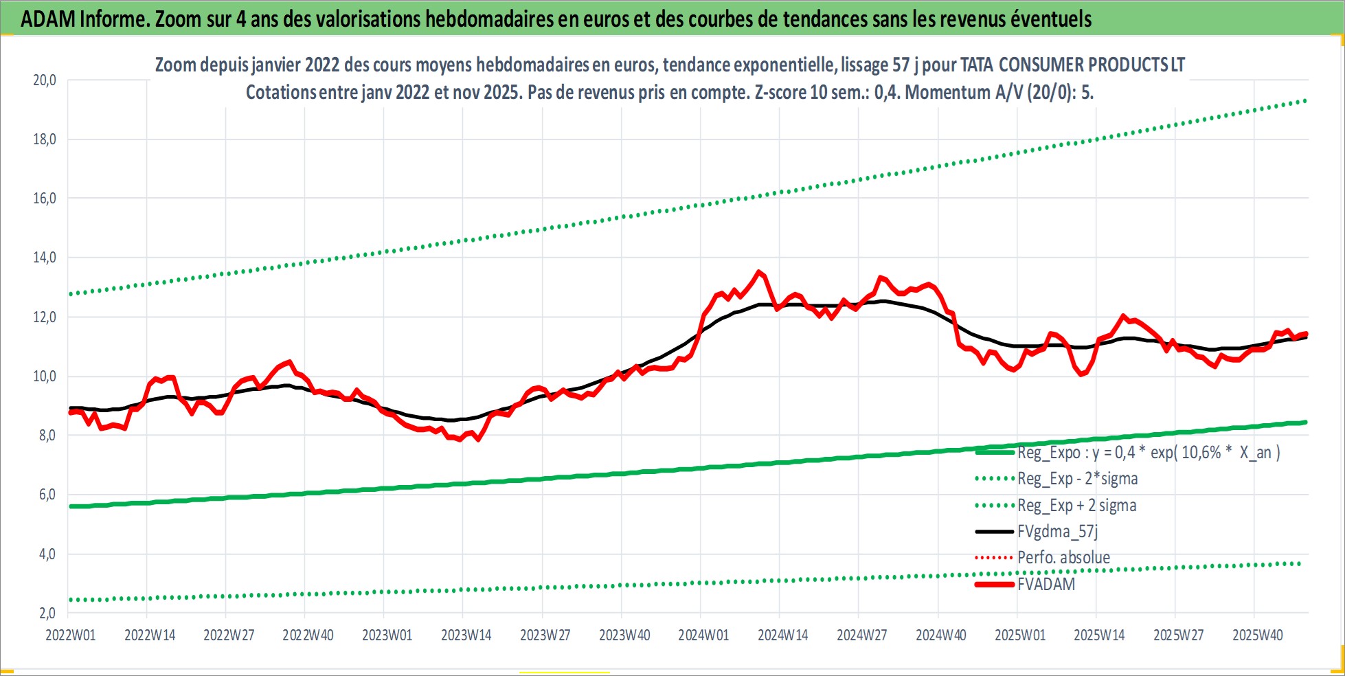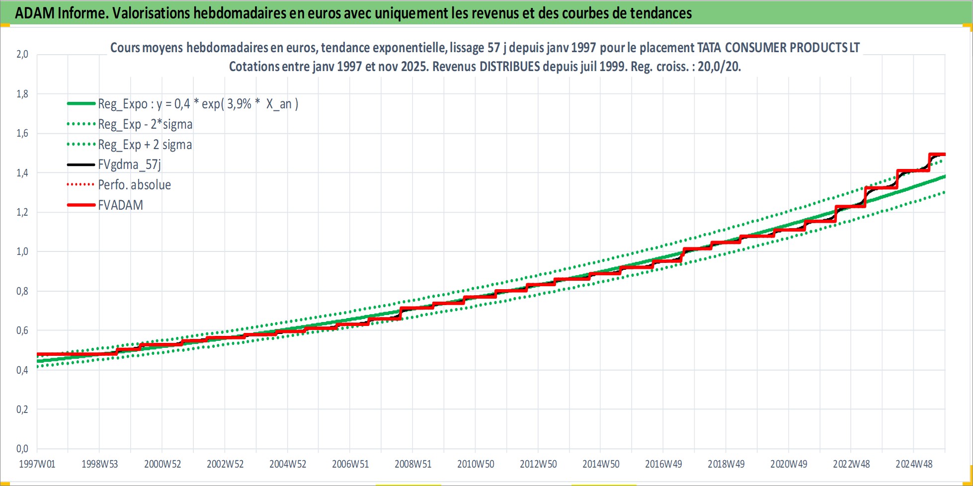 Site dédié aux investisseursPage dédiée sur site financeAnalyse des valorisations hebdomadaires de l'action TATA CONSUMER PRODUCTS LTD. Cet actif est cote en INR. Les valorisations sont en contrevaleur EURO et couvrent les semaines 1997W01 a 2025W48. Les revenus de cet actif financier sont pris en compte depuis la semaine 1999W29. La note ESG de cet actif n'est pas connue.