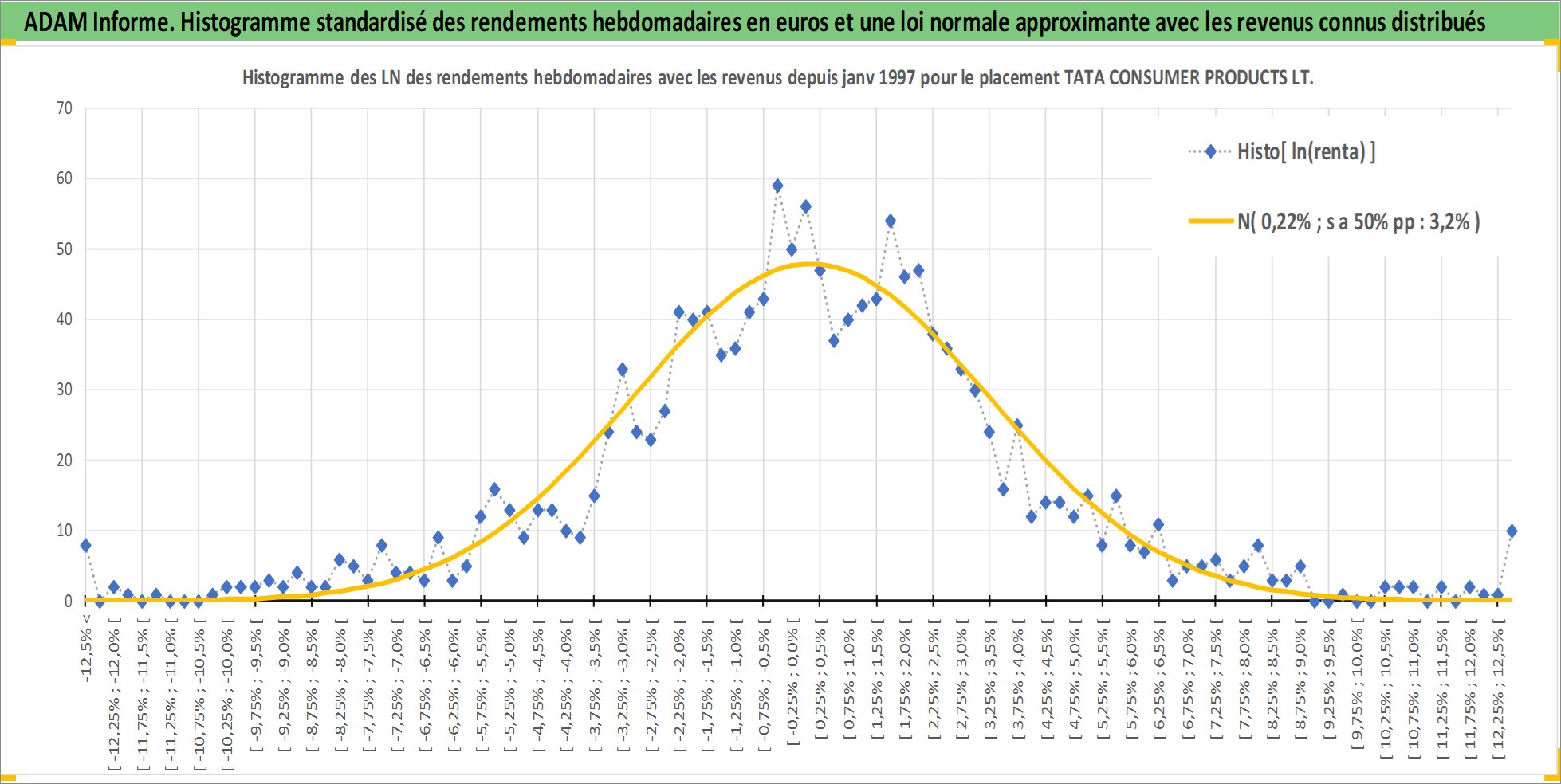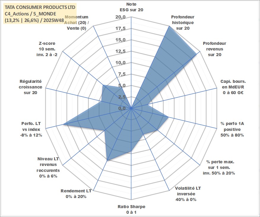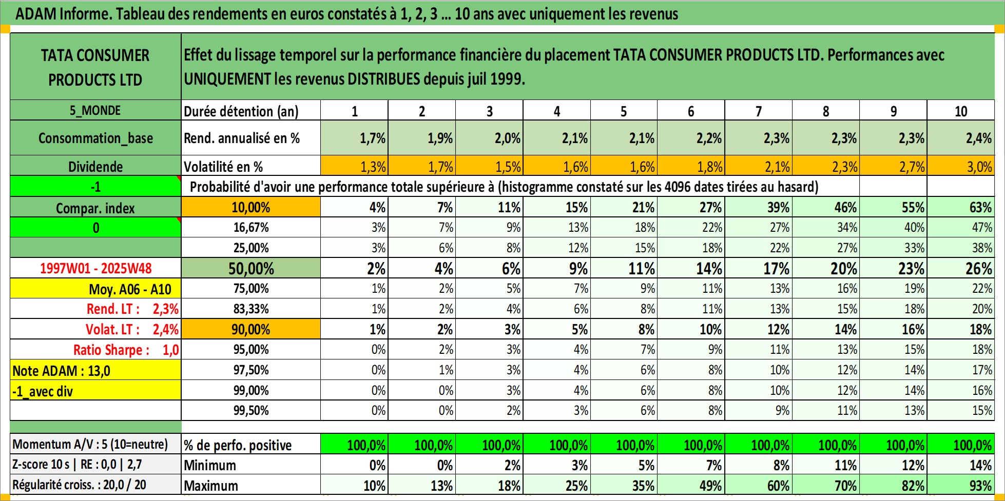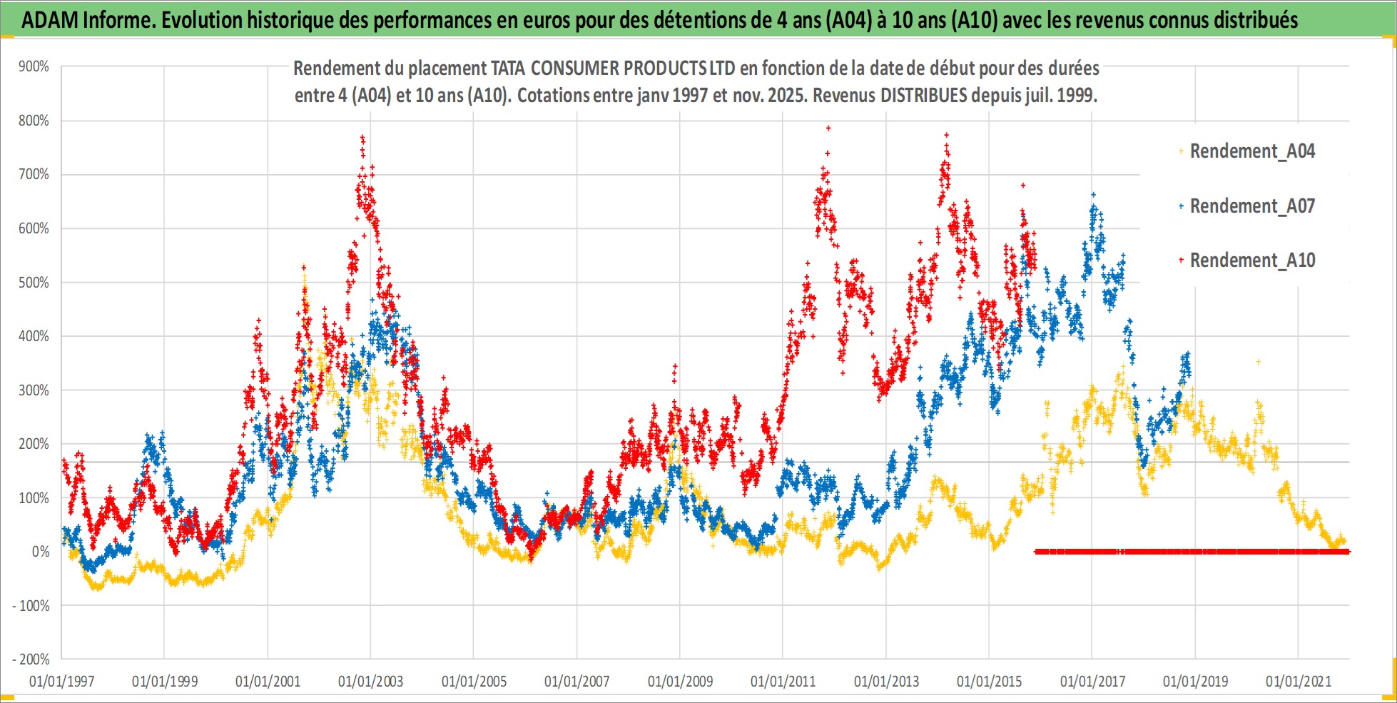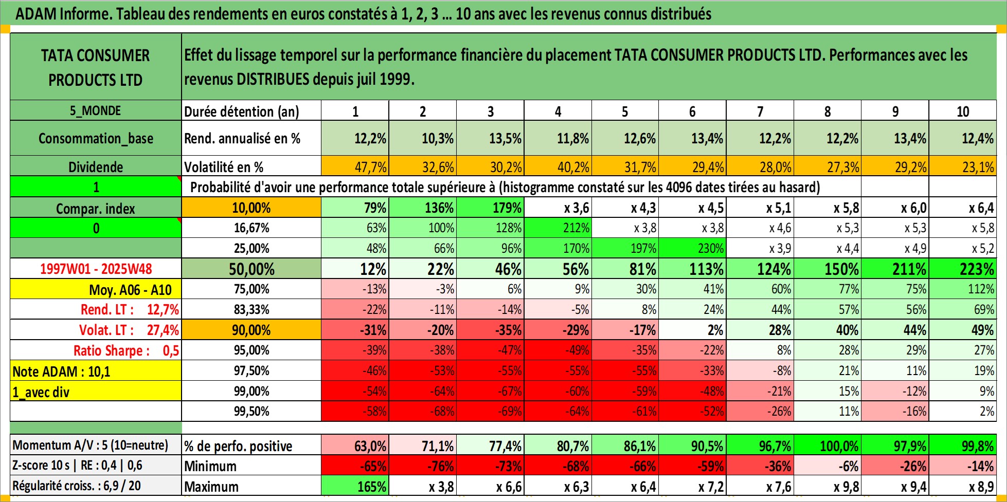 Site dédié aux investisseursPage dédiée sur site financeAnalyse des valorisations hebdomadaires de l'action TATA CONSUMER PRODUCTS LTD. Cet actif est cote en INR. Les valorisations sont en contrevaleur EURO et couvrent les semaines 1997W01 a 2025W48. Les revenus de cet actif financier sont pris en compte depuis la semaine 1999W29. La note ESG de cet actif n'est pas connue.