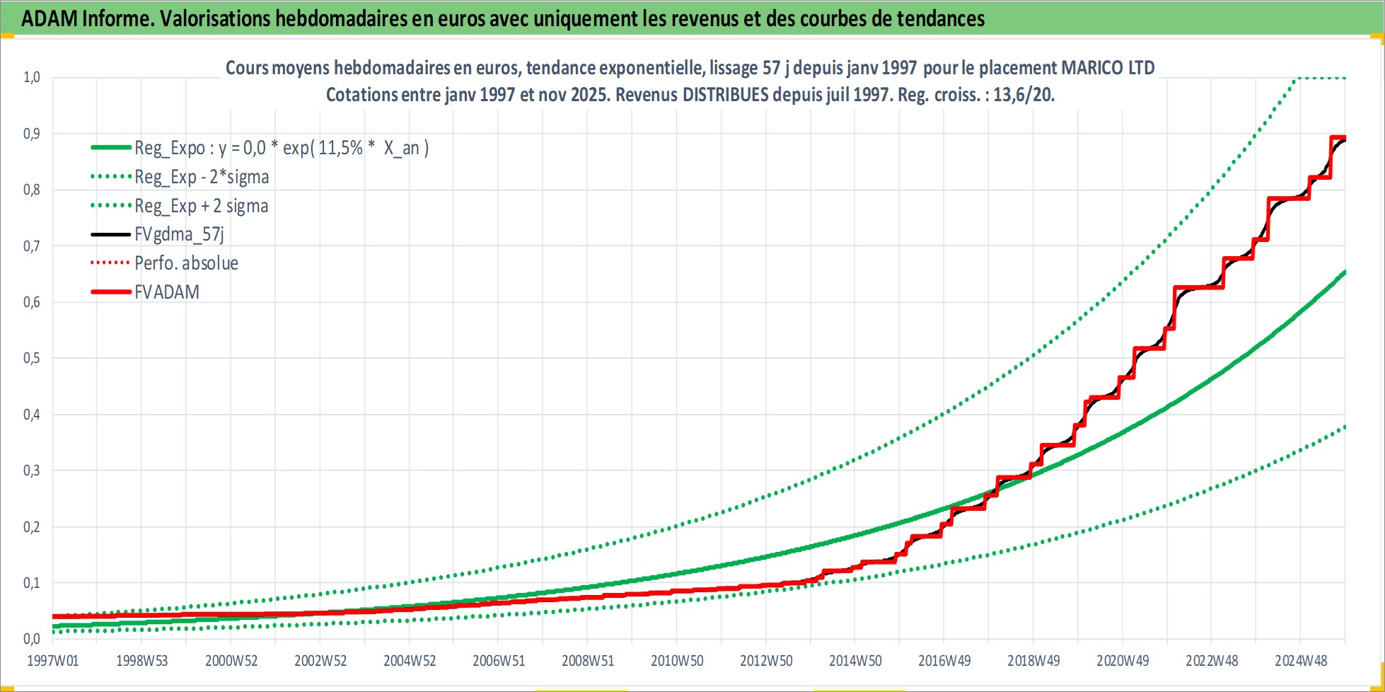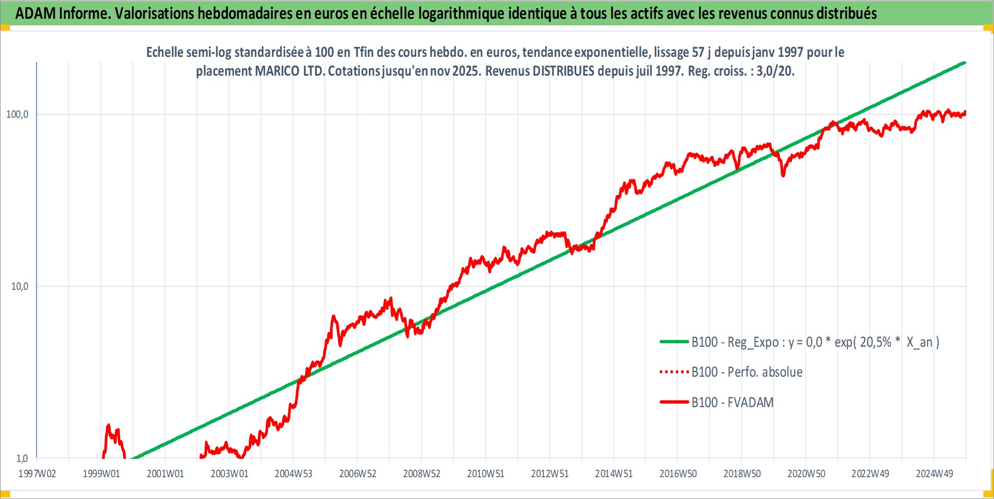 Site dédié aux investisseursPage dédiée sur site financeAnalyse des valorisations hebdomadaires de l'action MARICO LTD. Cet actif est cote en INR. Les valorisations sont en contrevaleur EURO et couvrent les semaines 1997W01 a 2025W48. Les revenus de cet actif financier sont pris en compte depuis la semaine 1997W31. La note globale ESG de cet actif est estimee a 7.0 (apres rebasage entre 0 et 20).
