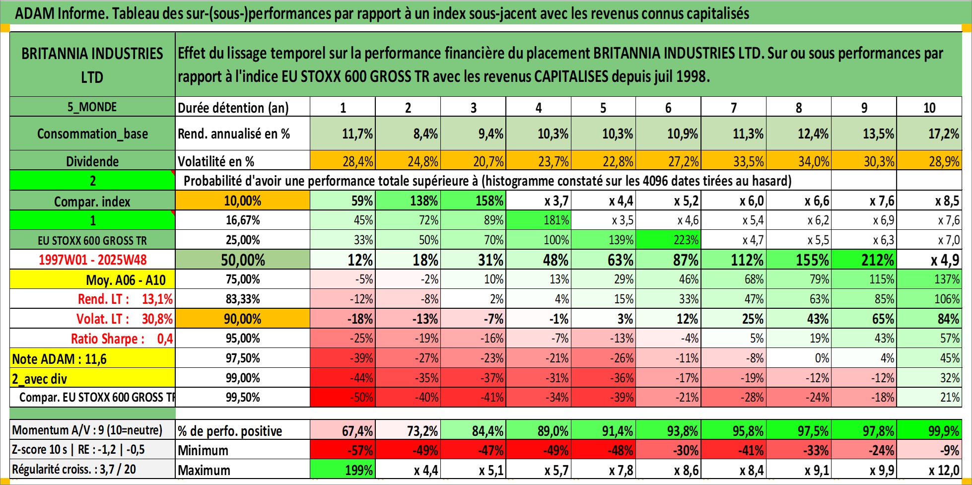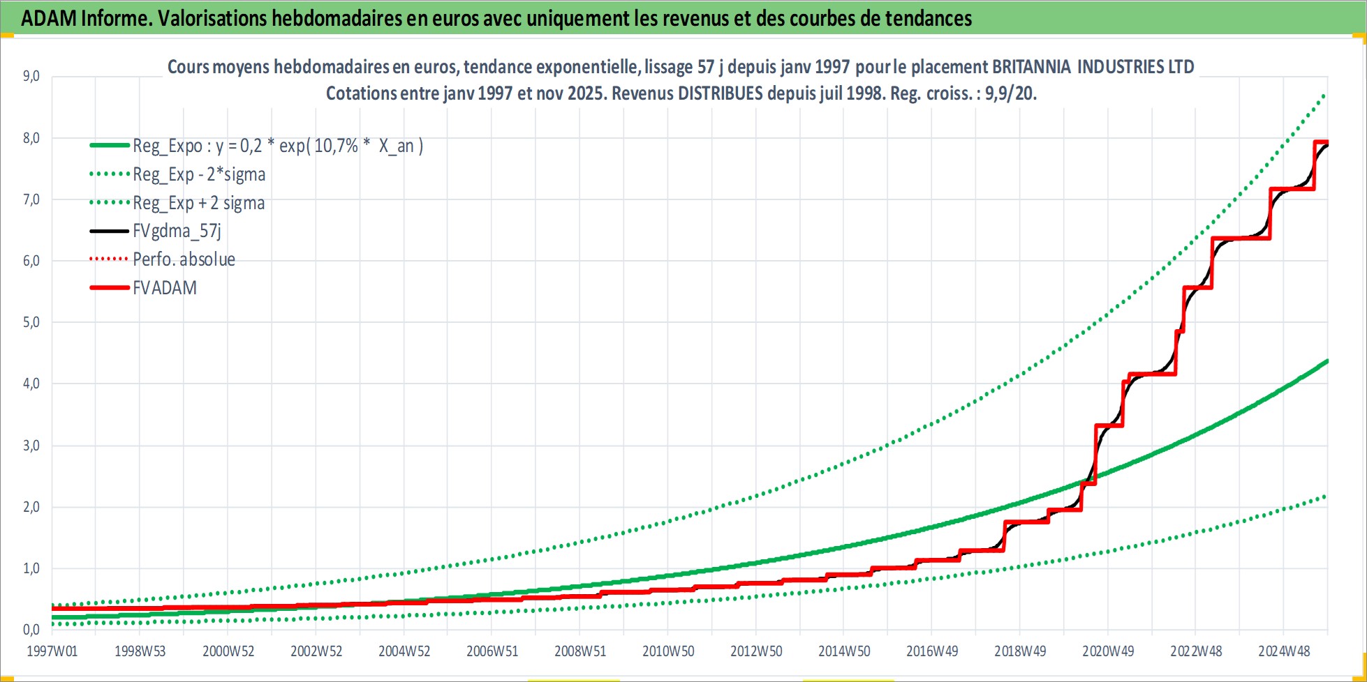 Site dédié aux investisseursPage dédiée sur site financeAnalyse des valorisations hebdomadaires de l'action BRITANNIA INDUSTRIES LTD. Cet actif est cote en INR. Les valorisations sont en contrevaleur EURO et couvrent les semaines 1997W01 a 2025W48. Les revenus de cet actif financier sont pris en compte depuis la semaine 1998W29. La note ESG de cet actif n'est pas connue.