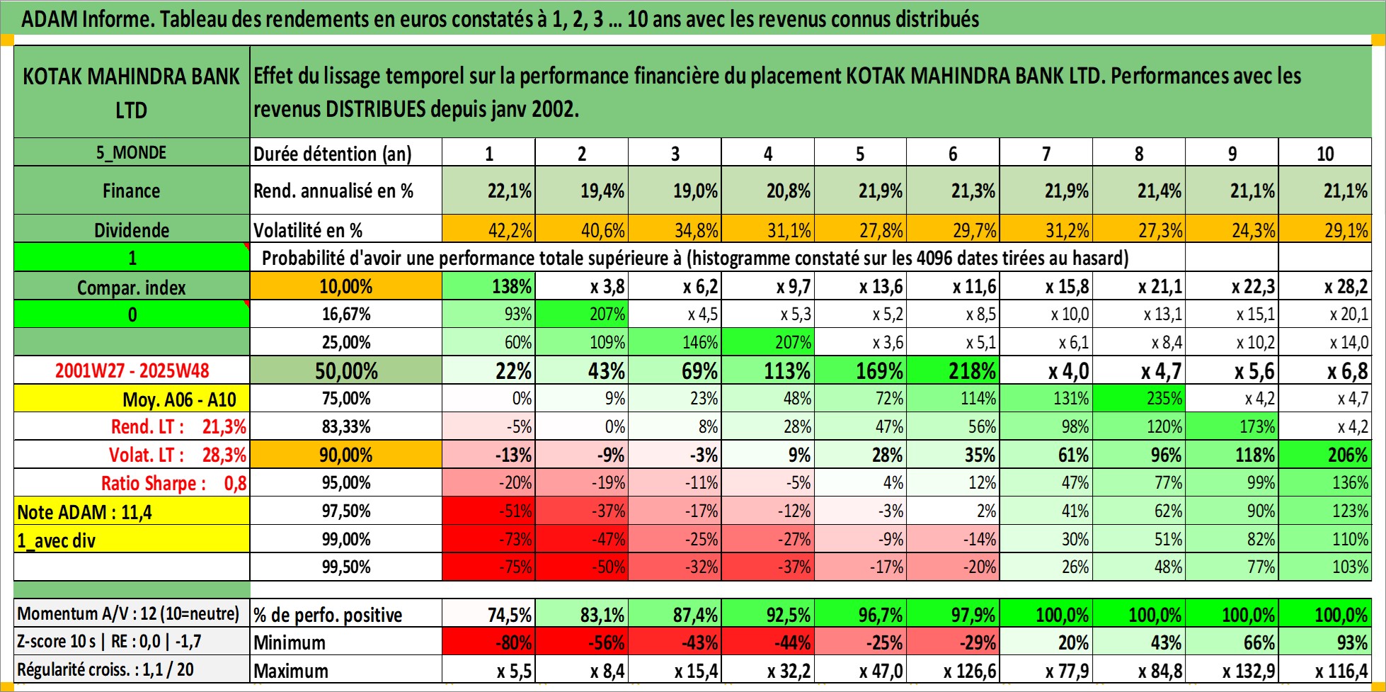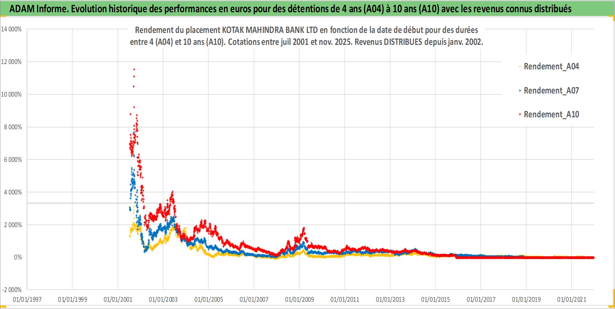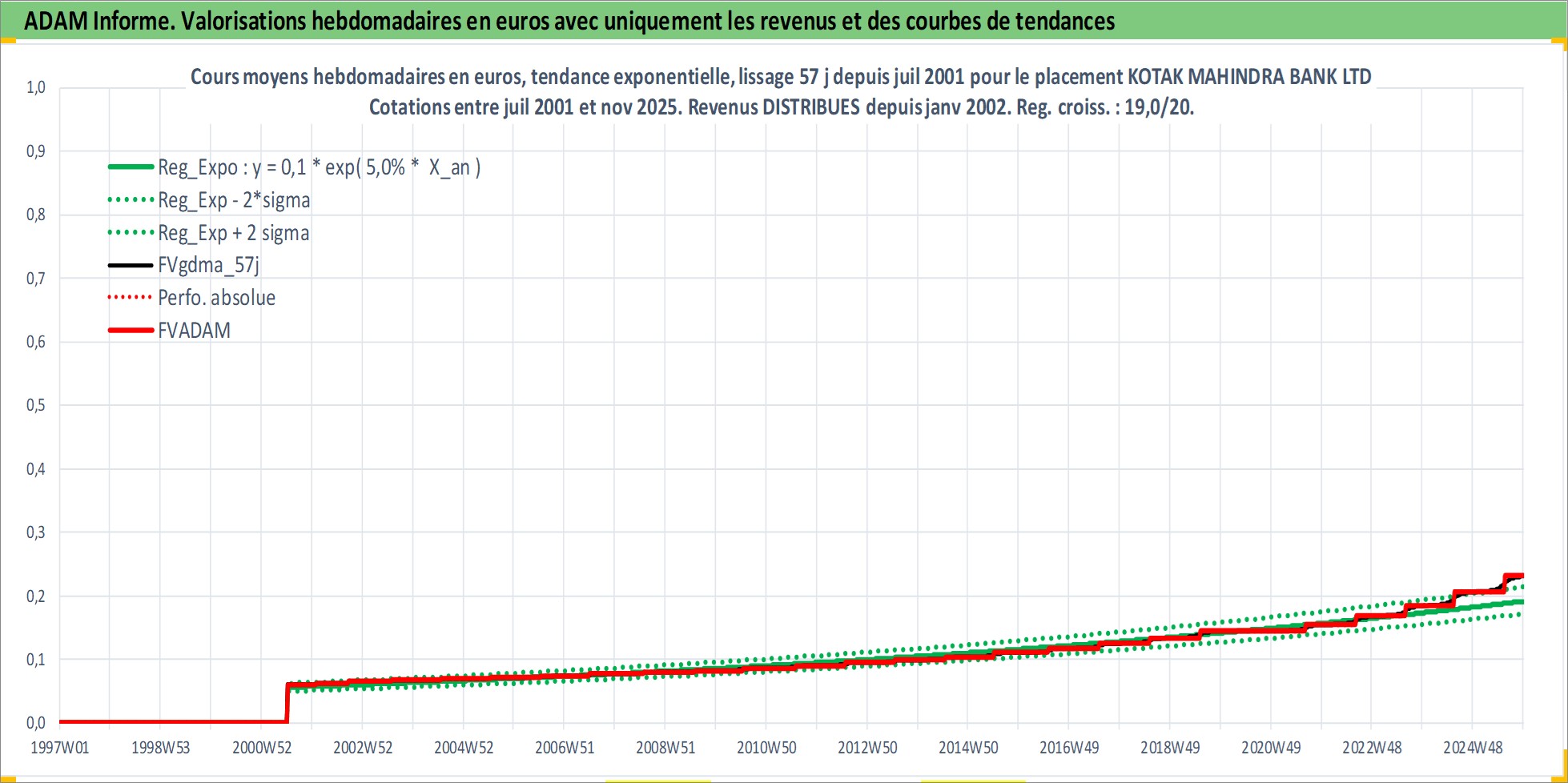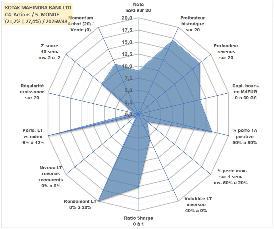 Site dédié aux investisseursPage dédiée sur site financeAnalyse des valorisations hebdomadaires de l'action KOTAK MAHINDRA BANK LTD. Cet actif est cote en INR. Les valorisations sont en contrevaleur EURO et couvrent les semaines 2001W27 a 2025W48. Les revenus de cet actif financier sont pris en compte depuis la semaine 2002W04. La note globale ESG de cet actif est estimee a 9.0 (apres rebasage entre 0 et 20).