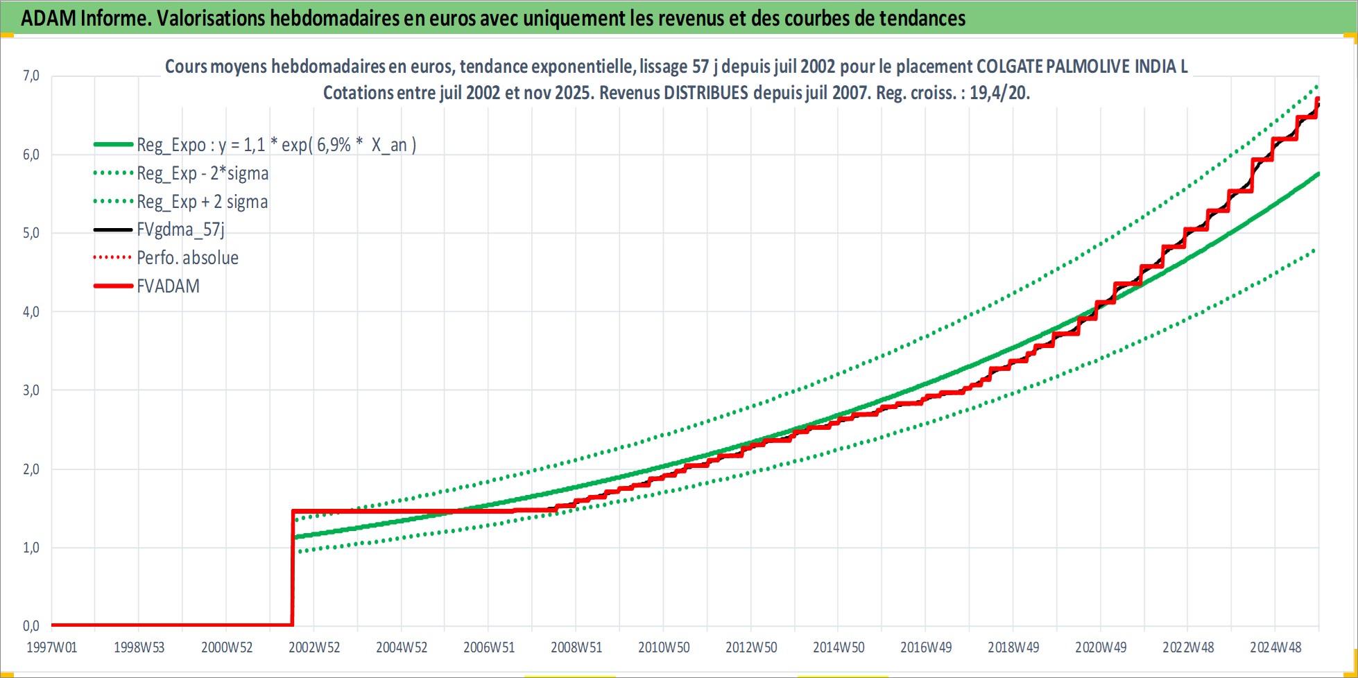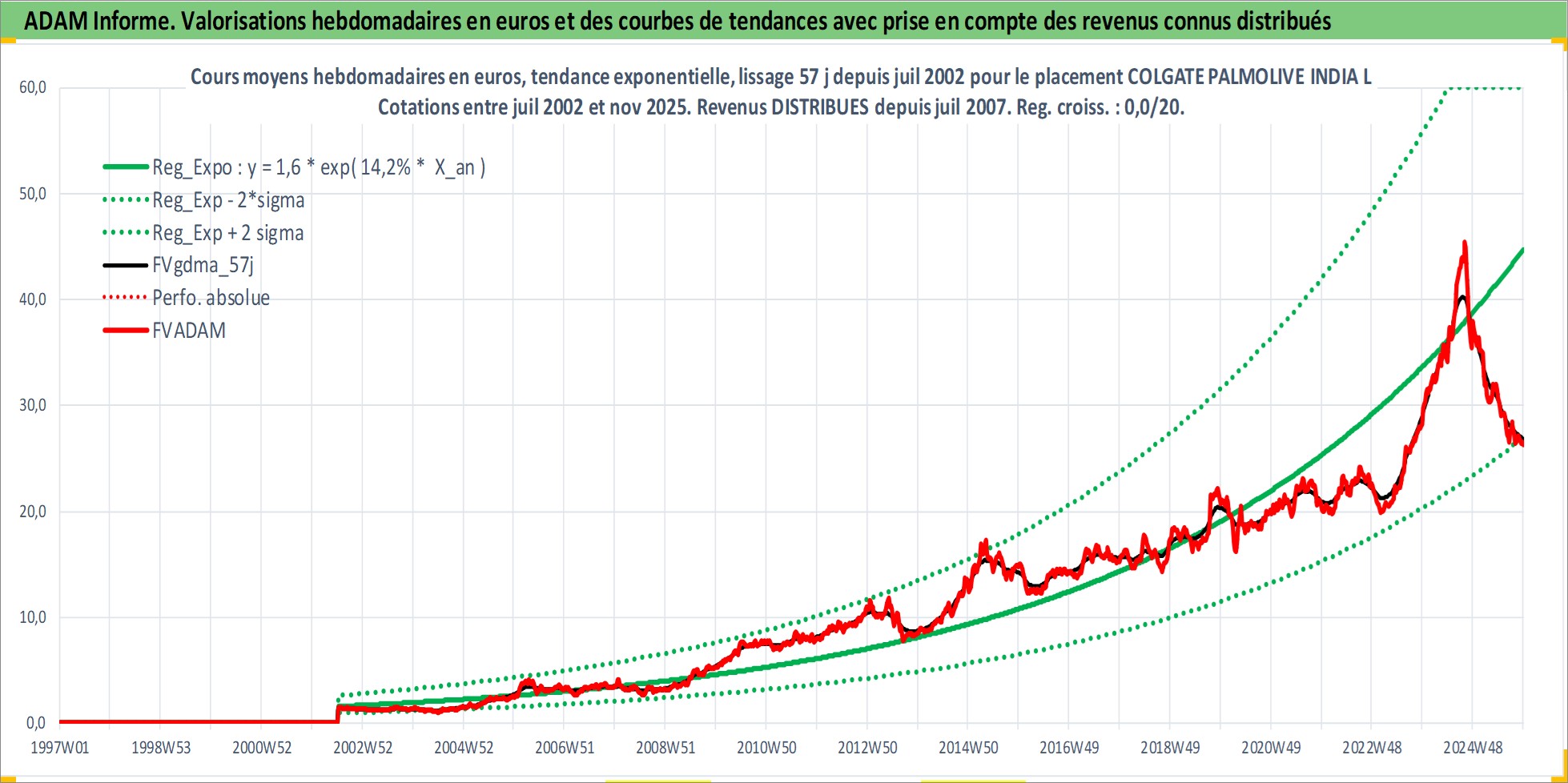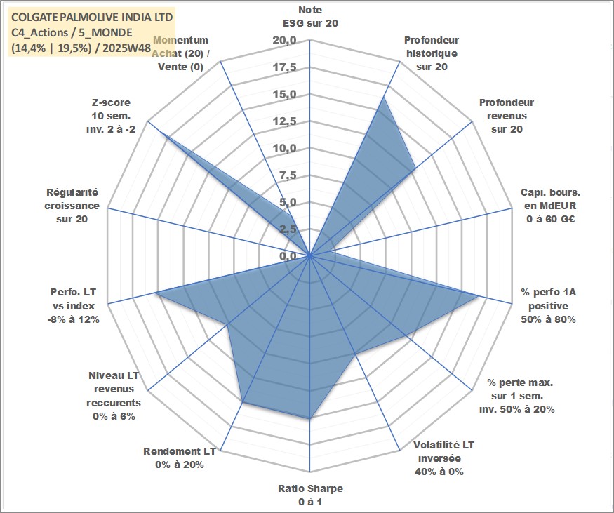 Site dédié aux investisseursPage dédiée sur site financeAnalyse des valorisations hebdomadaires de l'action COLGATE PALMOLIVE INDIA LTD. Cet actif est cote en INR. Les valorisations sont en contrevaleur EURO et couvrent les semaines 2002W27 a 2025W48. Les revenus de cet actif financier sont pris en compte depuis la semaine 2007W29. La note ESG de cet actif n'est pas connue.