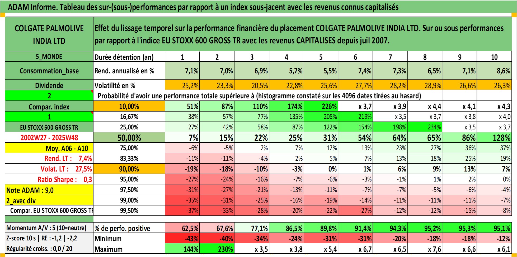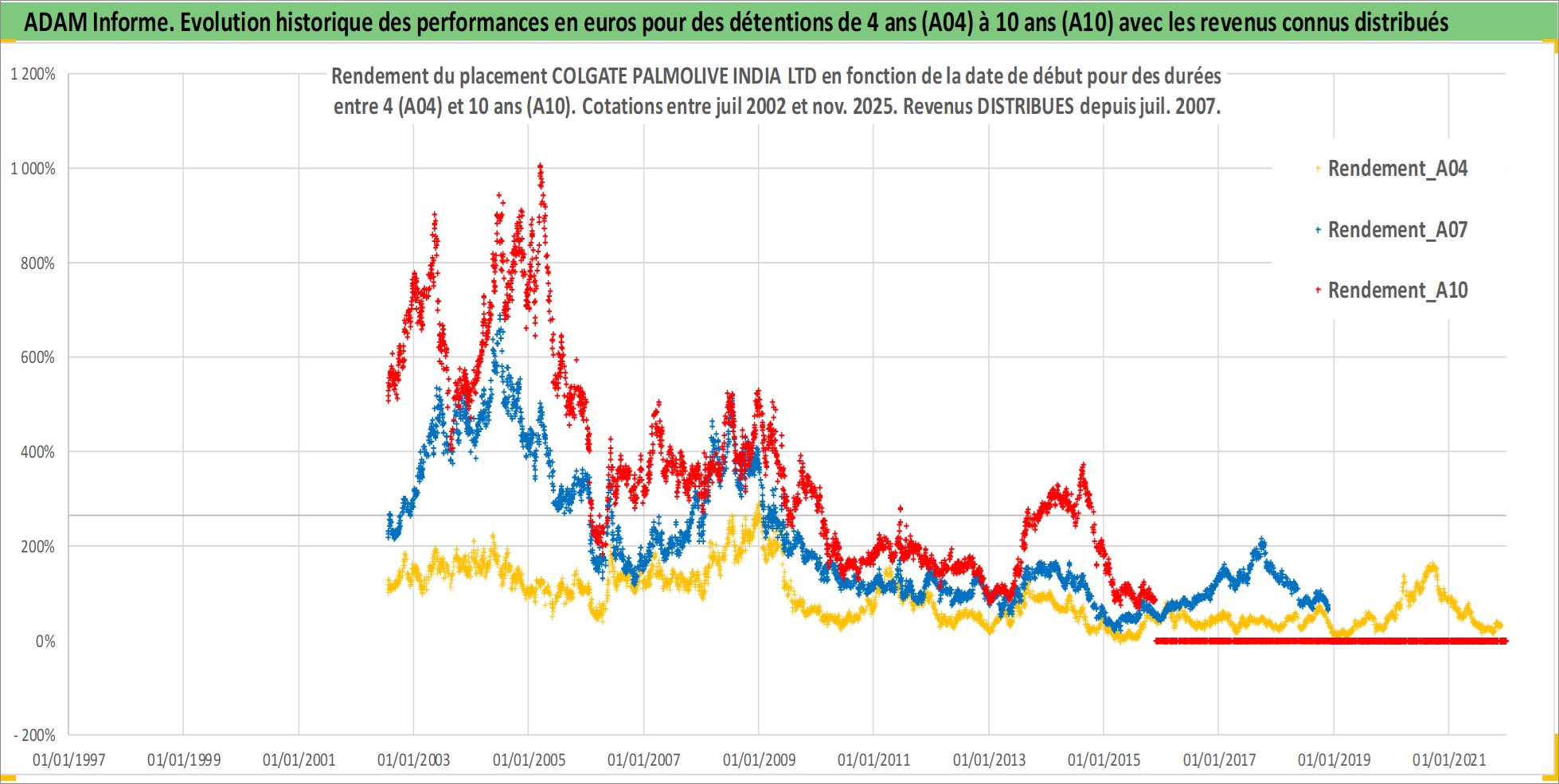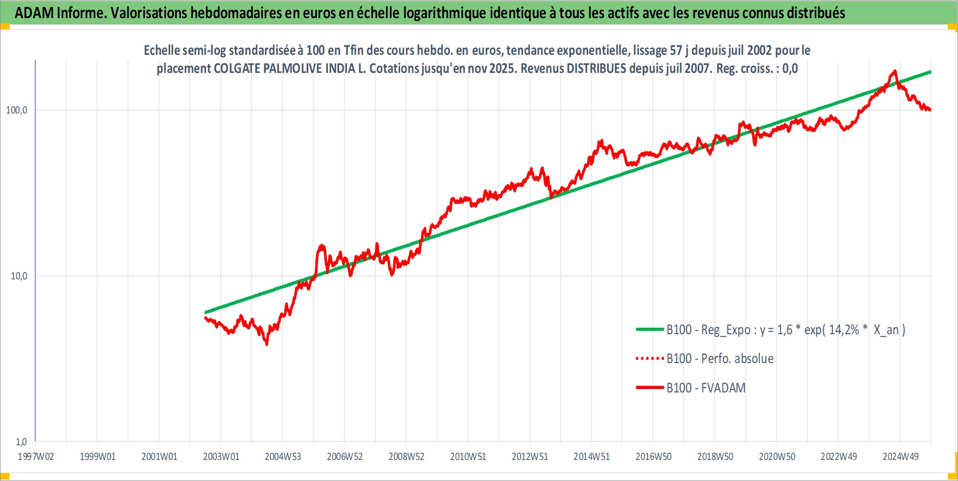 Site dédié aux investisseursPage dédiée sur site financeAnalyse des valorisations hebdomadaires de l'action COLGATE PALMOLIVE INDIA LTD. Cet actif est cote en INR. Les valorisations sont en contrevaleur EURO et couvrent les semaines 2002W27 a 2025W48. Les revenus de cet actif financier sont pris en compte depuis la semaine 2007W29. La note ESG de cet actif n'est pas connue.