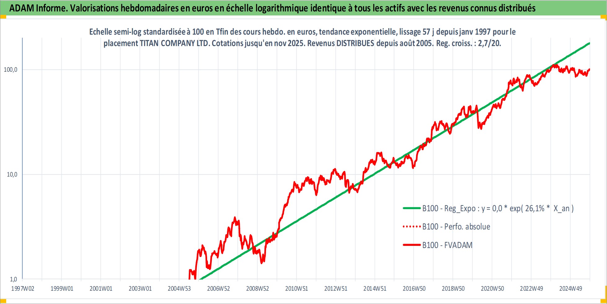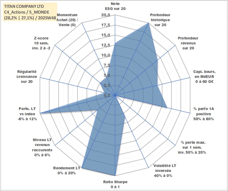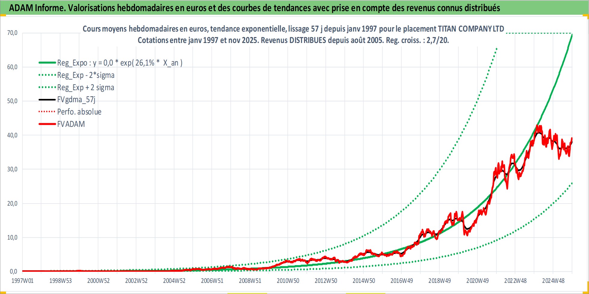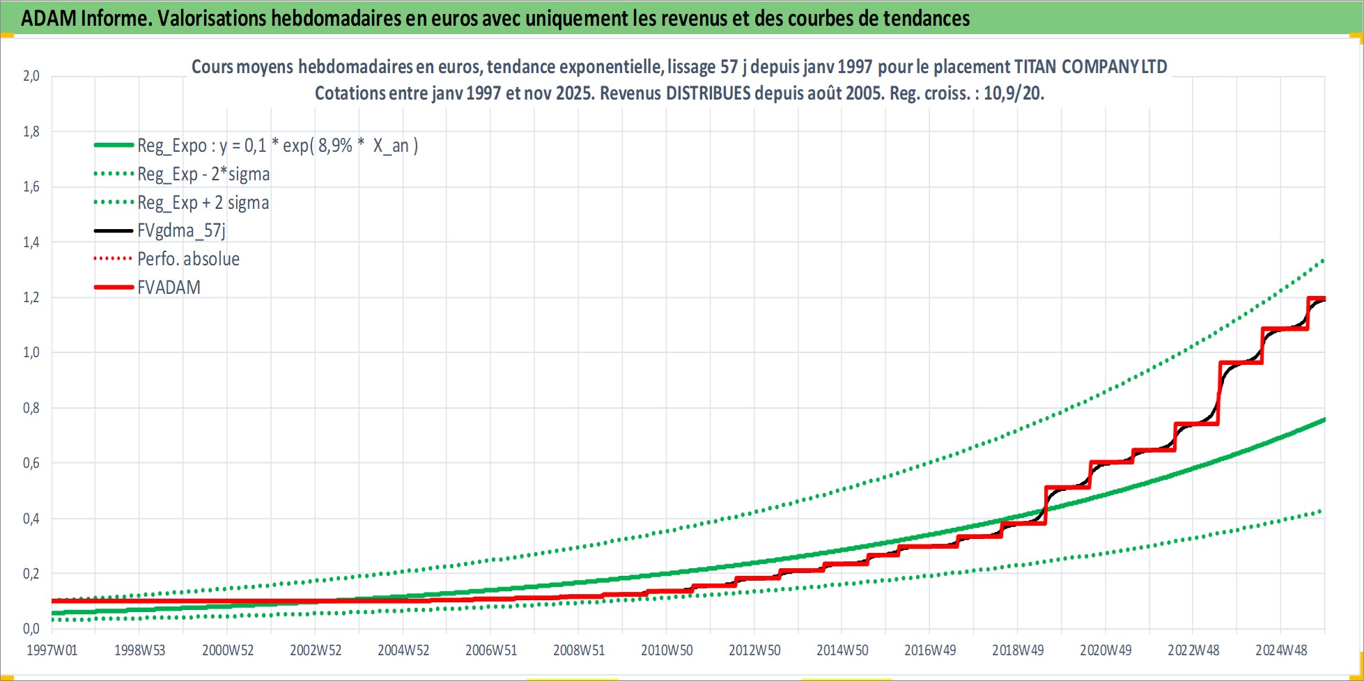Site dédié aux investisseursPage dédiée sur site financeAnalyse des valorisations hebdomadaires de l'action TITAN COMPANY LTD. Cet actif est cote en INR. Les valorisations sont en contrevaleur EURO et couvrent les semaines 1997W01 a 2025W48. Les revenus de cet actif financier sont pris en compte depuis la semaine 2005W32. La note globale ESG de cet actif est estimee a 13.0 (apres rebasage entre 0 et 20).