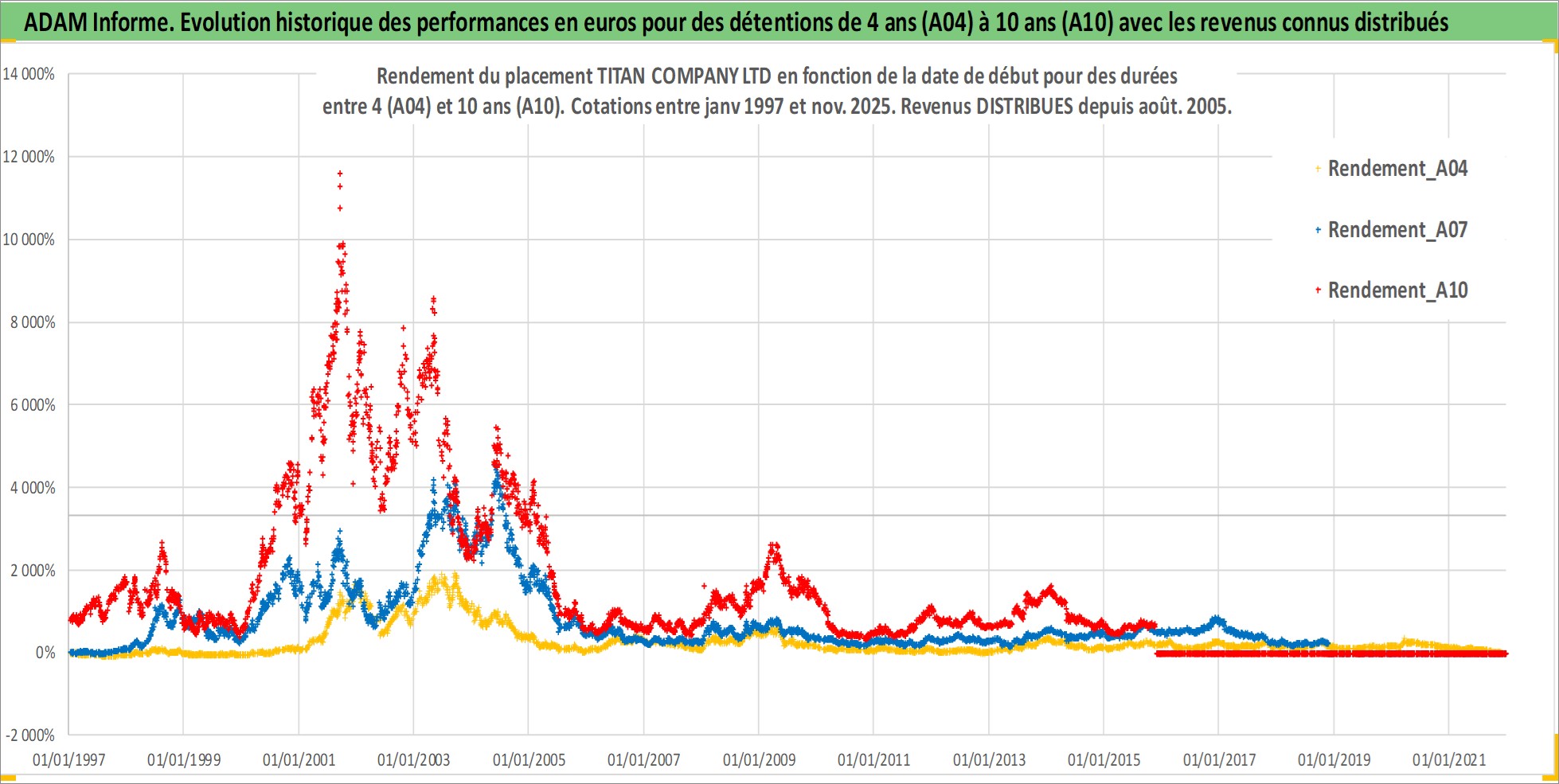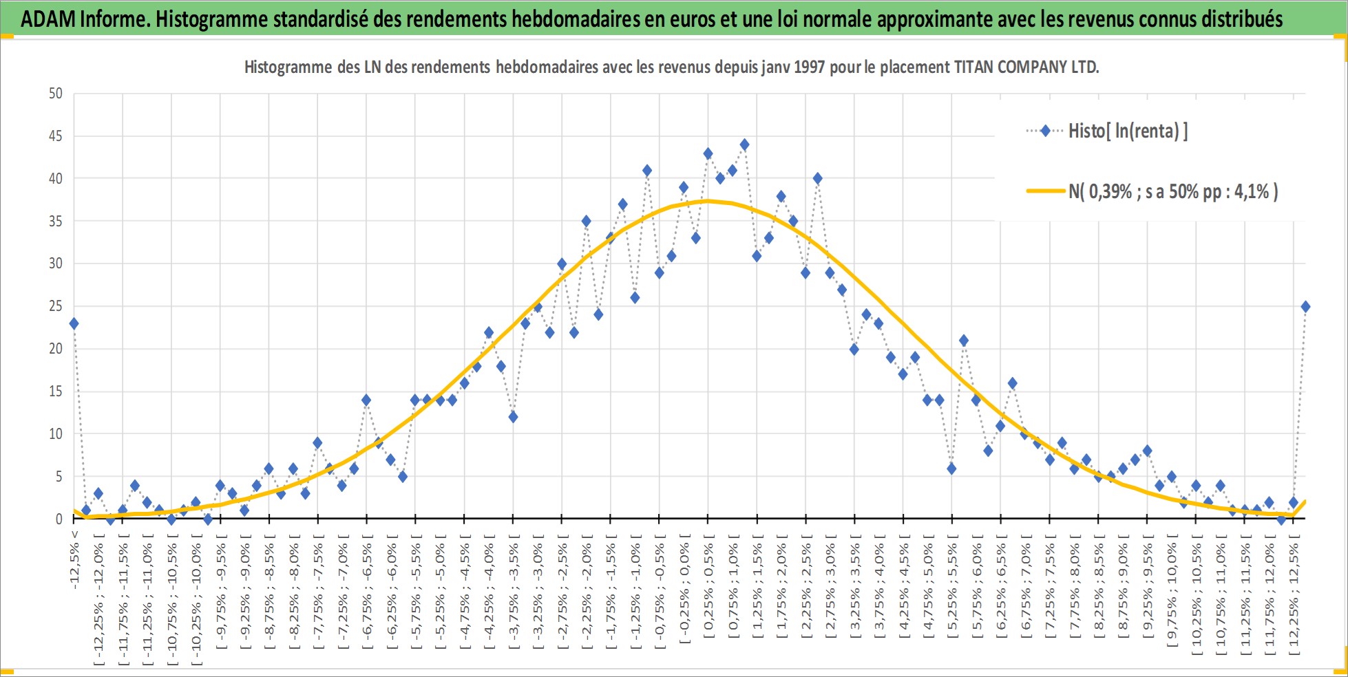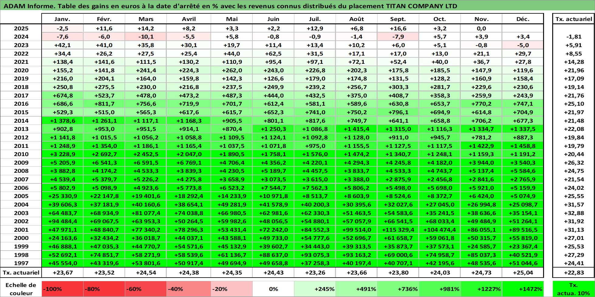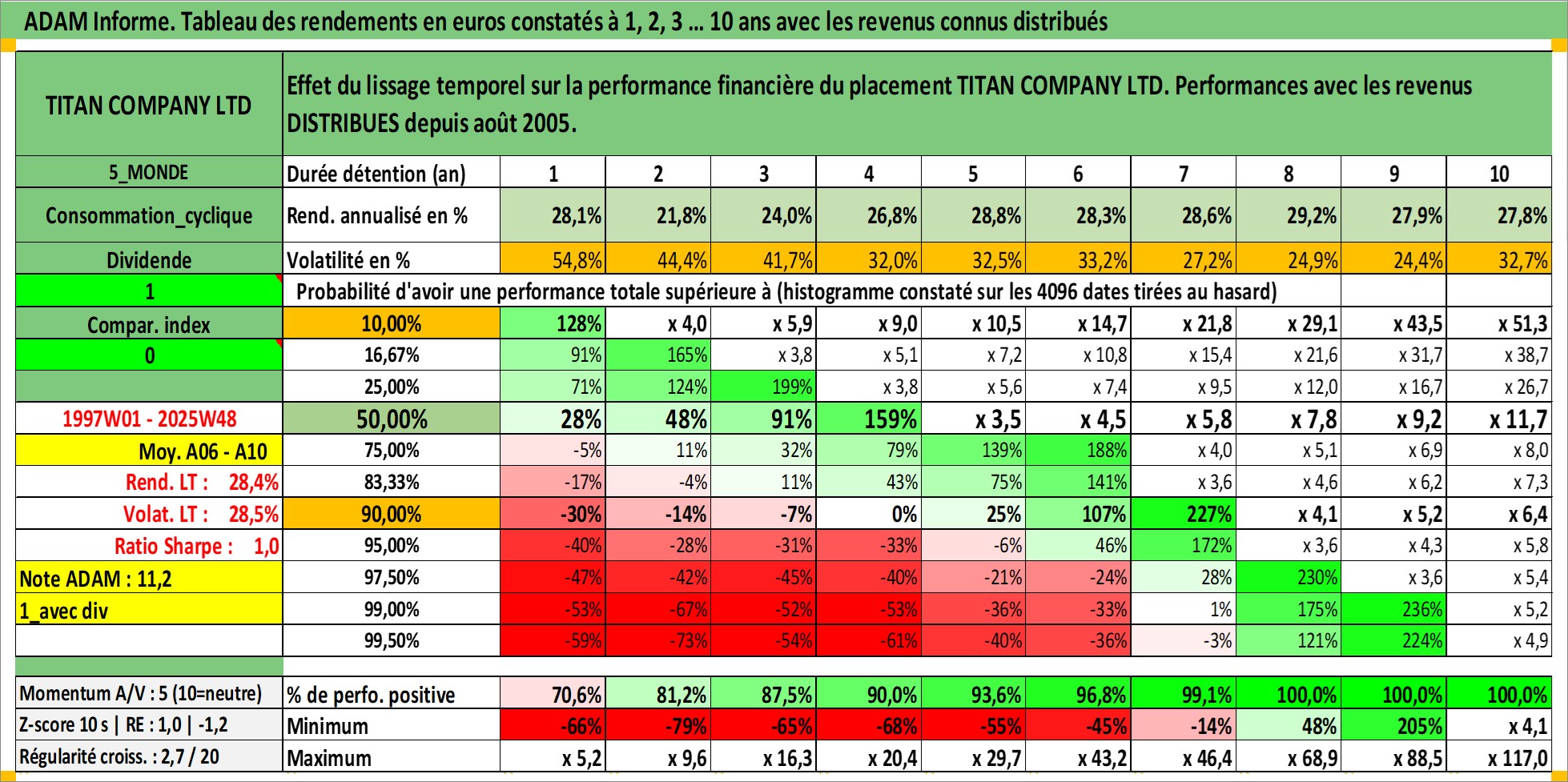 Site dédié aux investisseursPage dédiée sur site financeAnalyse des valorisations hebdomadaires de l'action TITAN COMPANY LTD. Cet actif est cote en INR. Les valorisations sont en contrevaleur EURO et couvrent les semaines 1997W01 a 2025W48. Les revenus de cet actif financier sont pris en compte depuis la semaine 2005W32. La note globale ESG de cet actif est estimee a 13.0 (apres rebasage entre 0 et 20).