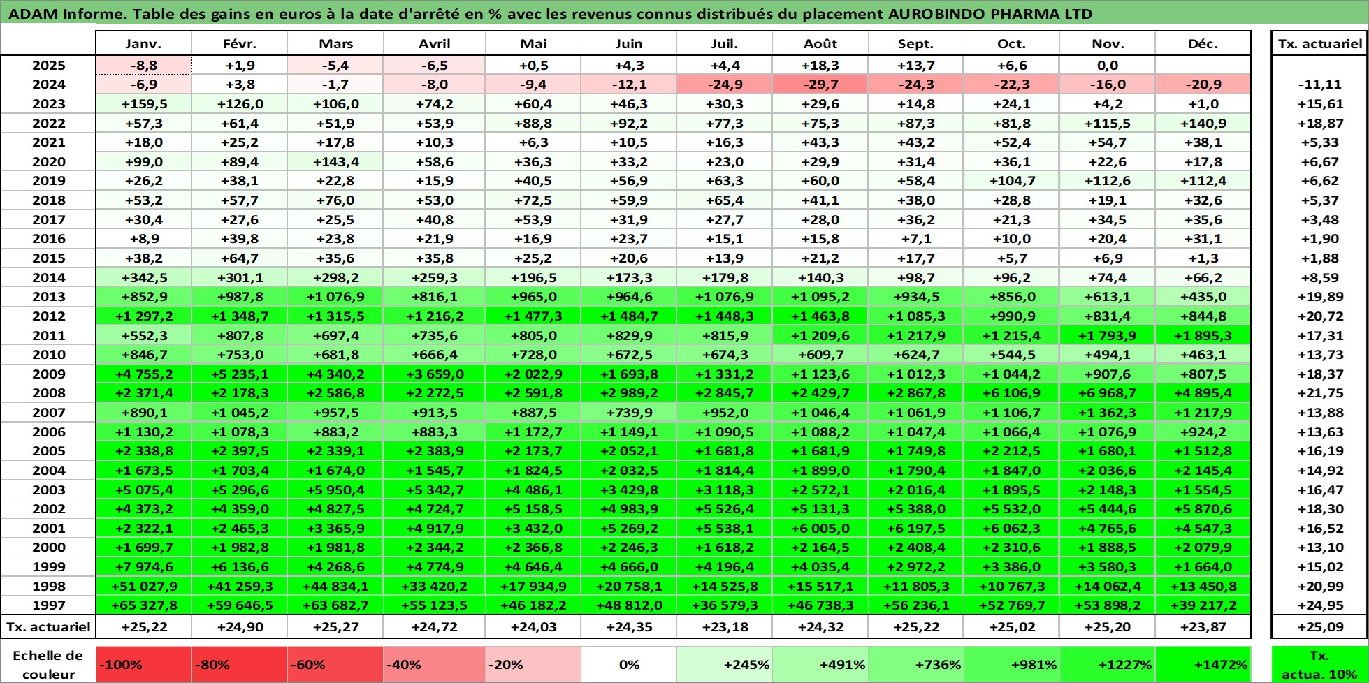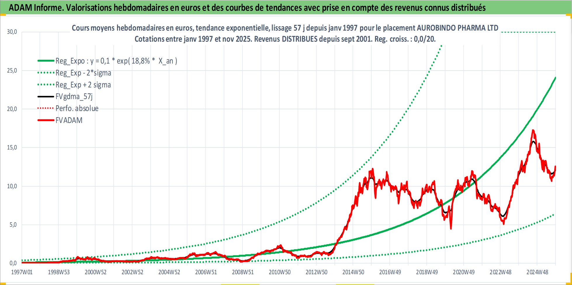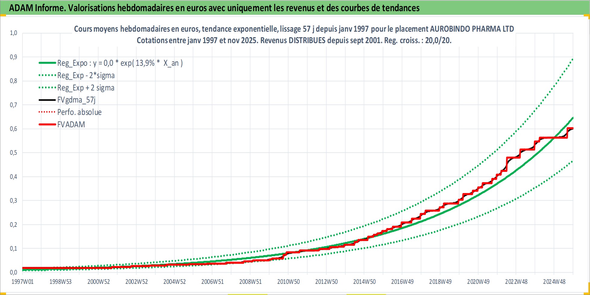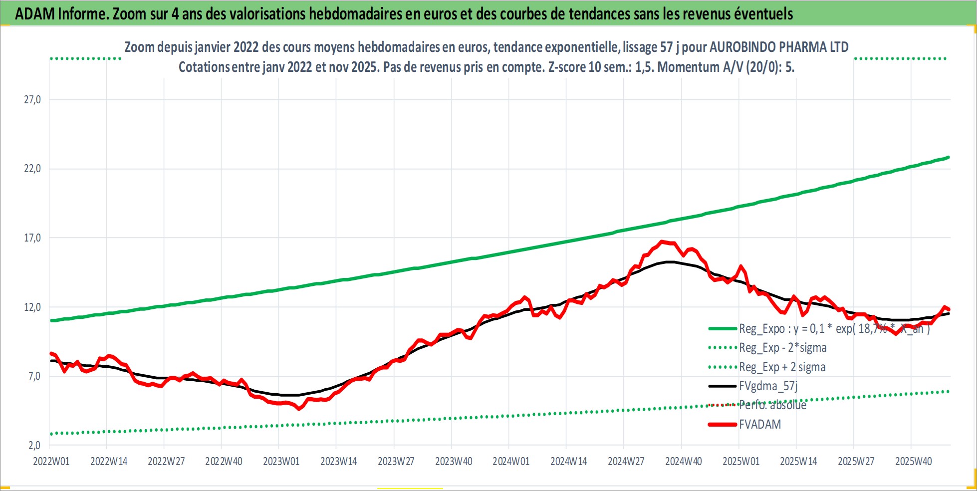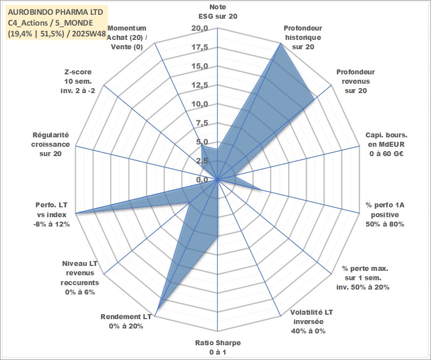 Site dédié aux investisseursPage dédiée sur site financeAnalyse des valorisations hebdomadaires de l'action AUROBINDO PHARMA LTD. Cet actif est cote en INR. Les valorisations sont en contrevaleur EURO et couvrent les semaines 1997W01 a 2025W48. Les revenus de cet actif financier sont pris en compte depuis la semaine 2001W37. La note globale ESG de cet actif est estimee a 4.0 (apres rebasage entre 0 et 20).