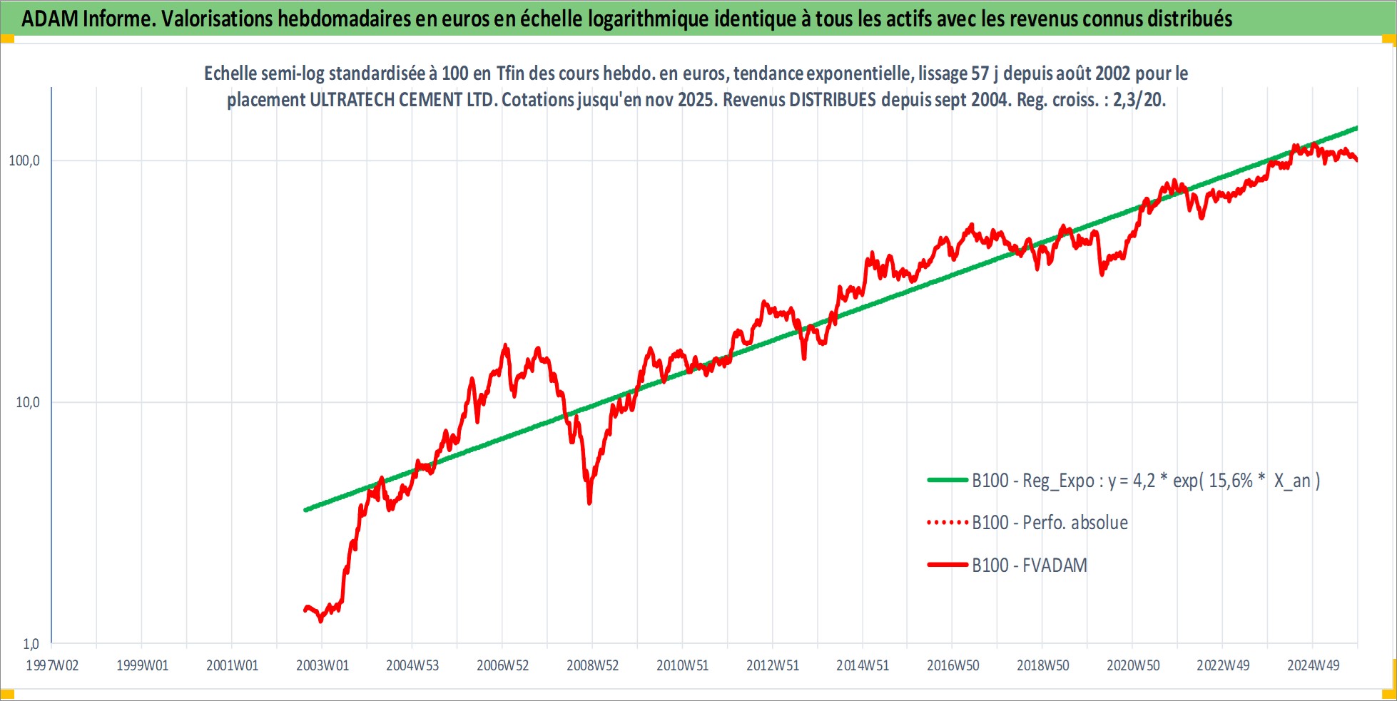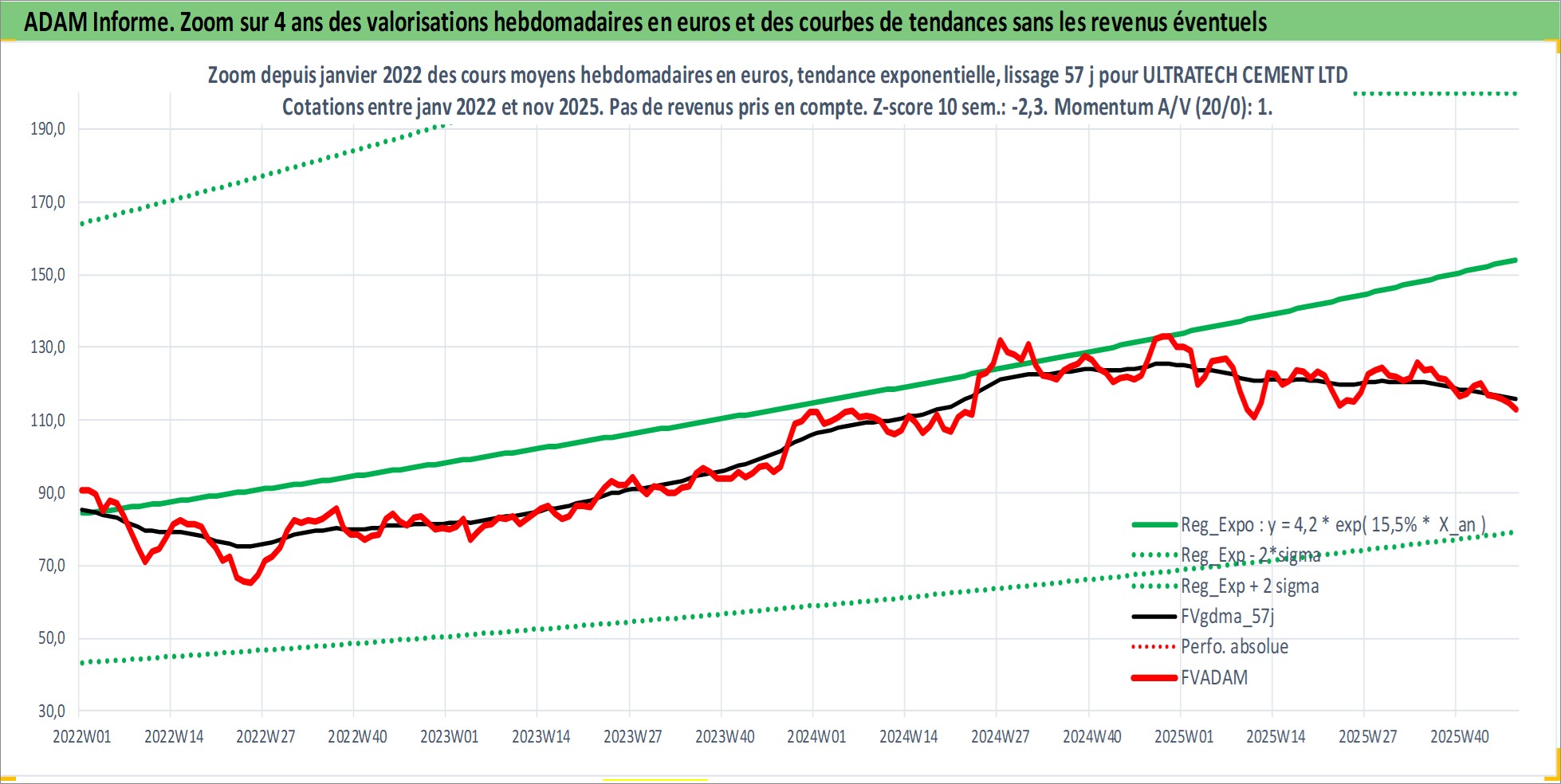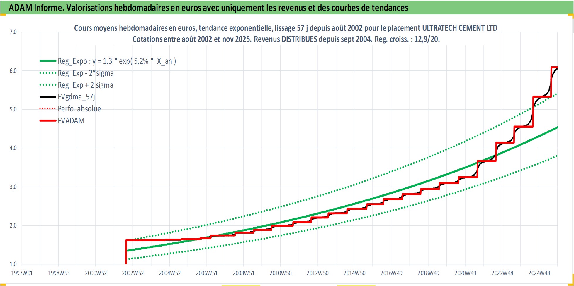 Site dédié aux investisseursPage dédiée sur site financeAnalyse des valorisations hebdomadaires de l'action ULTRATECH CEMENT LTD. Cet actif est cote en INR. Les valorisations sont en contrevaleur EURO et couvrent les semaines 2002W33 a 2025W48. Les revenus de cet actif financier sont pris en compte depuis la semaine 2004W40. La note globale ESG de cet actif est estimee a 3.0 (apres rebasage entre 0 et 20).
