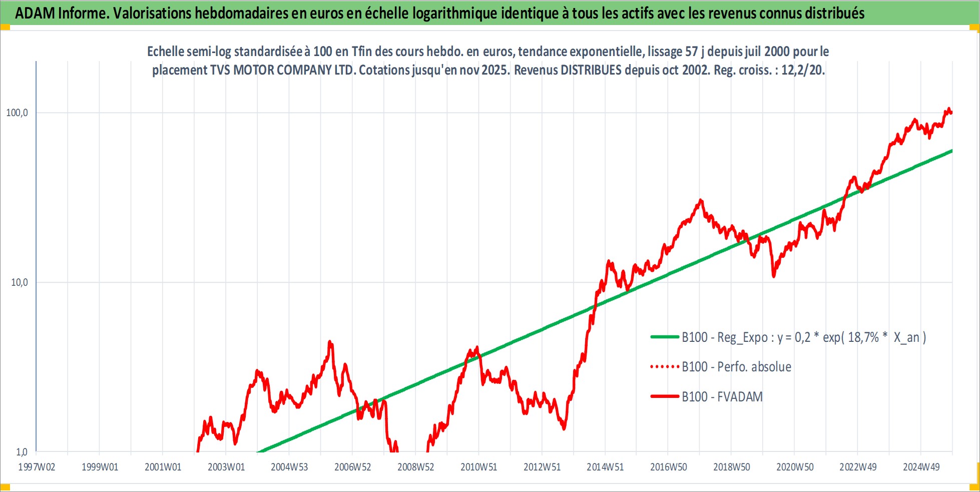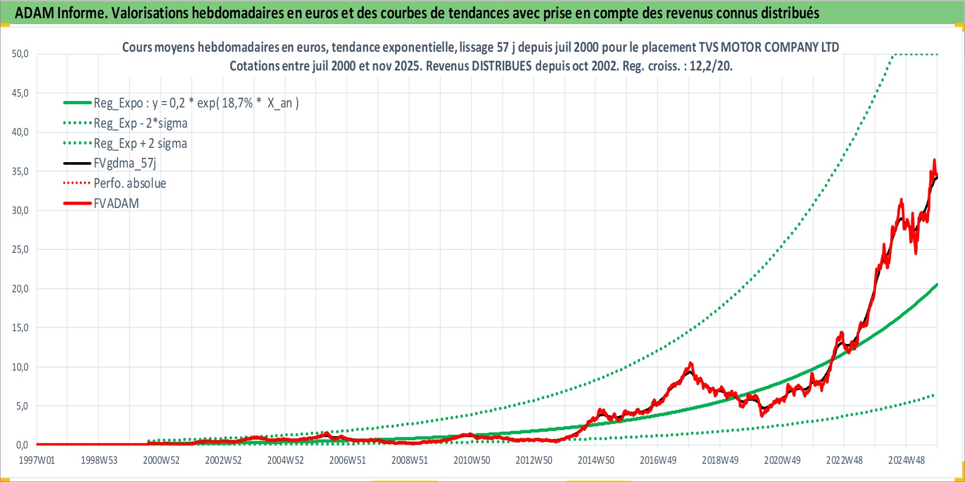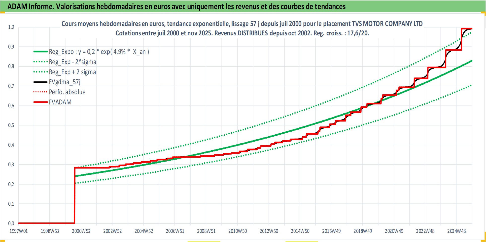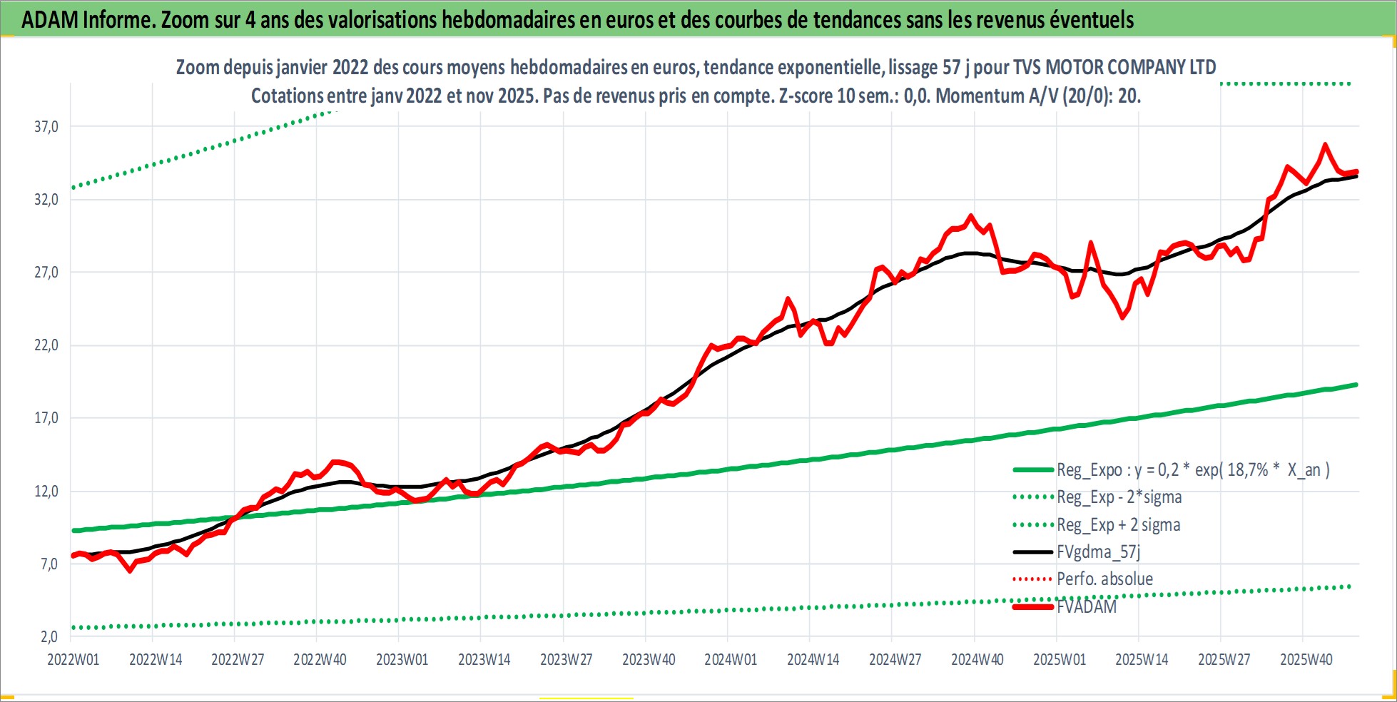 Site dédié aux investisseursPage dédiée sur site financeAnalyse des valorisations hebdomadaires de l'action TVS MOTOR COMPANY LTD. Cet actif est cote en INR. Les valorisations sont en contrevaleur EURO et couvrent les semaines 2000W31 a 2025W48. Les revenus de cet actif financier sont pris en compte depuis la semaine 2002W43. La note ESG de cet actif n'est pas connue.