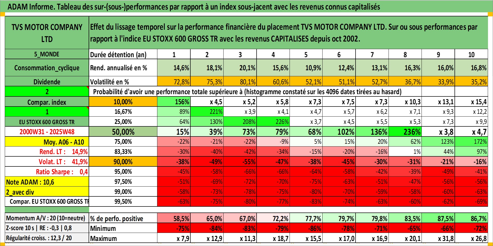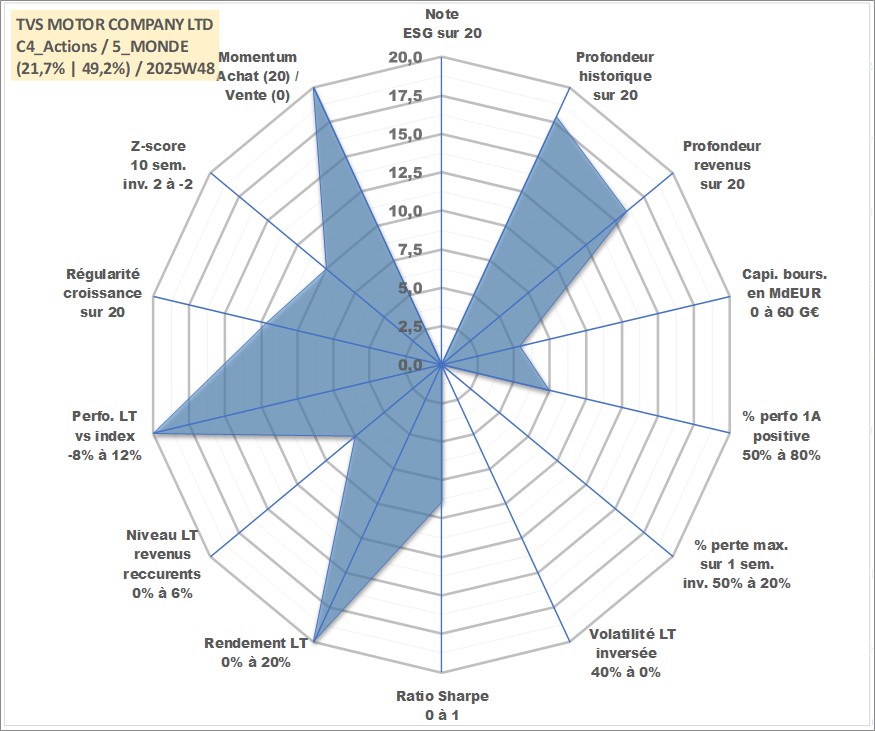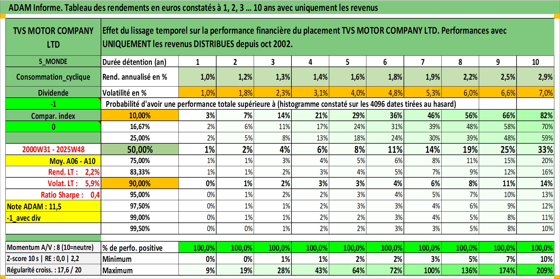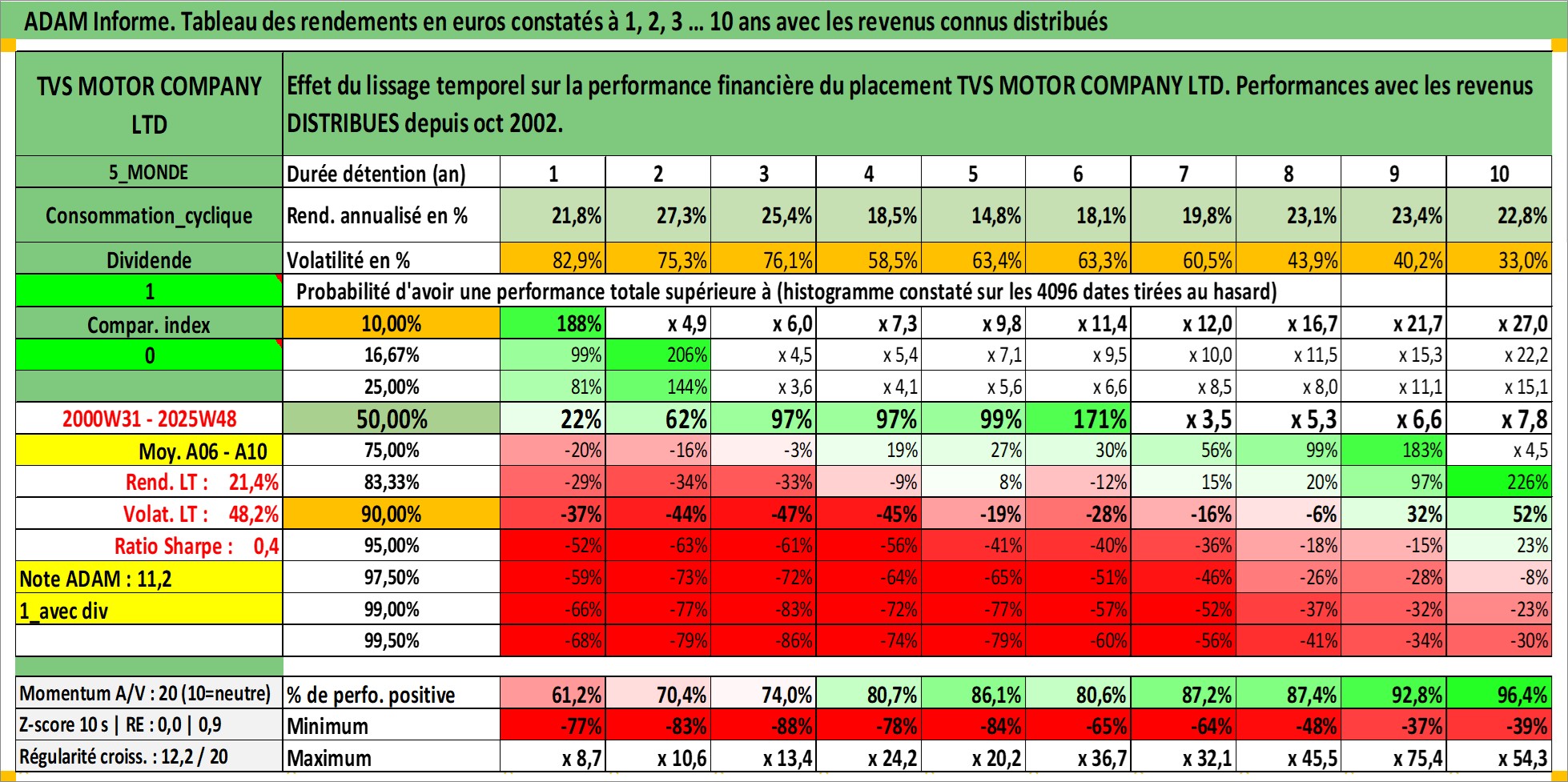 Site dédié aux investisseursPage dédiée sur site financeAnalyse des valorisations hebdomadaires de l'action TVS MOTOR COMPANY LTD. Cet actif est cote en INR. Les valorisations sont en contrevaleur EURO et couvrent les semaines 2000W31 a 2025W48. Les revenus de cet actif financier sont pris en compte depuis la semaine 2002W43. La note ESG de cet actif n'est pas connue.