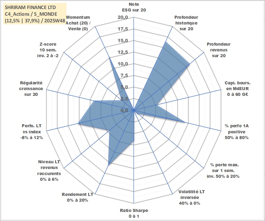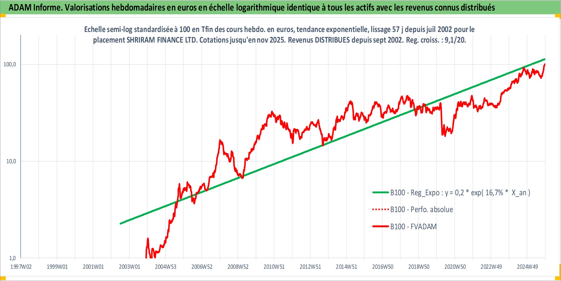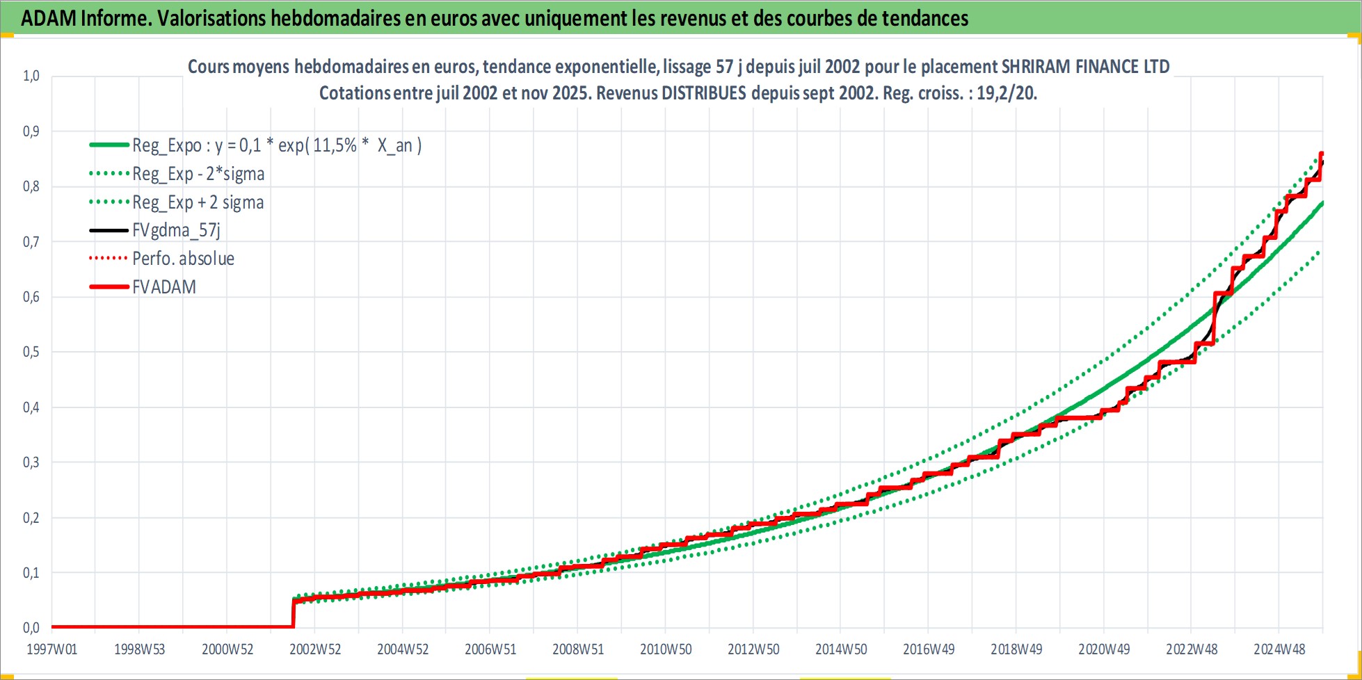 Site dédié aux investisseursPage dédiée sur site financeAnalyse des valorisations hebdomadaires de l'action SHRIRAM FINANCE LTD. Cet actif est cote en INR. Les valorisations sont en contrevaleur EURO et couvrent les semaines 2002W27 a 2025W48. Les revenus de cet actif financier sont pris en compte depuis la semaine 2002W37. La note ESG de cet actif n'est pas connue.