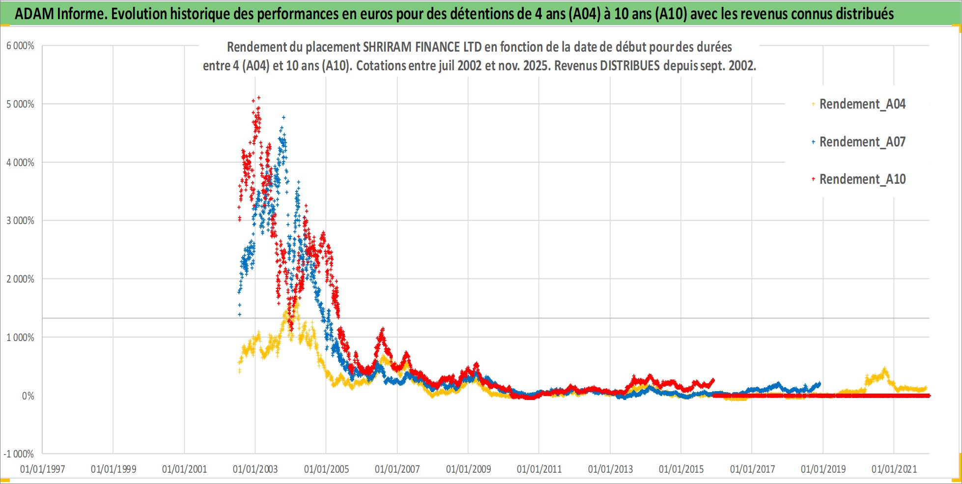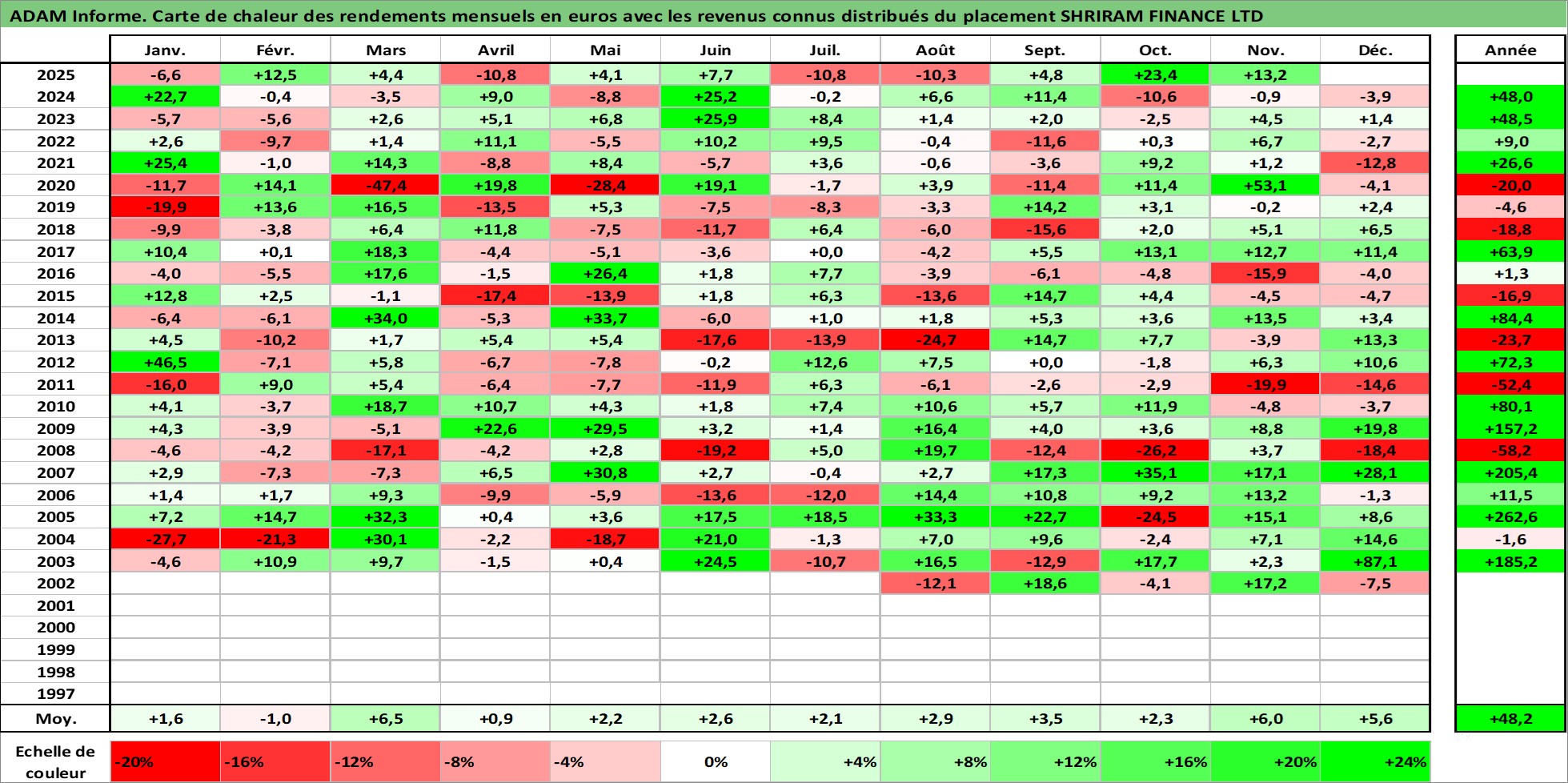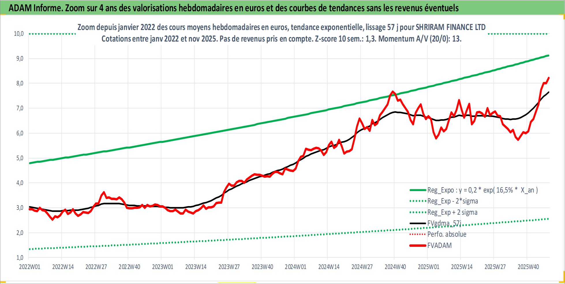Site dédié aux investisseursPage dédiée sur site financeAnalyse des valorisations hebdomadaires de l'action SHRIRAM FINANCE LTD. Cet actif est cote en INR. Les valorisations sont en contrevaleur EURO et couvrent les semaines 2002W27 a 2025W48. Les revenus de cet actif financier sont pris en compte depuis la semaine 2002W37. La note ESG de cet actif n'est pas connue.