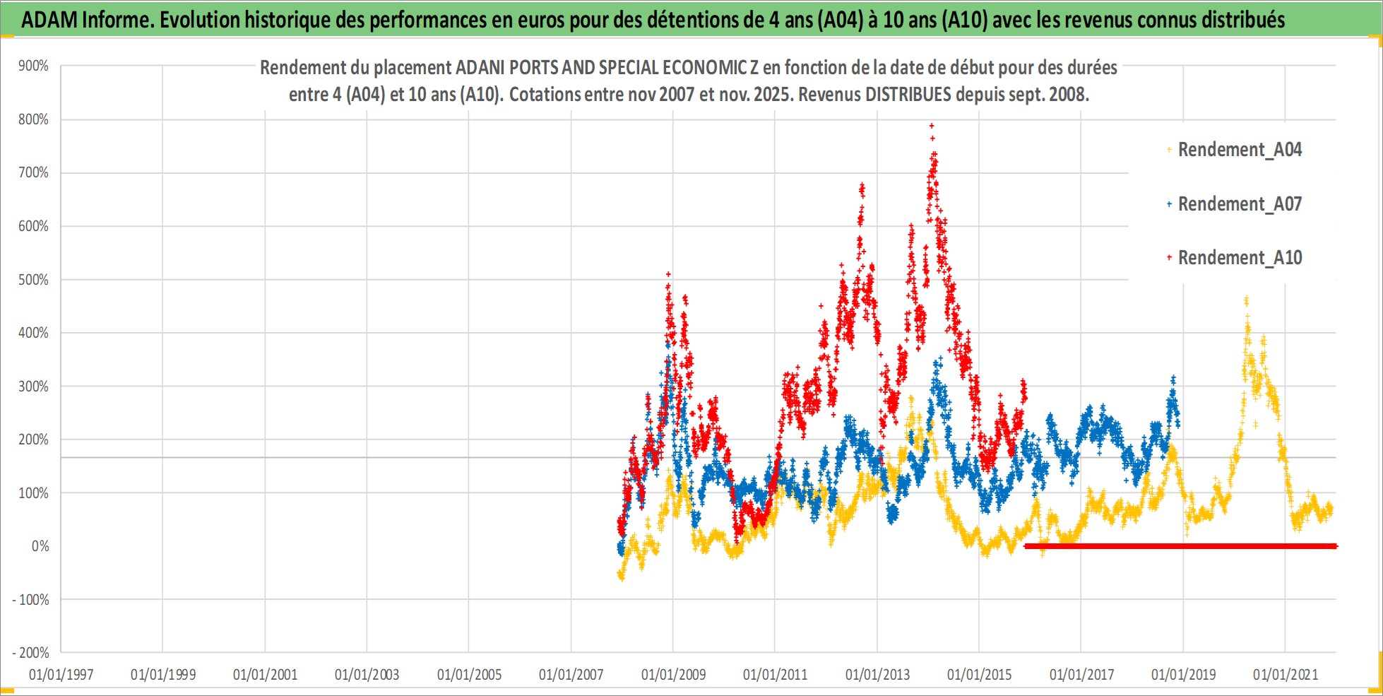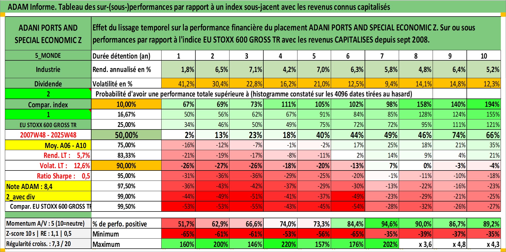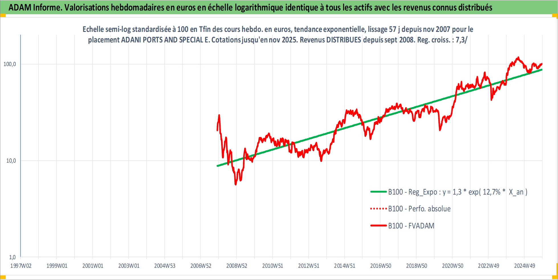 Site dédié aux investisseursPage dédiée sur site financeAnalyse des valorisations hebdomadaires de l'action ADANI PORTS AND SPECIAL ECONOMIC Z. Cet actif est cote en INR. Les valorisations sont en contrevaleur EURO et couvrent les semaines 2007W48 a 2025W48. Les revenus de cet actif financier sont pris en compte depuis la semaine 2008W37. La note globale ESG de cet actif est estimee a 15.0 (apres rebasage entre 0 et 20).