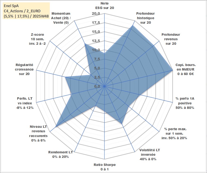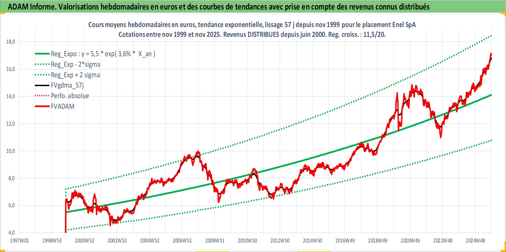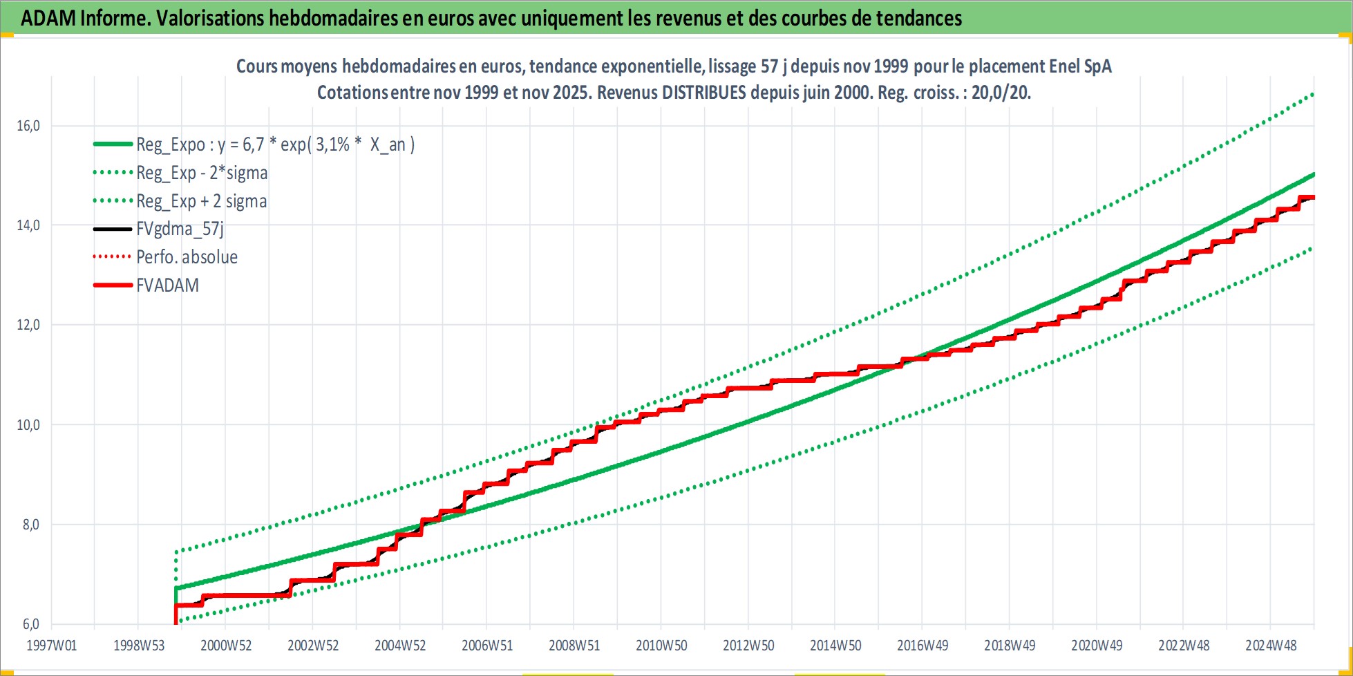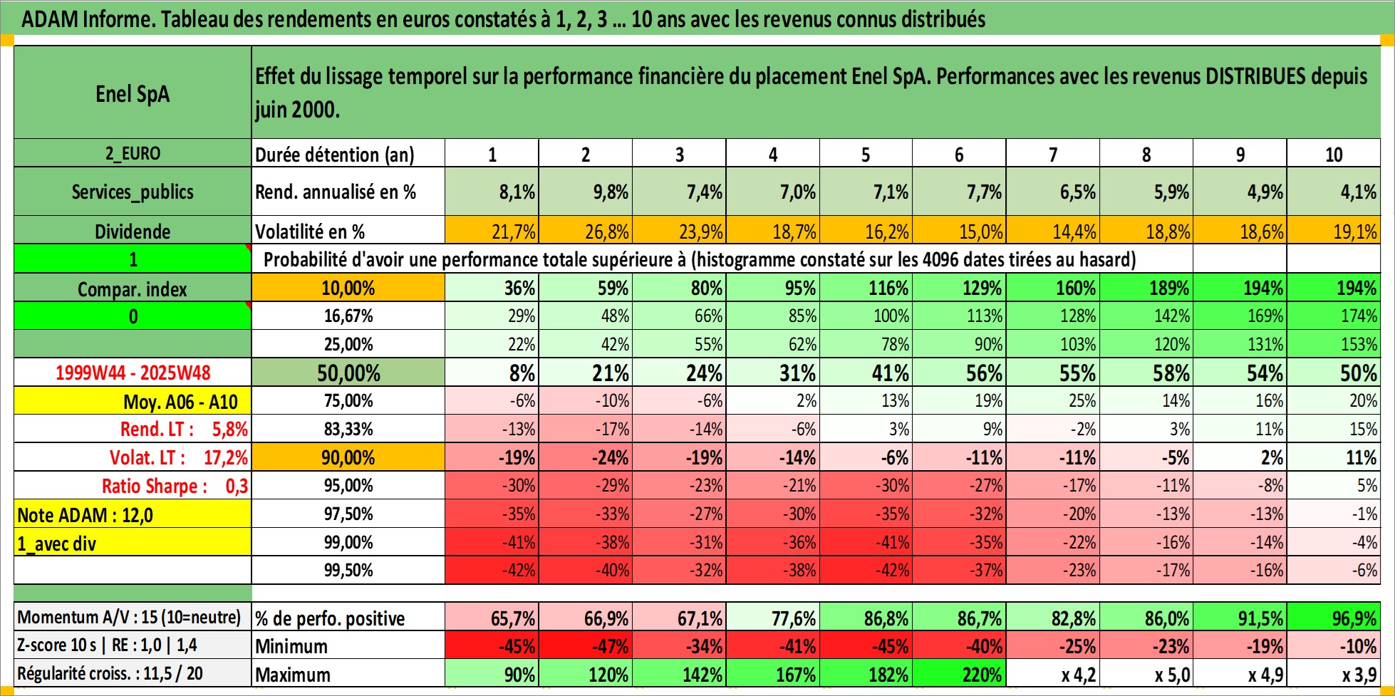 Site dédié aux investisseursPage dédiée sur site financeAnalyse des valorisations hebdomadaires de l'action Enel SpA. Cet actif est cote en EUR. Les valorisations couvrent les semaines 1999W44 a 2025W48. Les revenus de cet actif financier sont pris en compte depuis la semaine 2000W25. La note globale ESG de cet actif est estimee a 9.0 (apres rebasage entre 0 et 20).