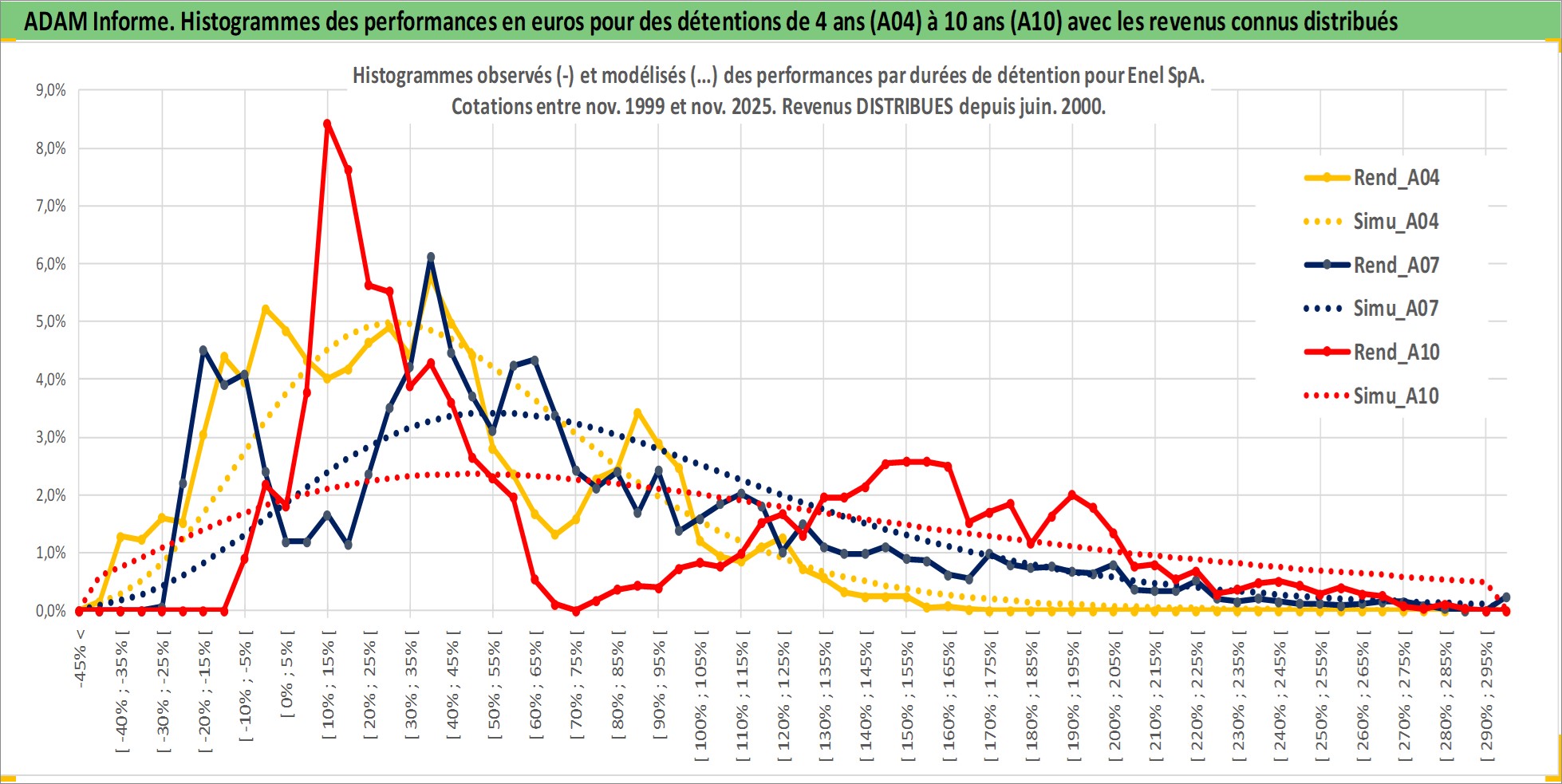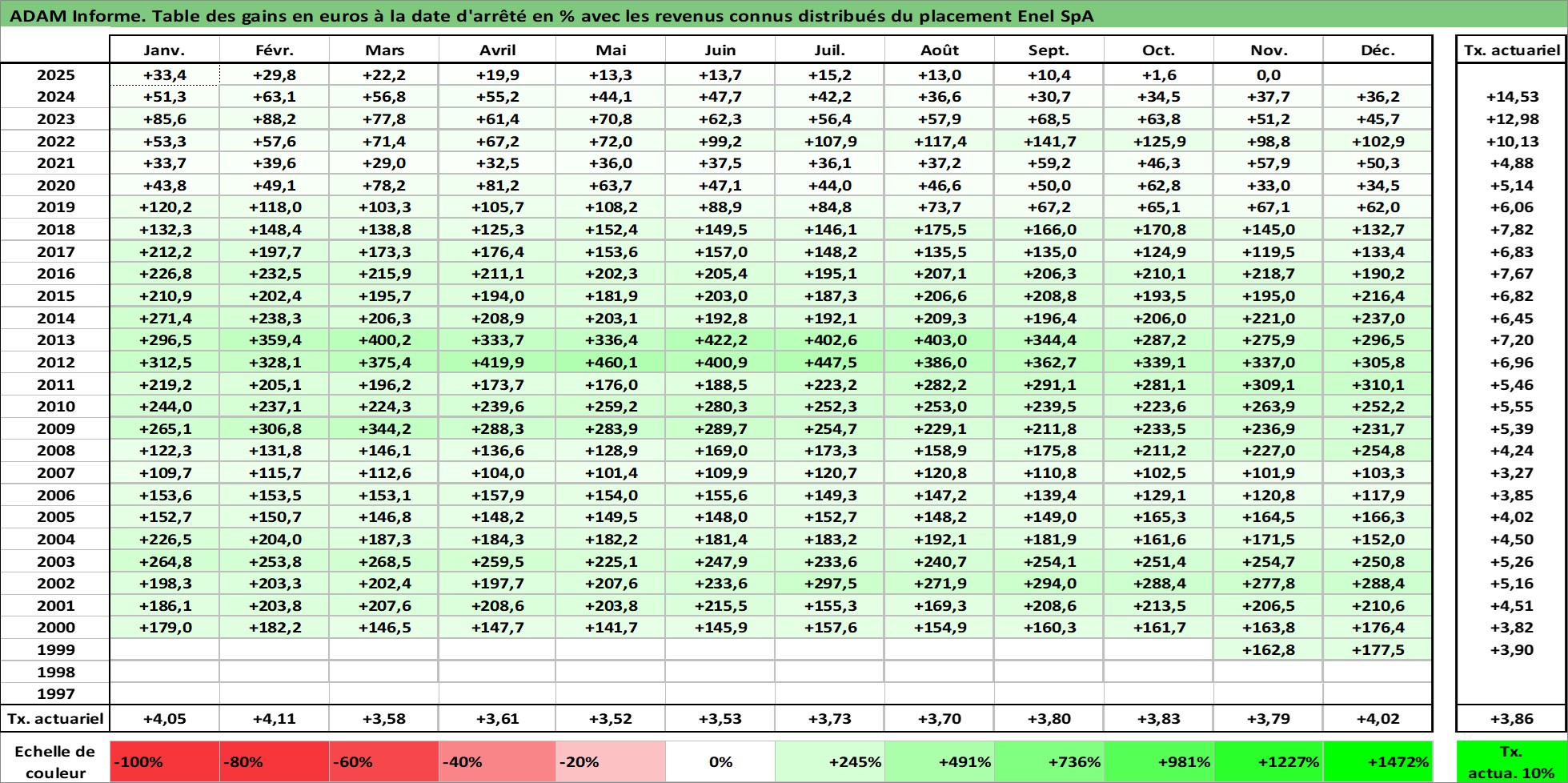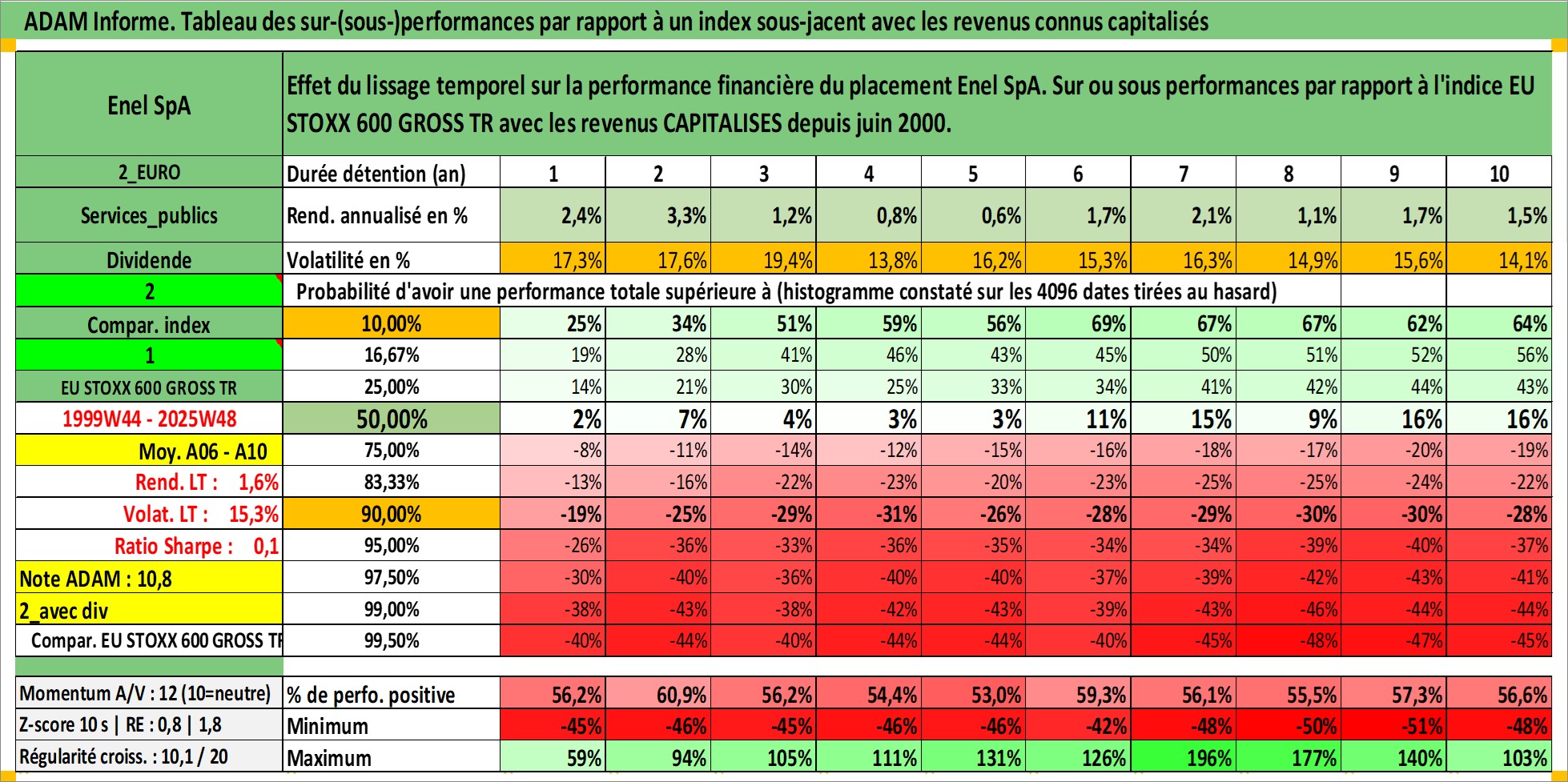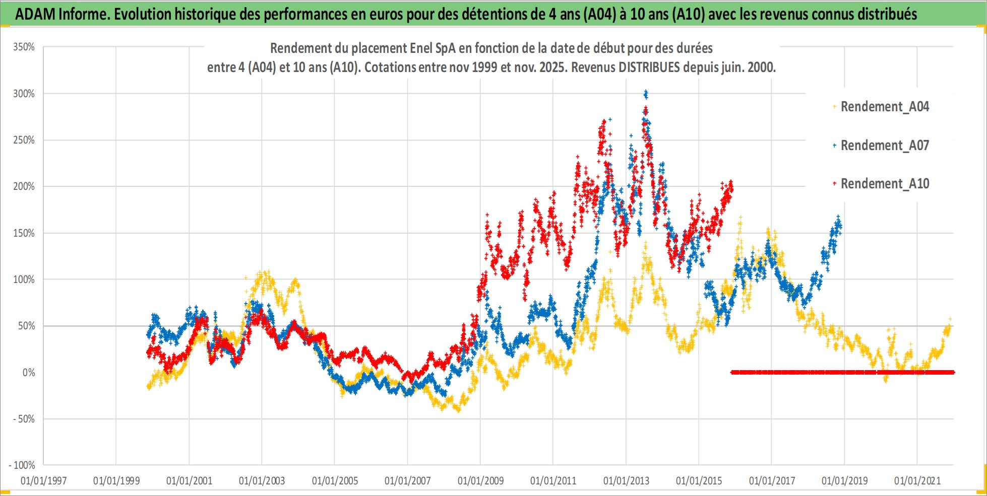 Site dédié aux investisseursPage dédiée sur site financeAnalyse des valorisations hebdomadaires de l'action Enel SpA. Cet actif est cote en EUR. Les valorisations couvrent les semaines 1999W44 a 2025W48. Les revenus de cet actif financier sont pris en compte depuis la semaine 2000W25. La note globale ESG de cet actif est estimee a 9.0 (apres rebasage entre 0 et 20).